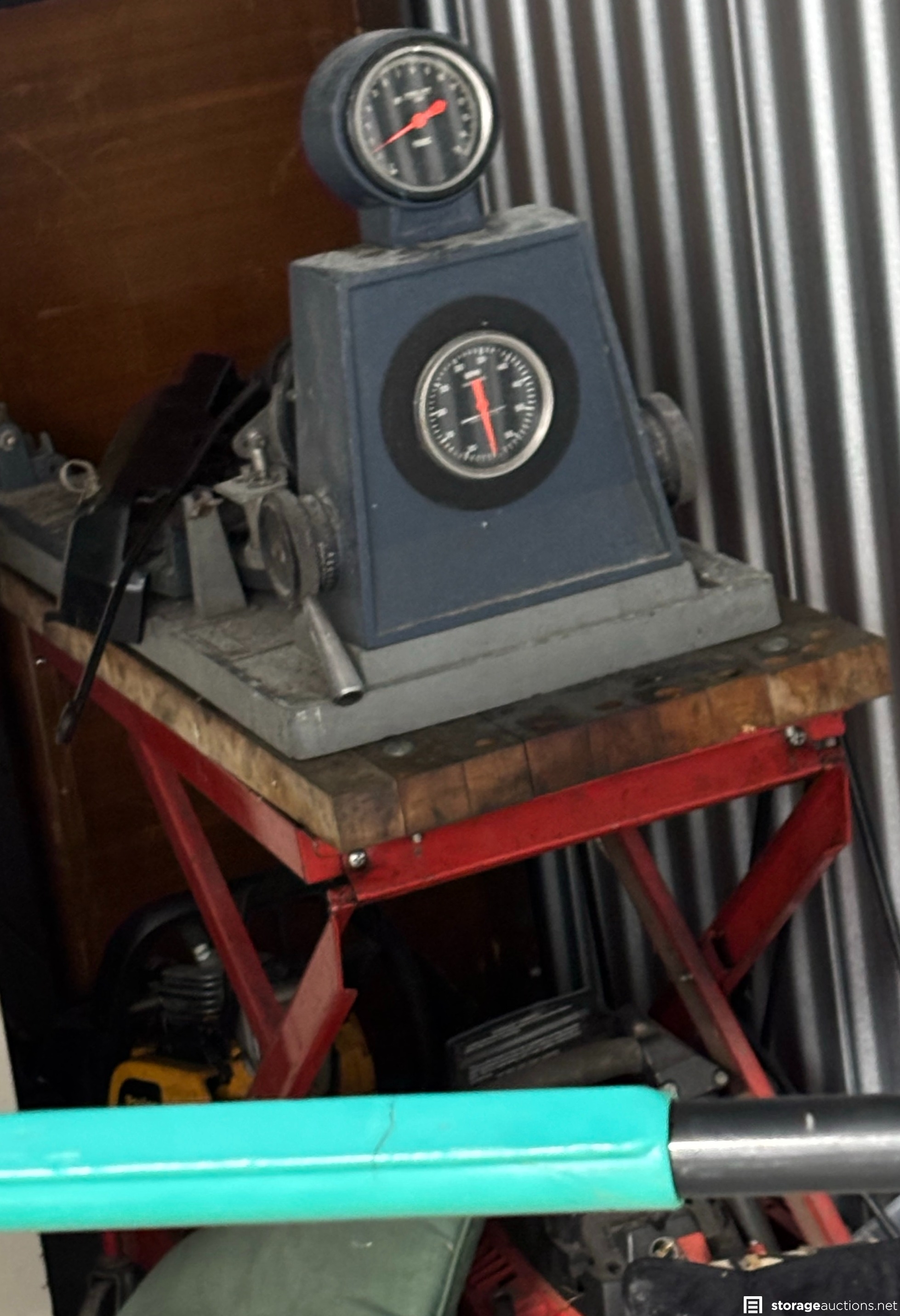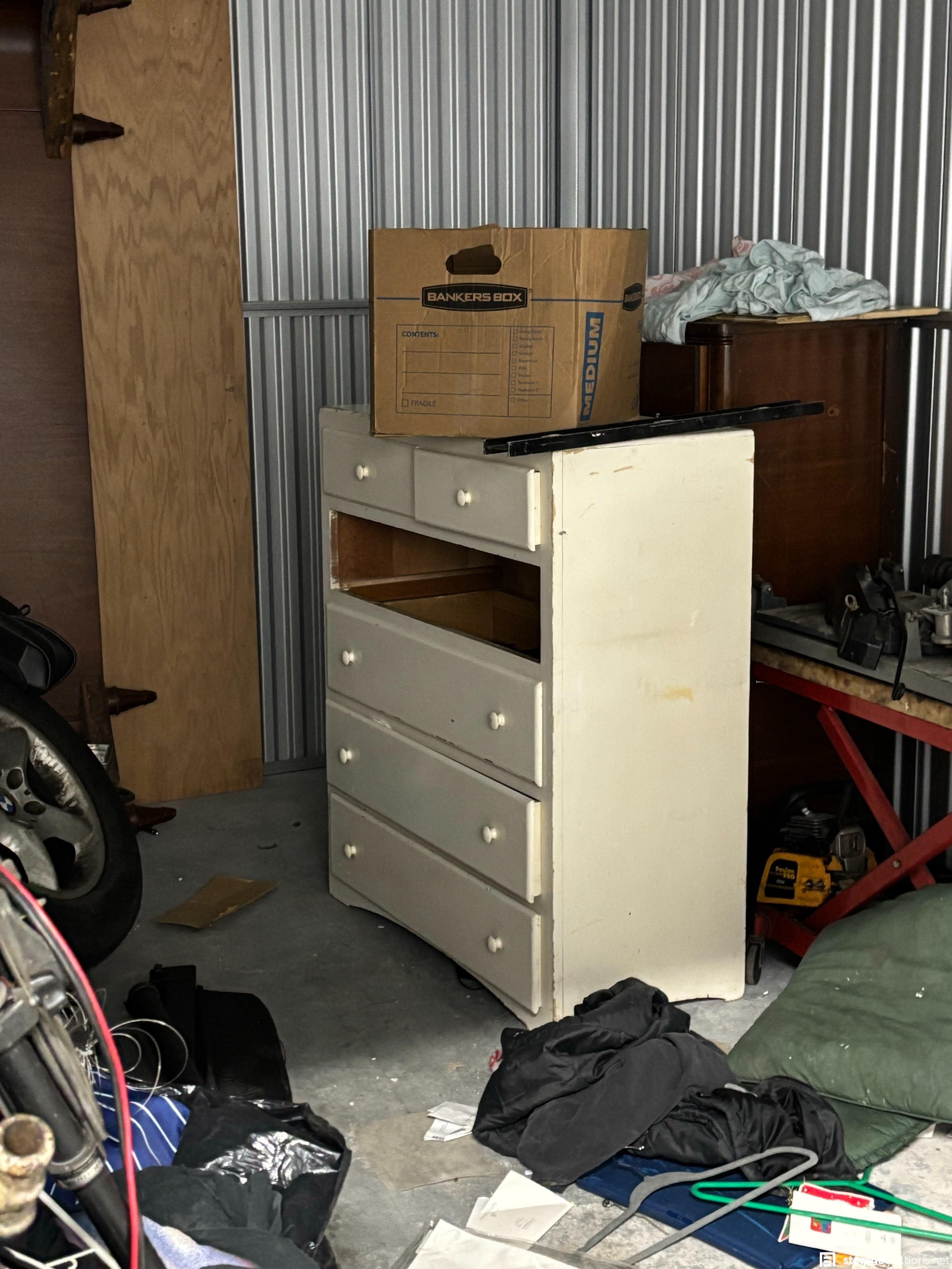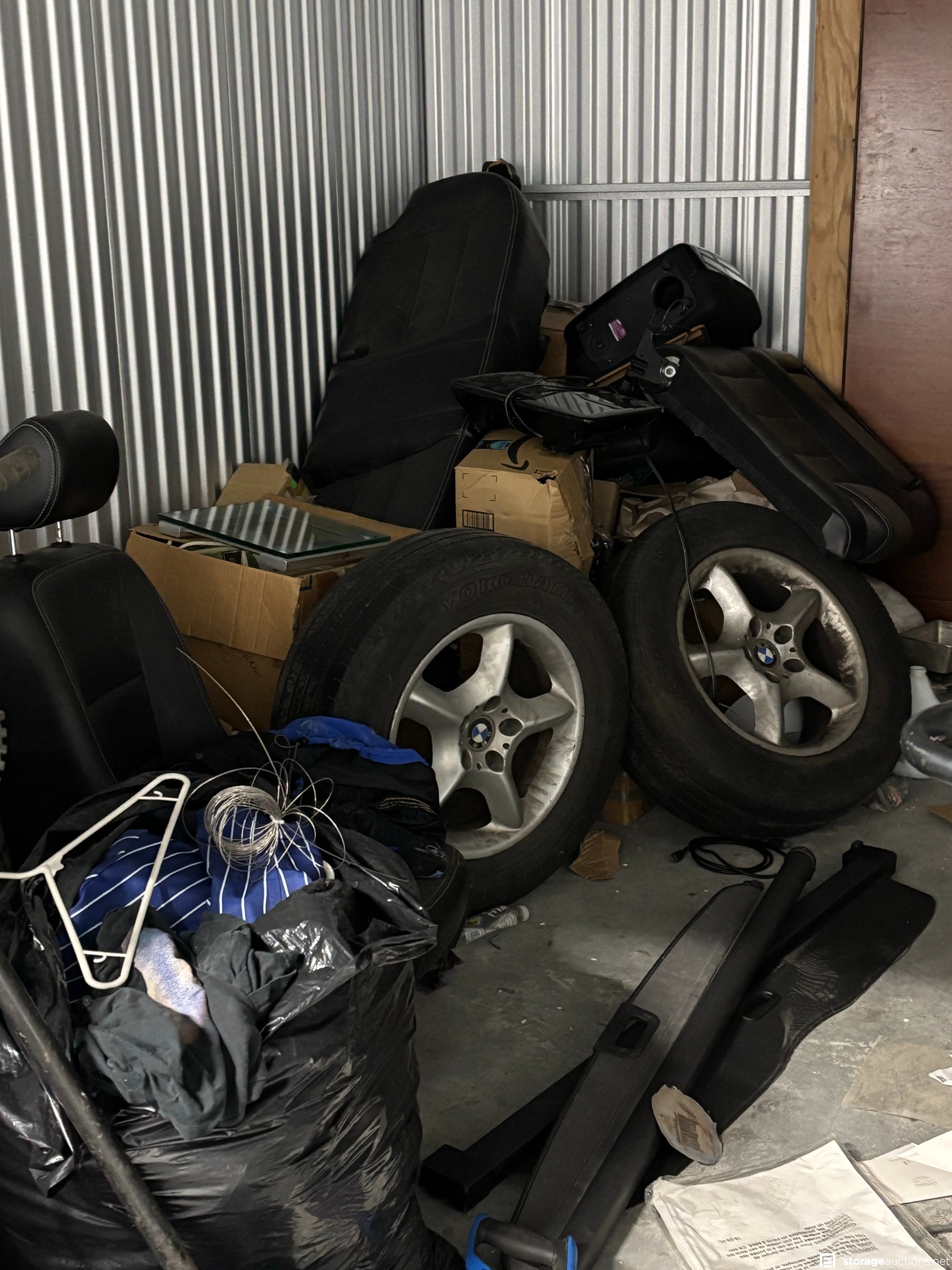 Appears to be, car parts, tires, dresser, boxes, tools, tool box