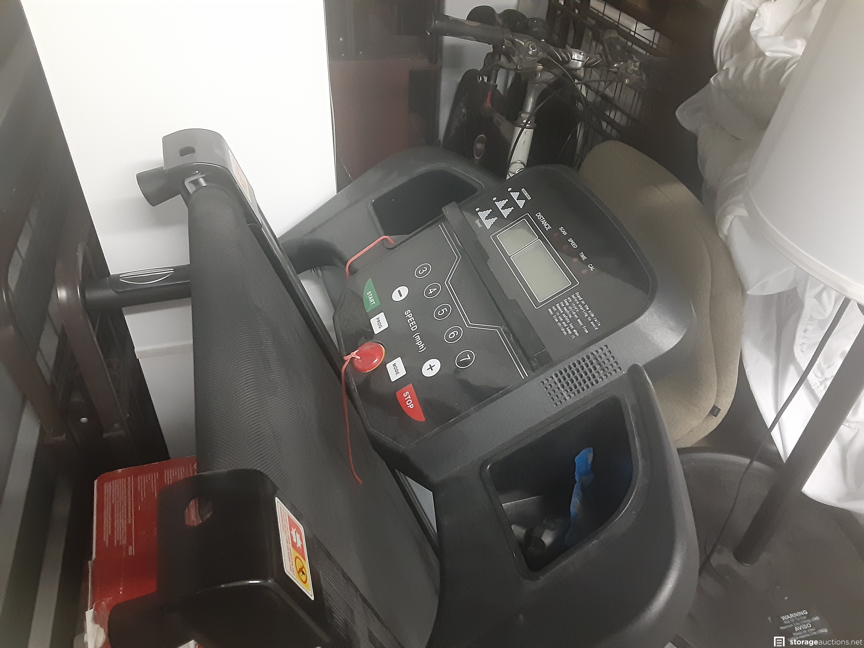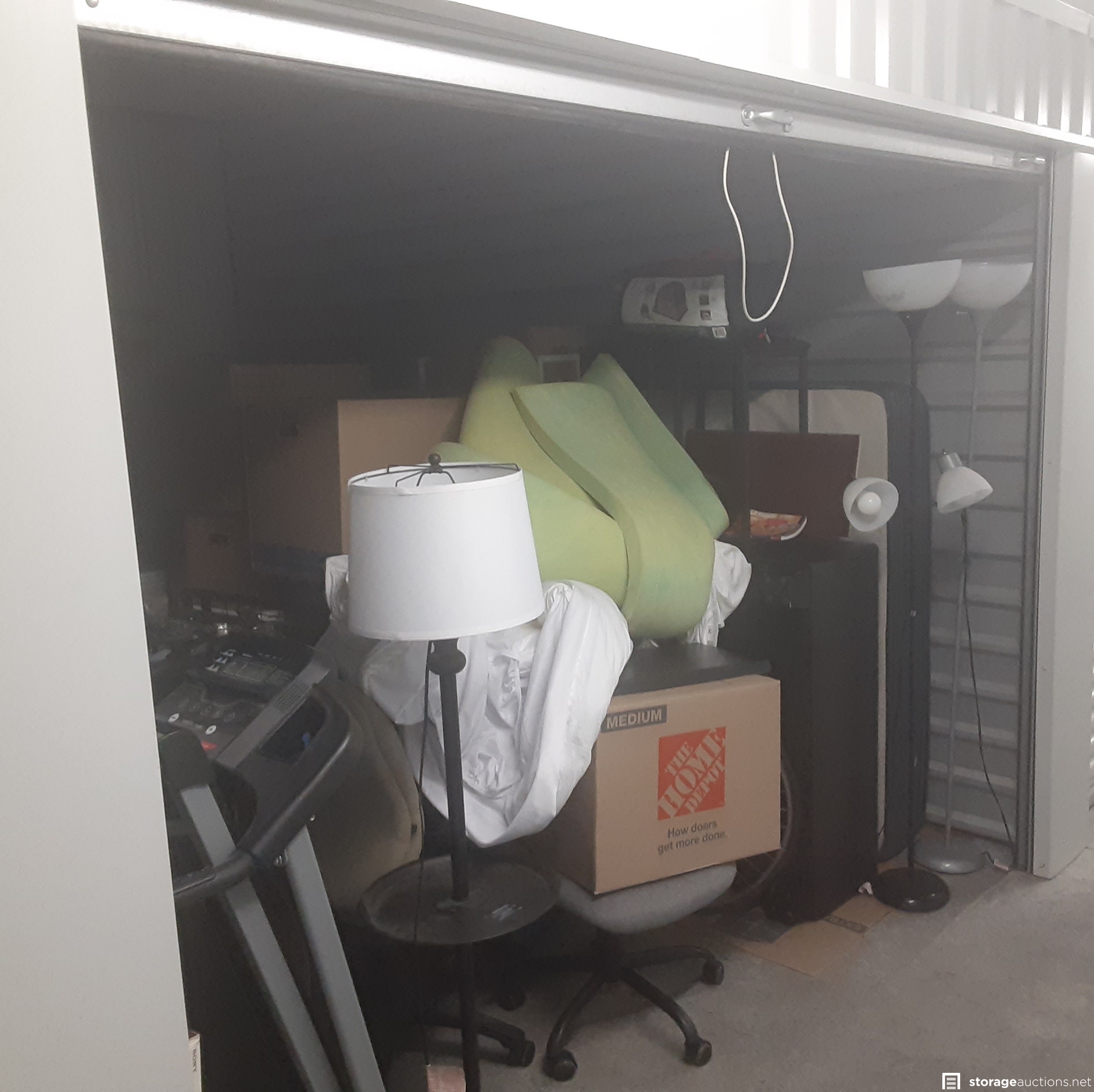 Lamps, mattress pads, office chairs, treadmill, furniture, tent, boxes, box spring, bicycles, washer, dryer, PlayStation 3, shelves, Christmas tree, cooler, snow shovel, fans, chalkboard, miscellaneous items.