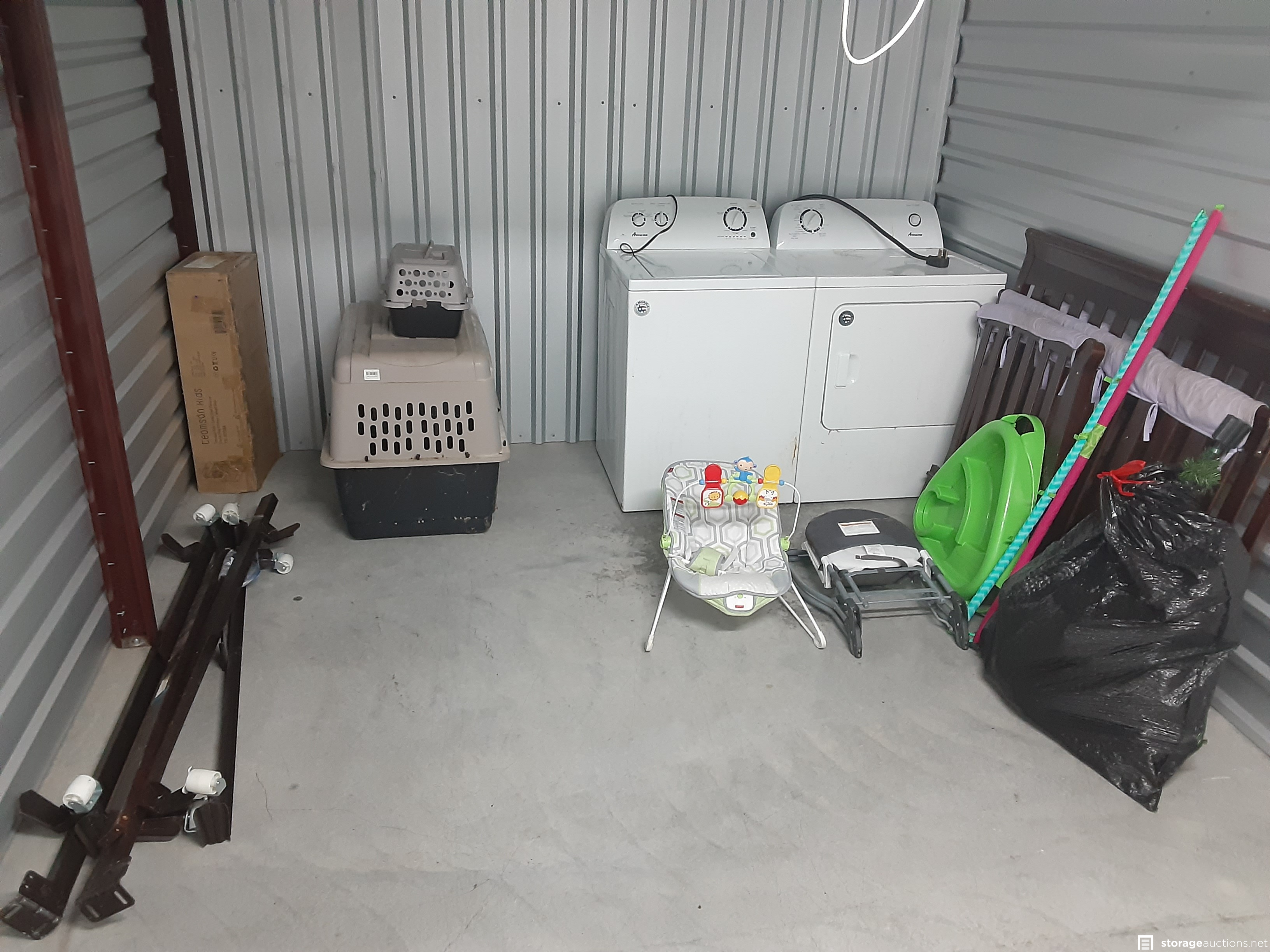 Bed rails, box, 2 pet carriers, Amana washer & dryer, kid's bouncer seat & high chair & crib & Christmas tree.