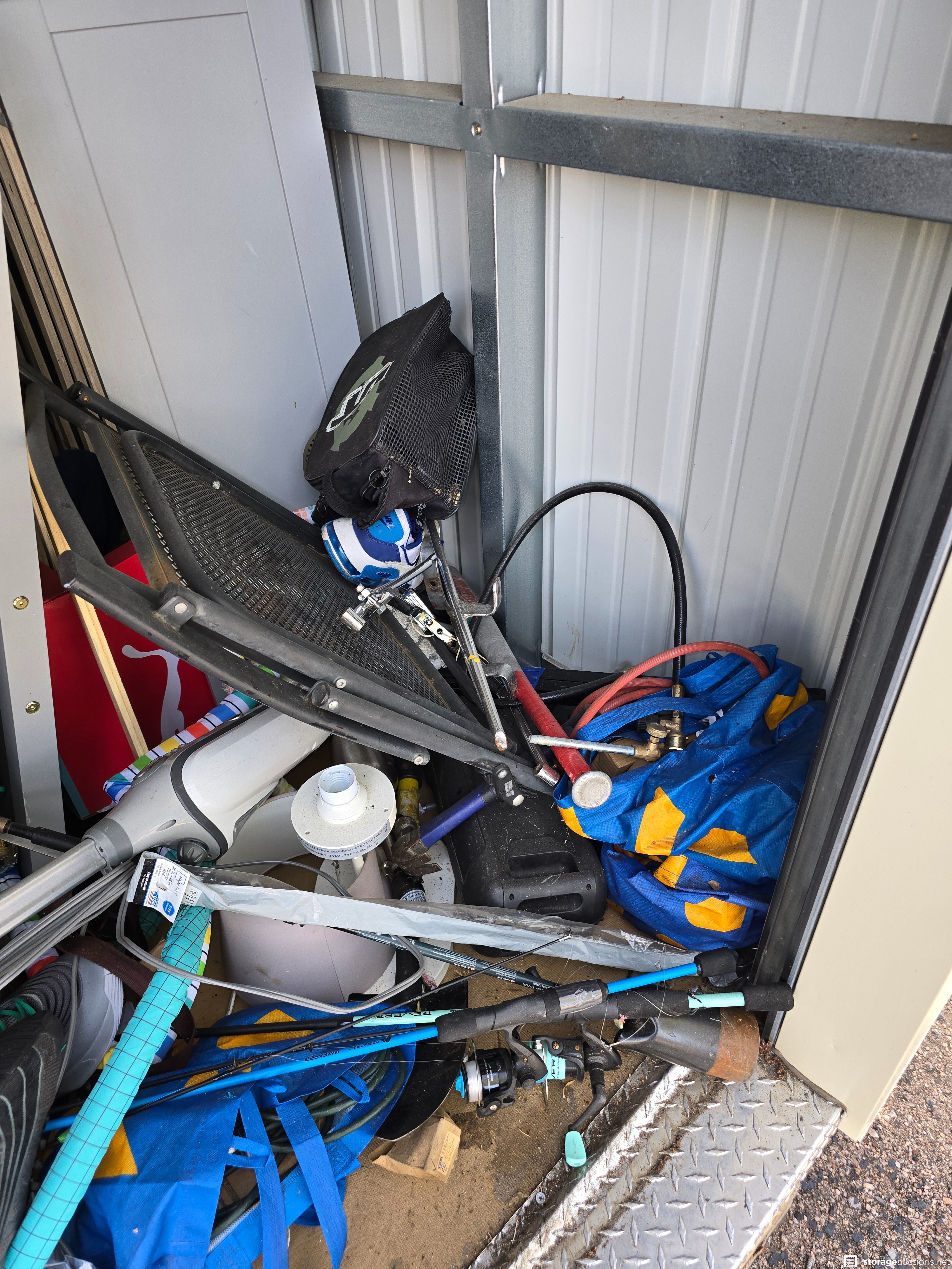 Various household items. Bed, chair, allowance, tools, fighing poles. Various storage containers with unknown contents.