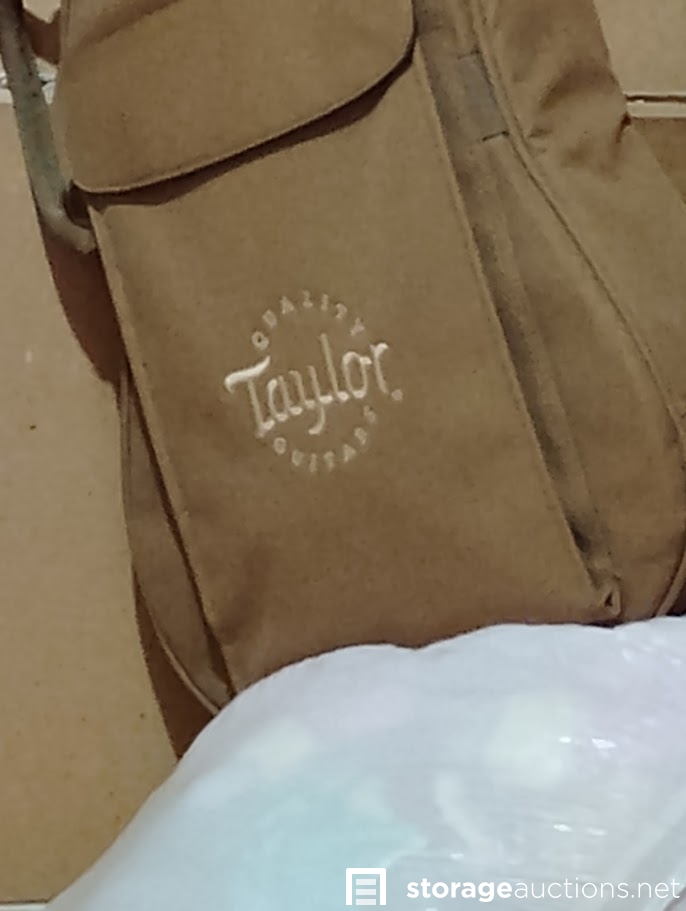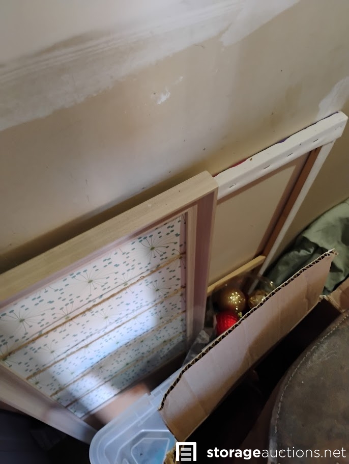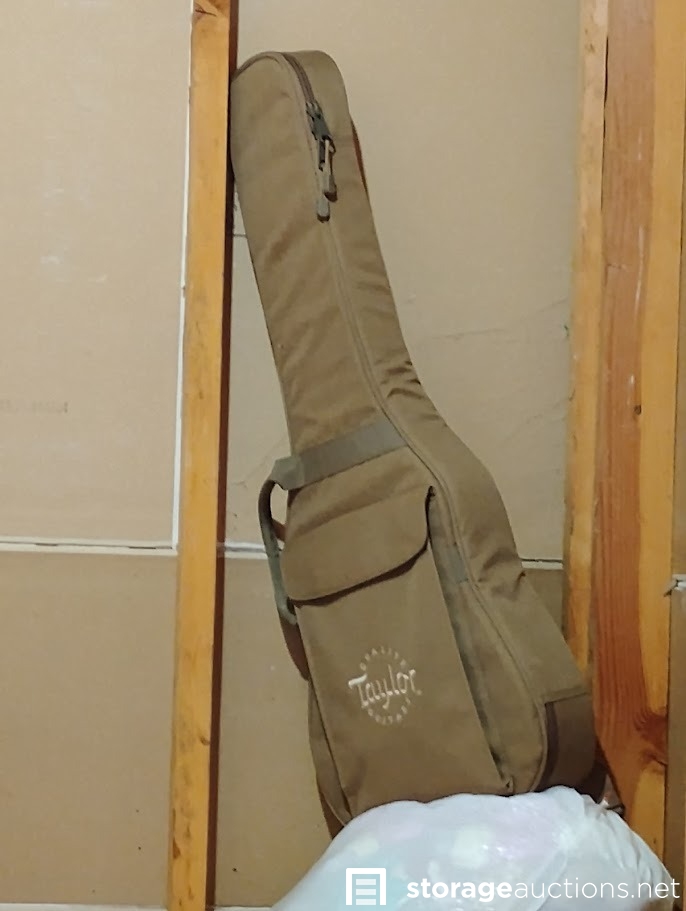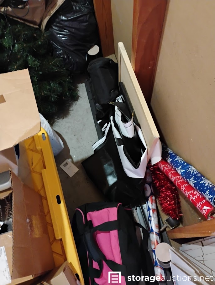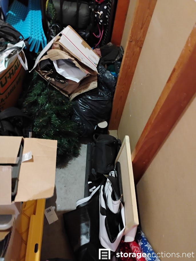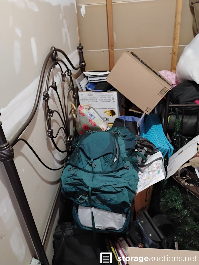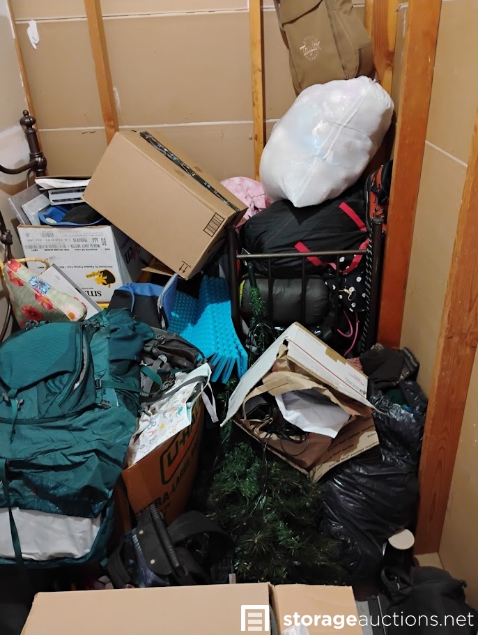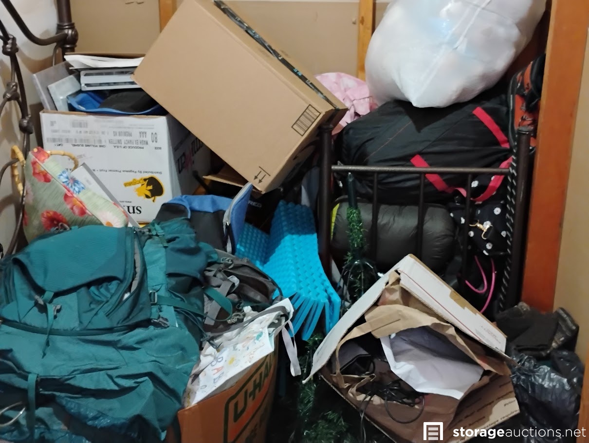 Various totes, boxes and bags of belongings, wall hangings, leather boots, shoes, camping gear(?), sleeping bags, backpack(s?), travel bags, mailing boxes, Christmas decorations, holiday wrapping paper, artificial Christmas tree, metal headboard/footboard/bedframe, Taylor Quality Guitars bag - with guitar(?).