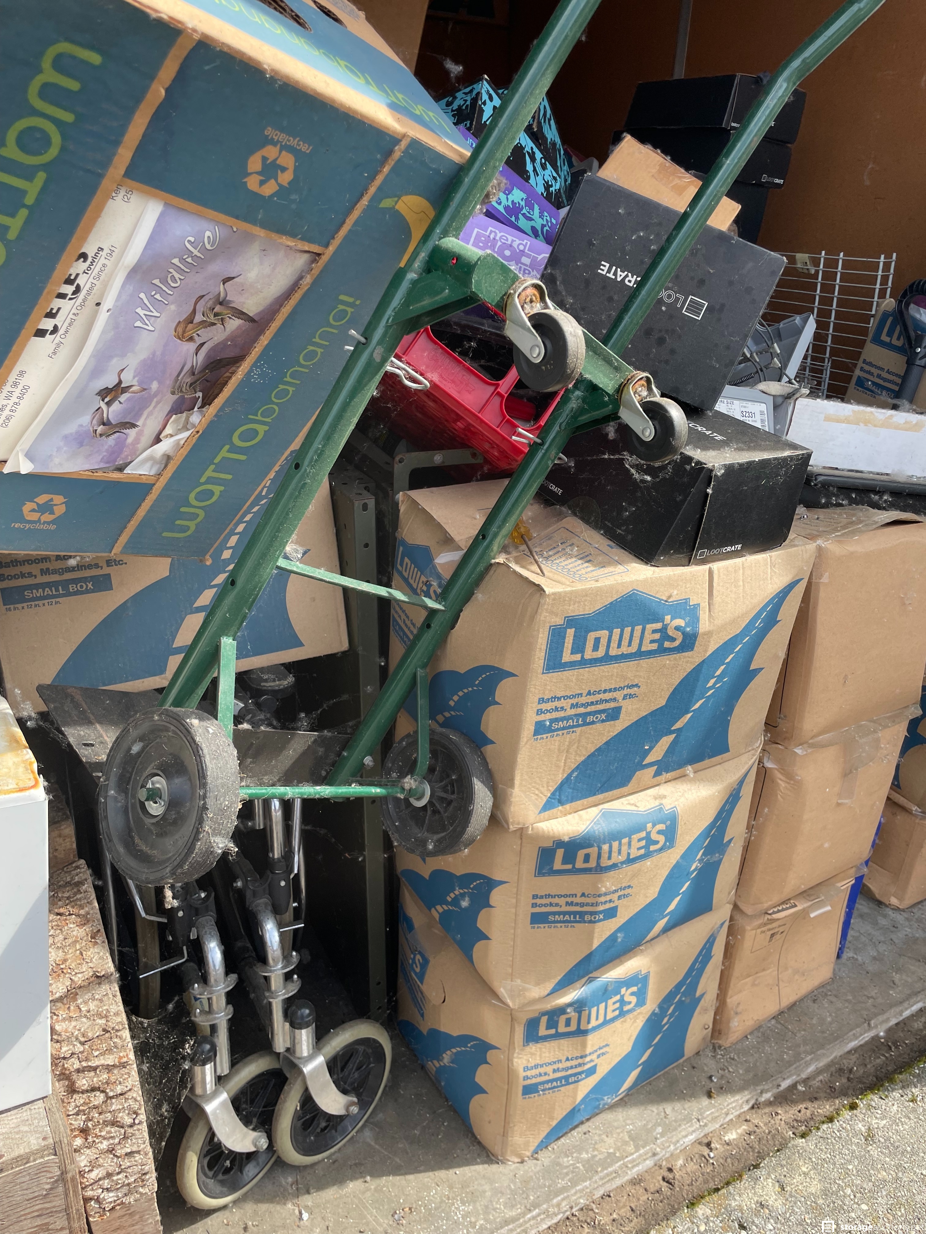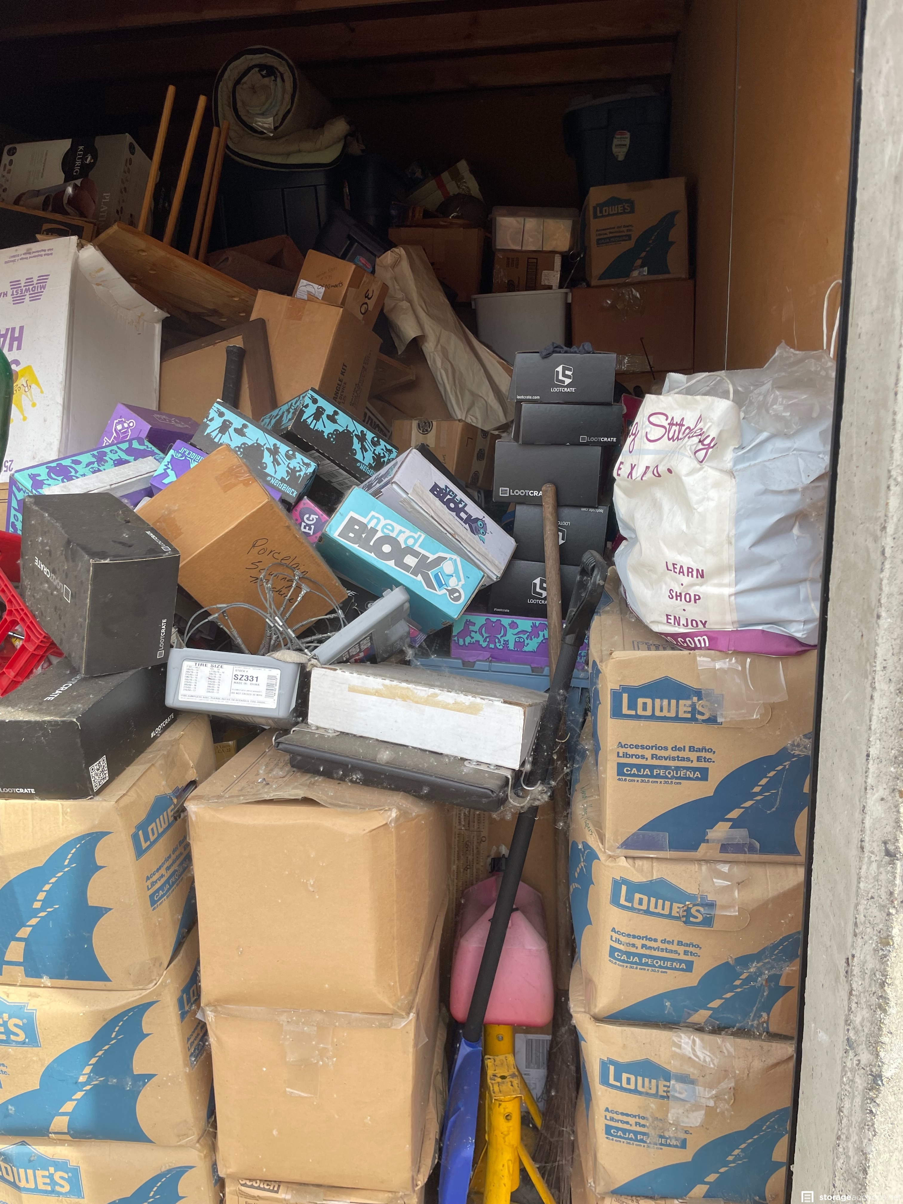 boxes, loot crate boxes, sci-fi block boxes, totes, camping equipment, Barbies, shovels, gas can, automotive equipment, appliances, decor, fishing poles