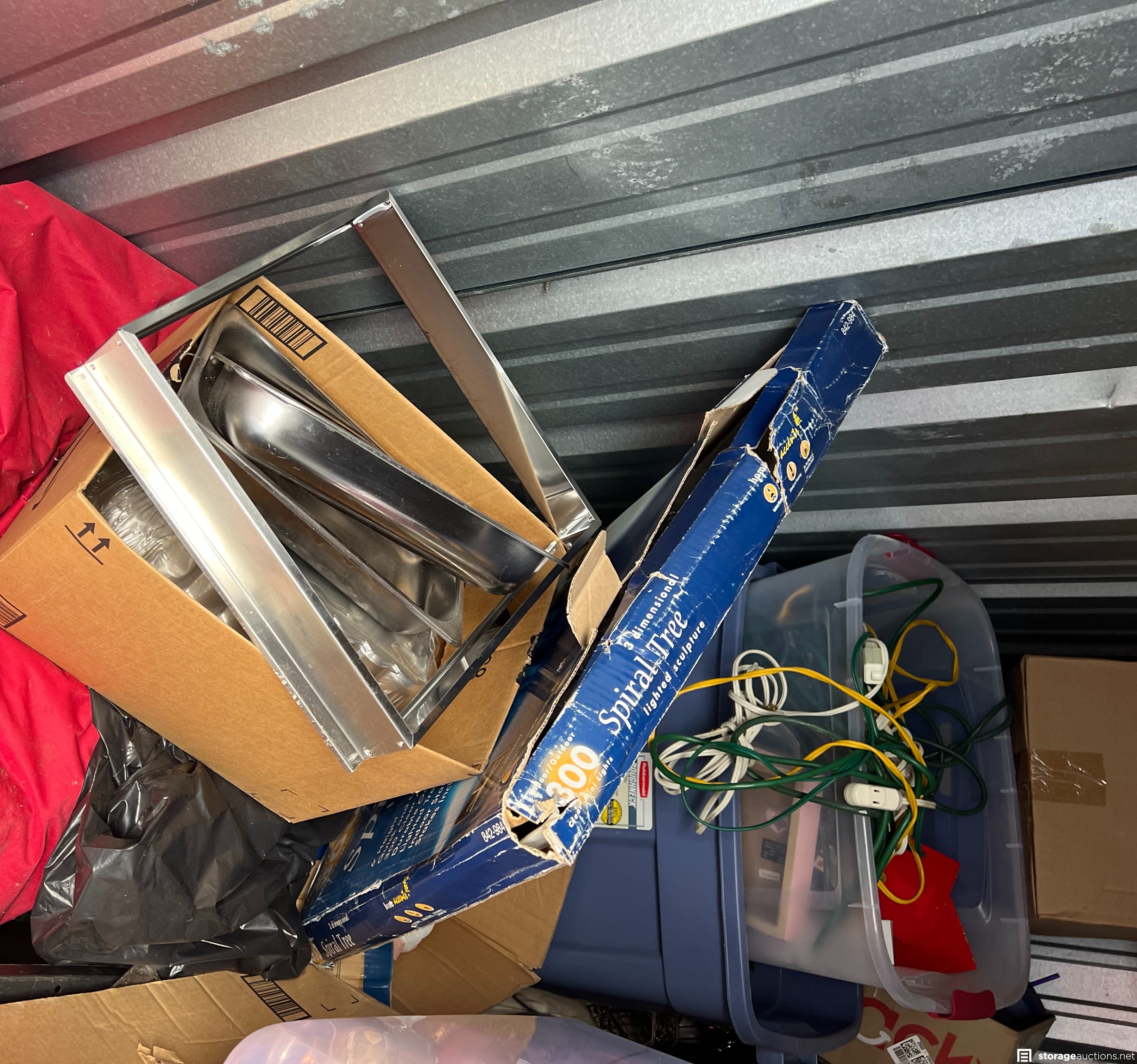 Christmas is here! Good quality decorations, some hotel-level pans/hot holding equipment for hosting large parties, plenty of extension cords. Boxes and totes with who-knows-how-good more to find!