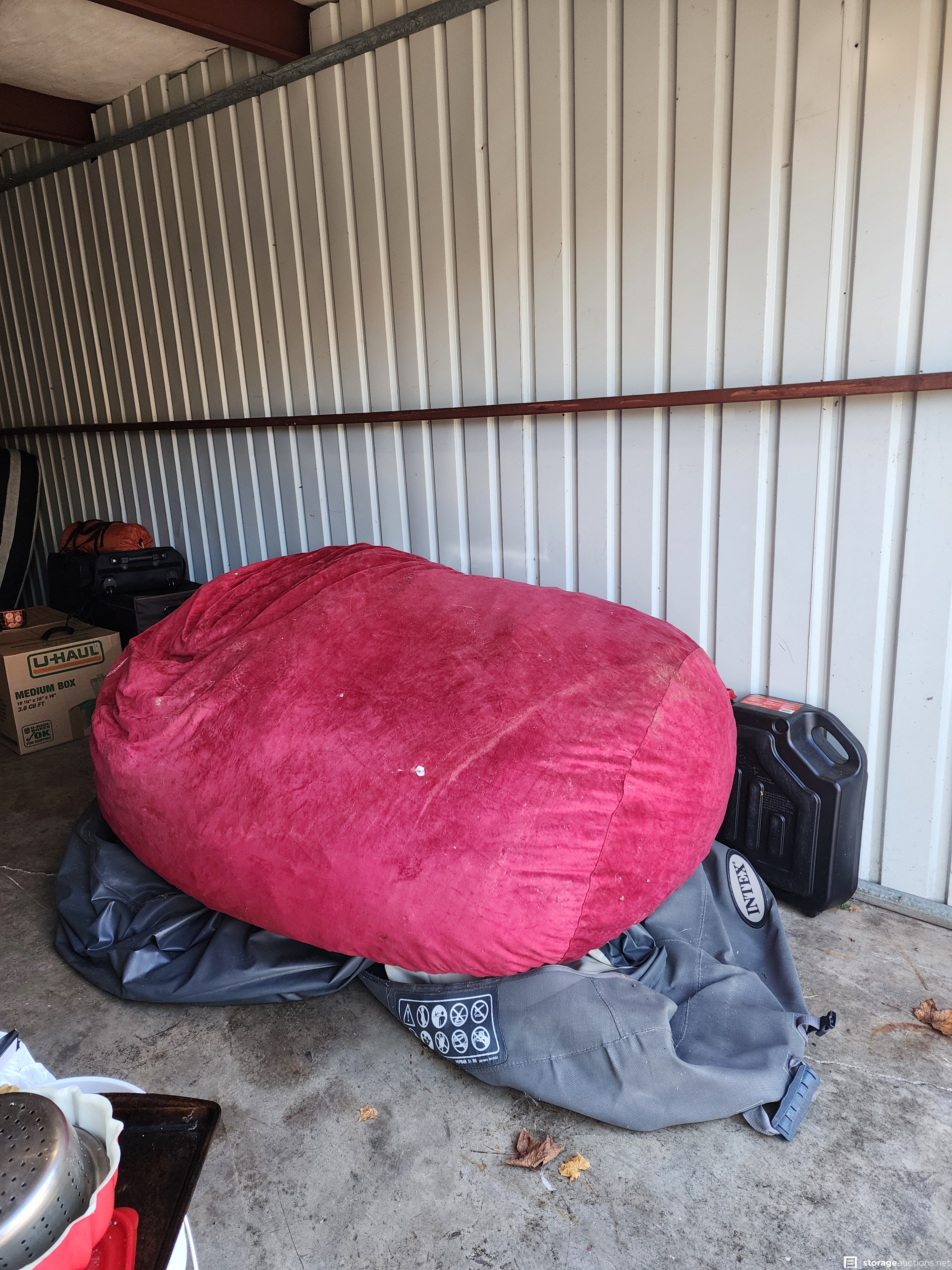 Couch, bean bag chair, shelves, Boxes, buckets, kitchen items