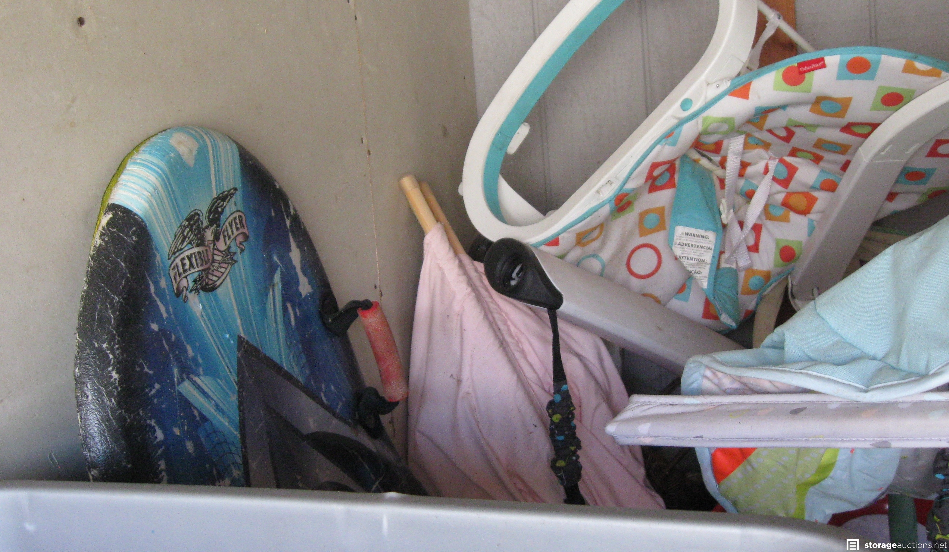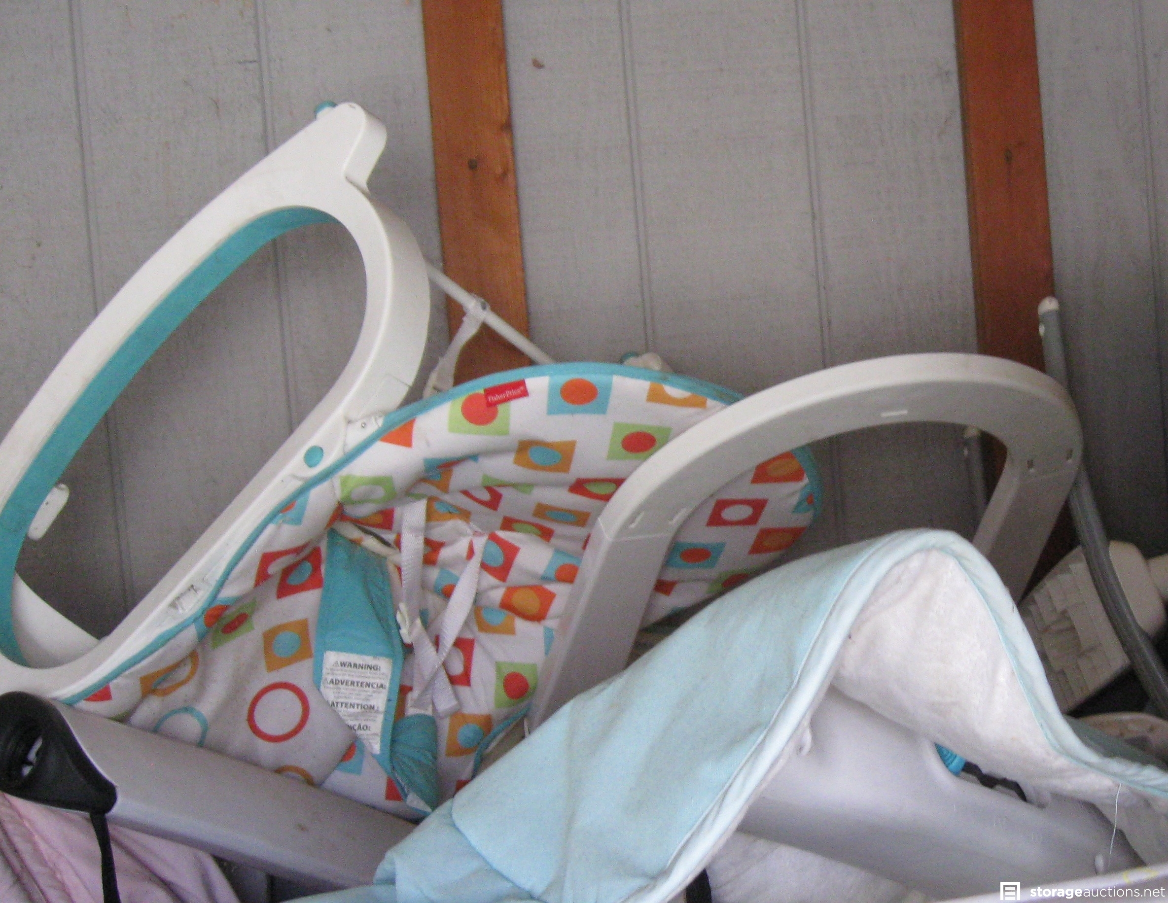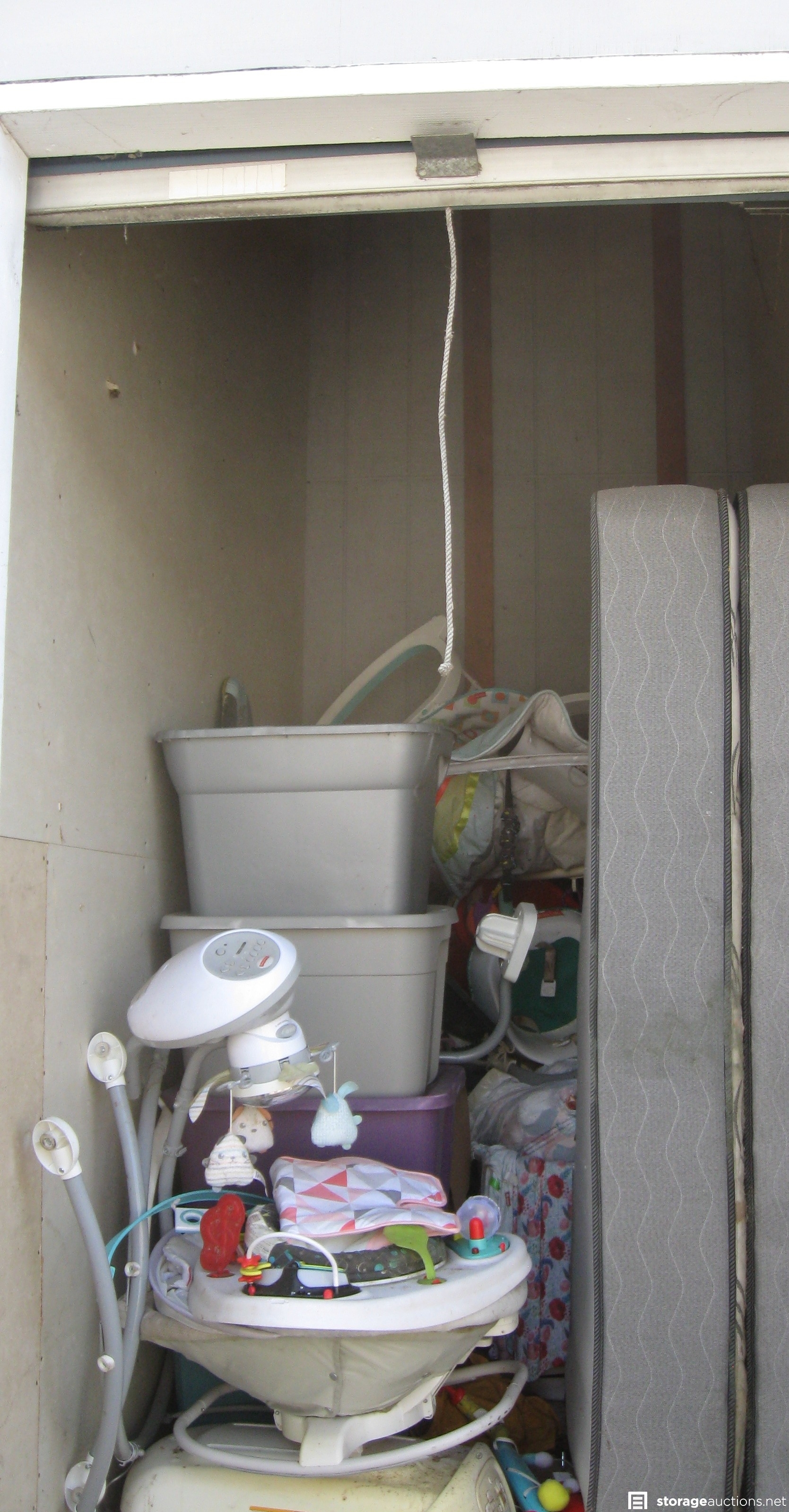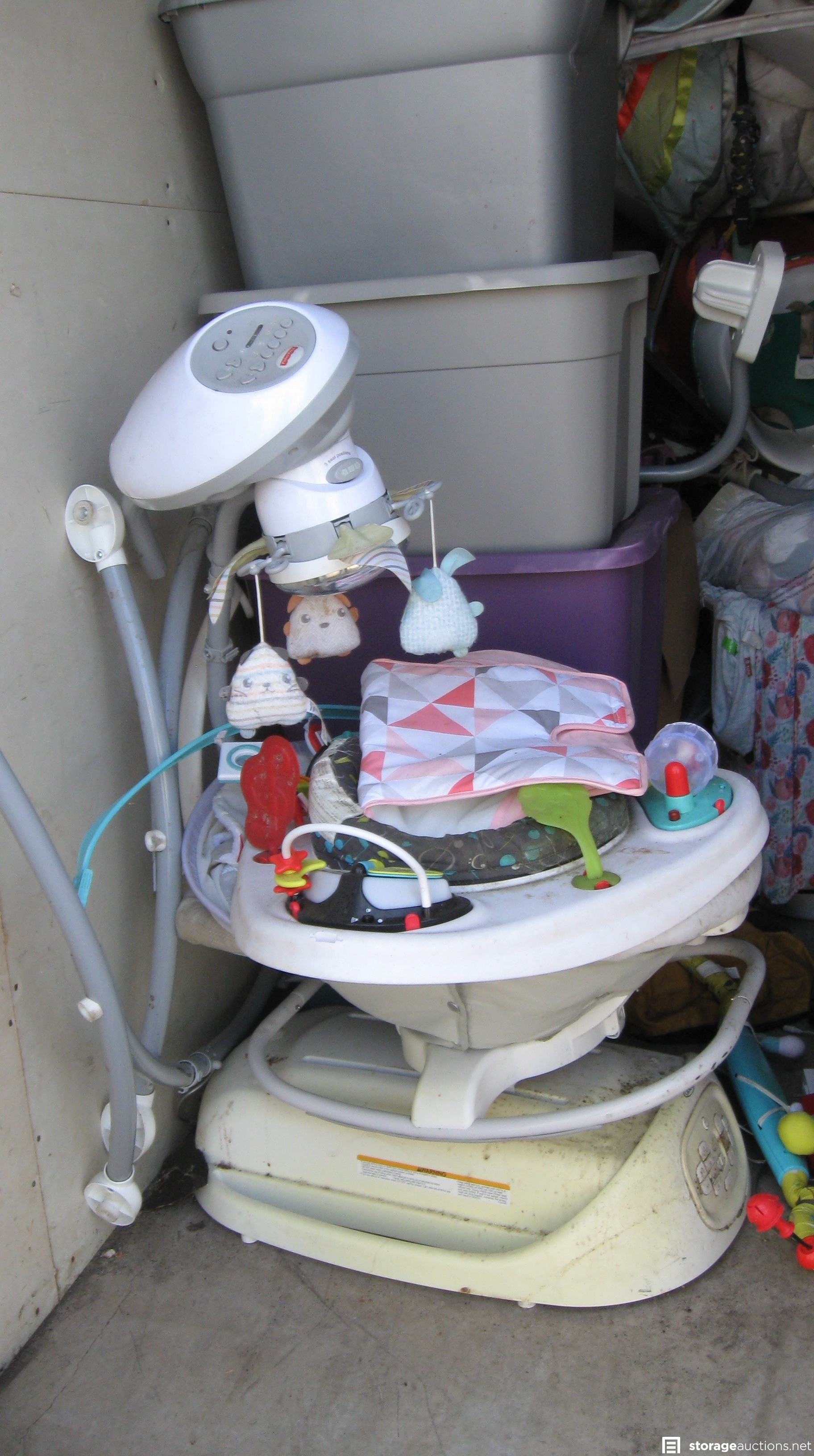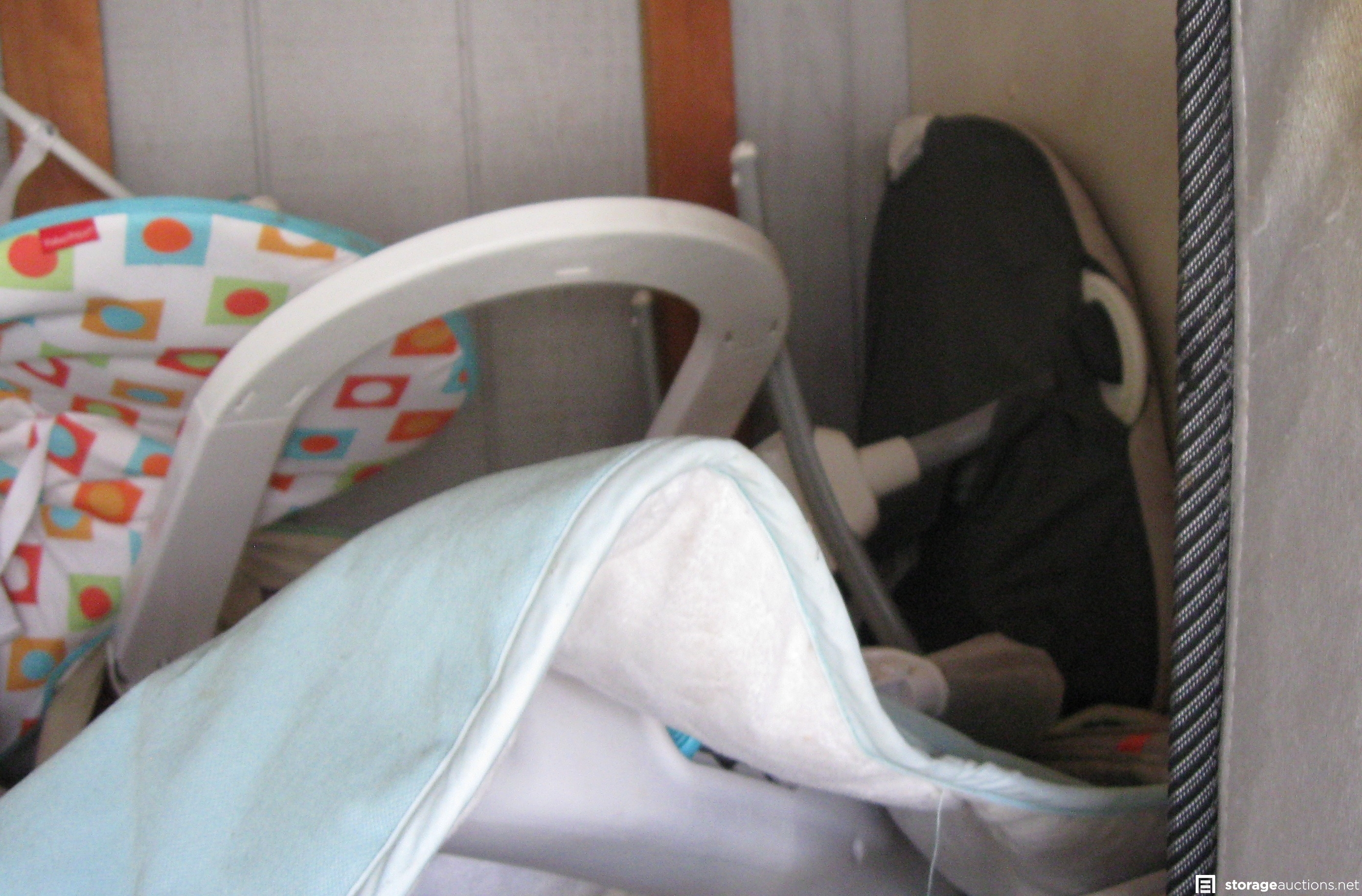 Unit appears to contain, totes, baby swing, walker, bed, baby items