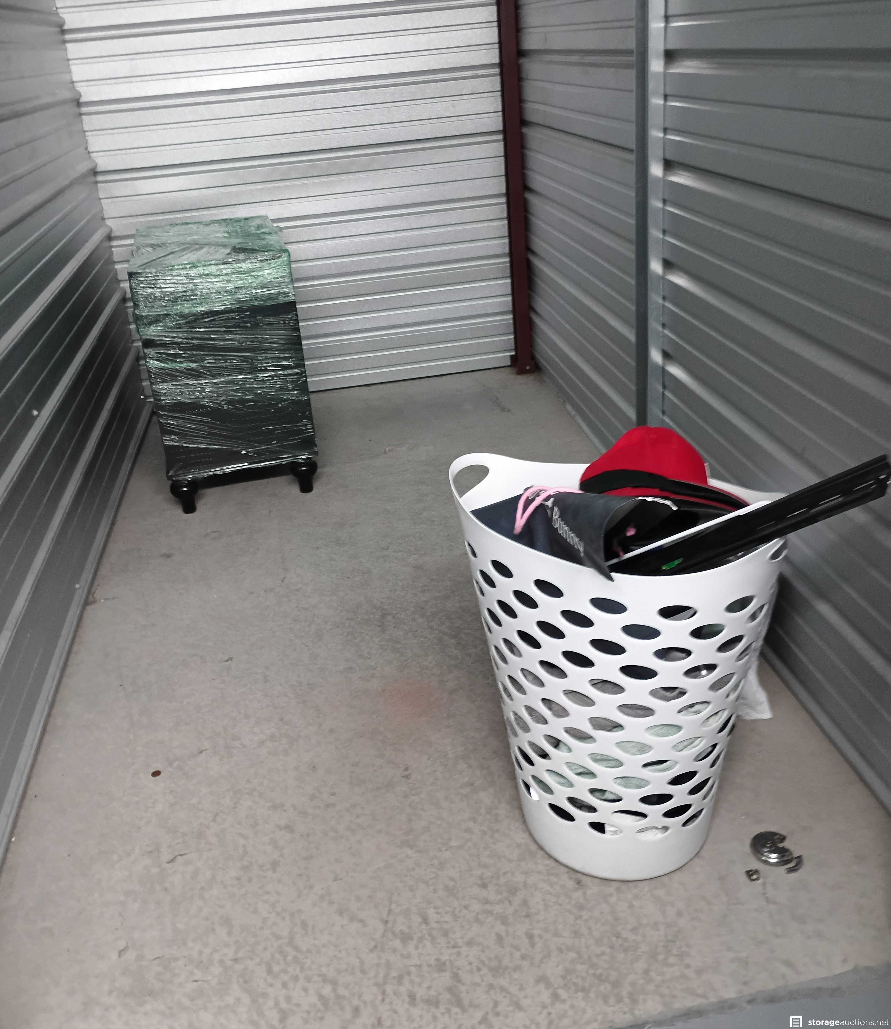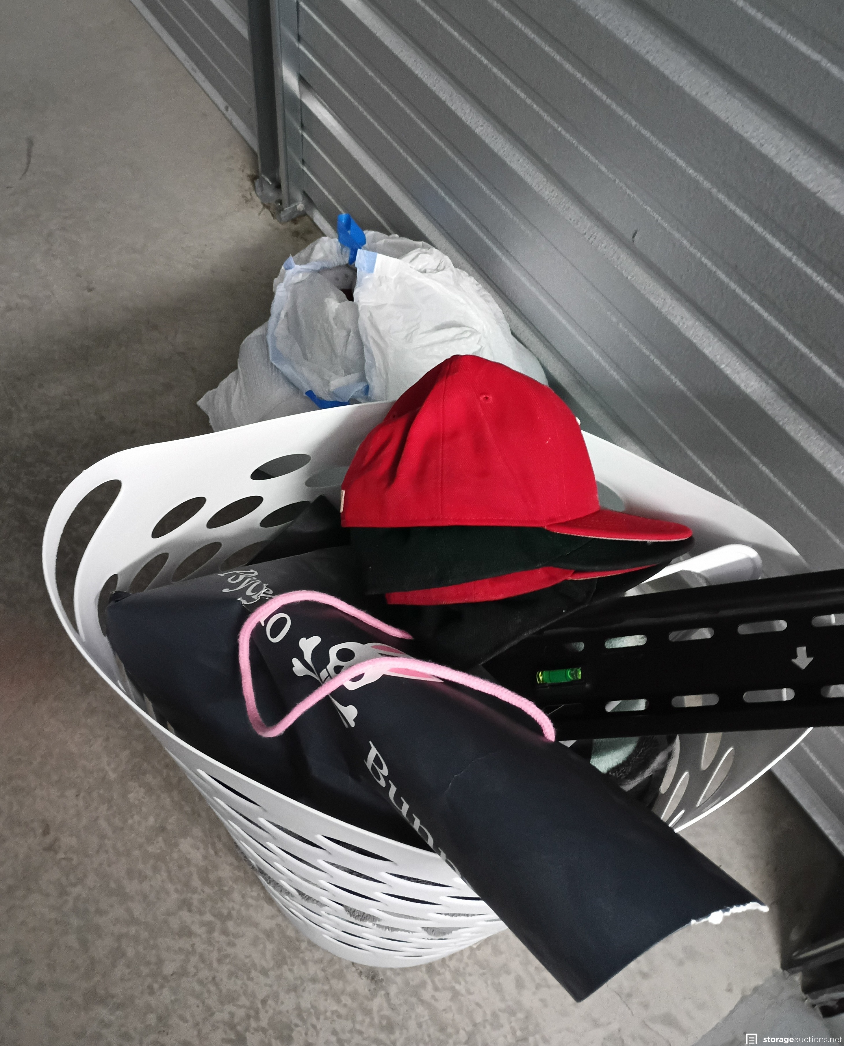 This Unit Contains: a nightstand, laundry basket full of towels and misc. items, and a trash bag of shoes