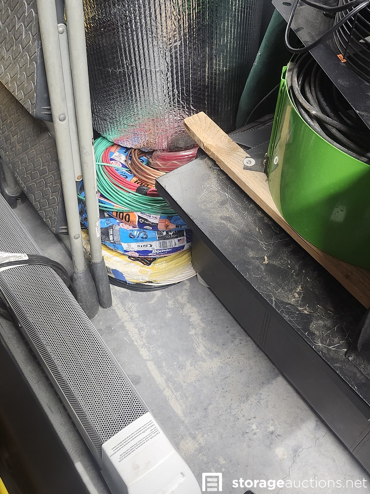 Unit appears to contain: 11 new totes, 6 totes, contractor bags, copper wire, wire, padded Mylar, electrician tools, printer, 3 industrial fans, duffle bag, back, pack 10+ bags, 11+ boxes, ladder, and wall art.