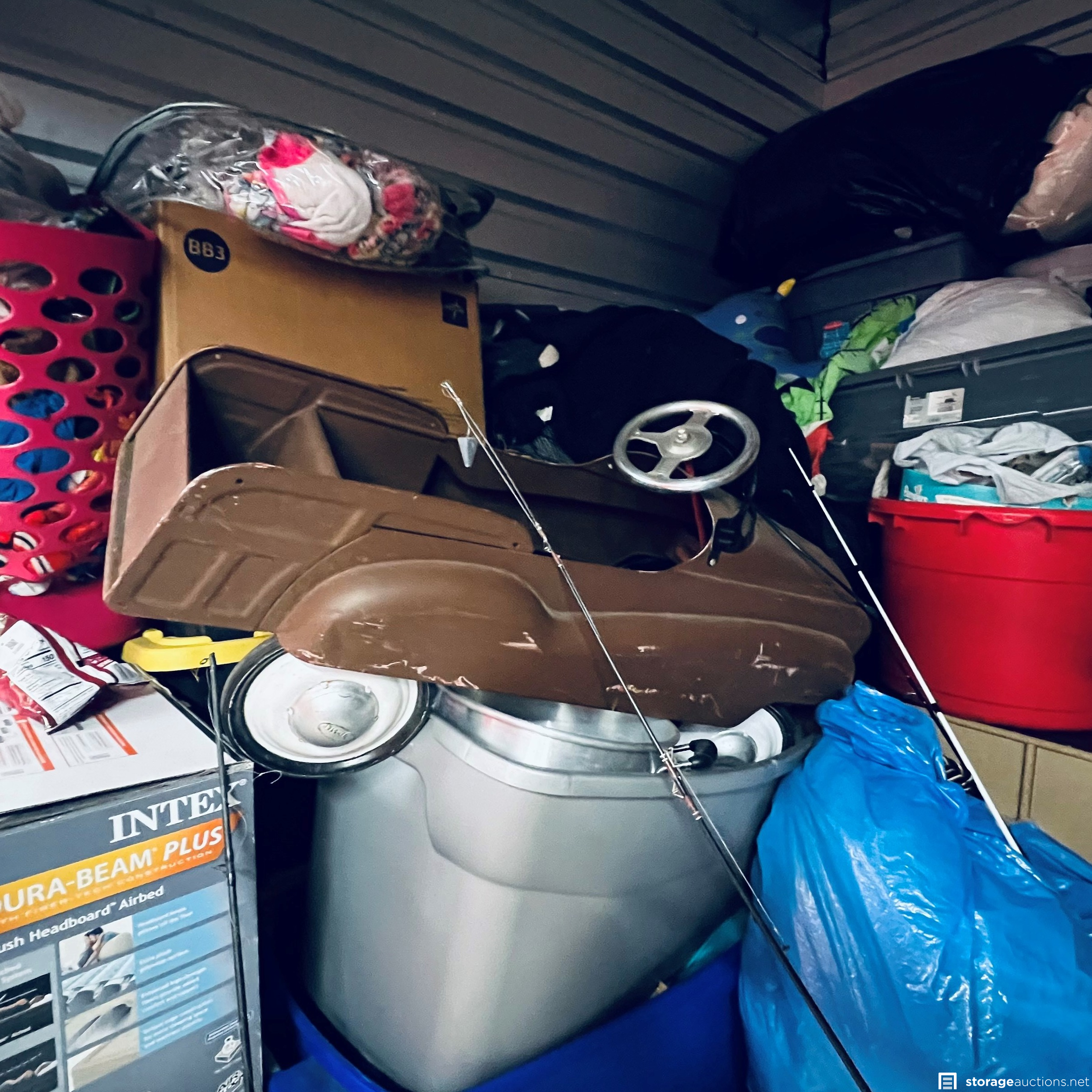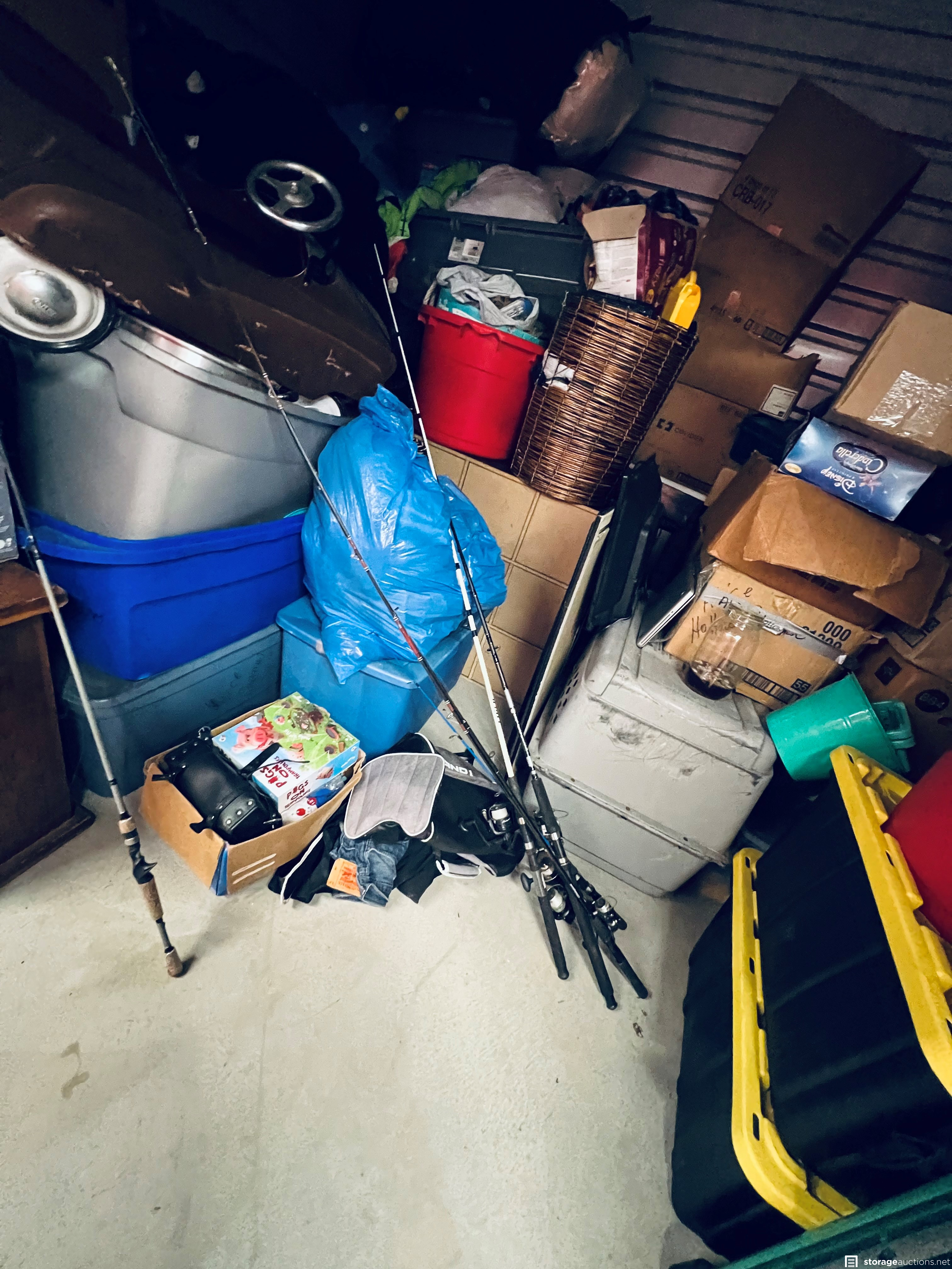 Fishing poles, old candy dispenser, toys, hamper, pet carrier, boxes