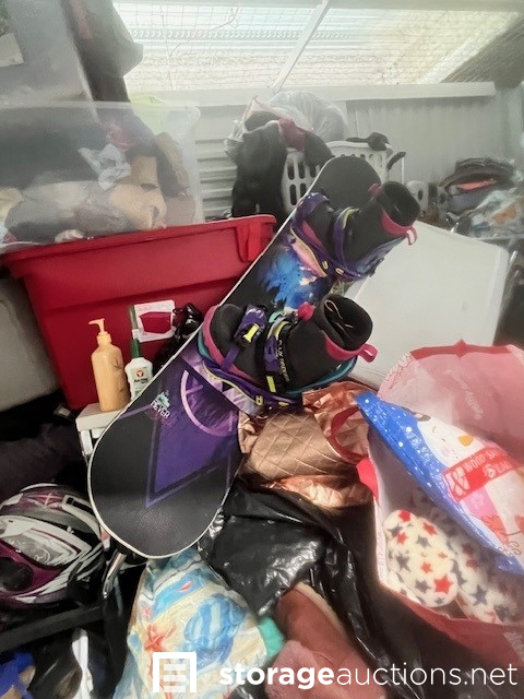 appears to be: bags/ boxes/ snowboard/ snowboard helmets/ wall art/ clothes/ shoes