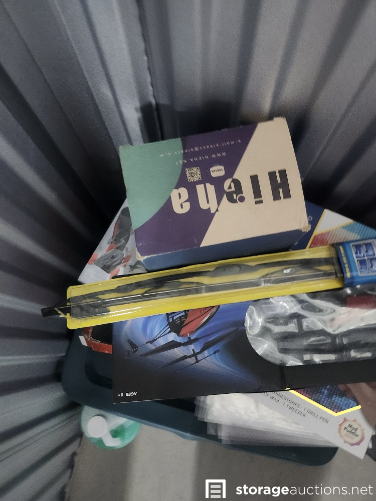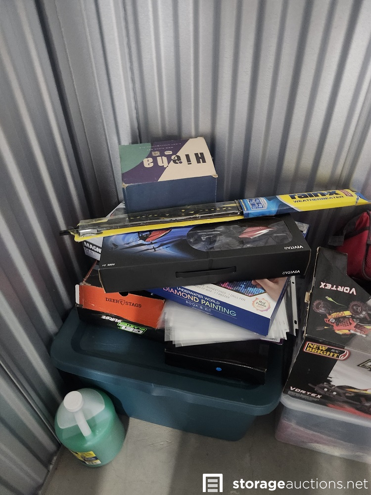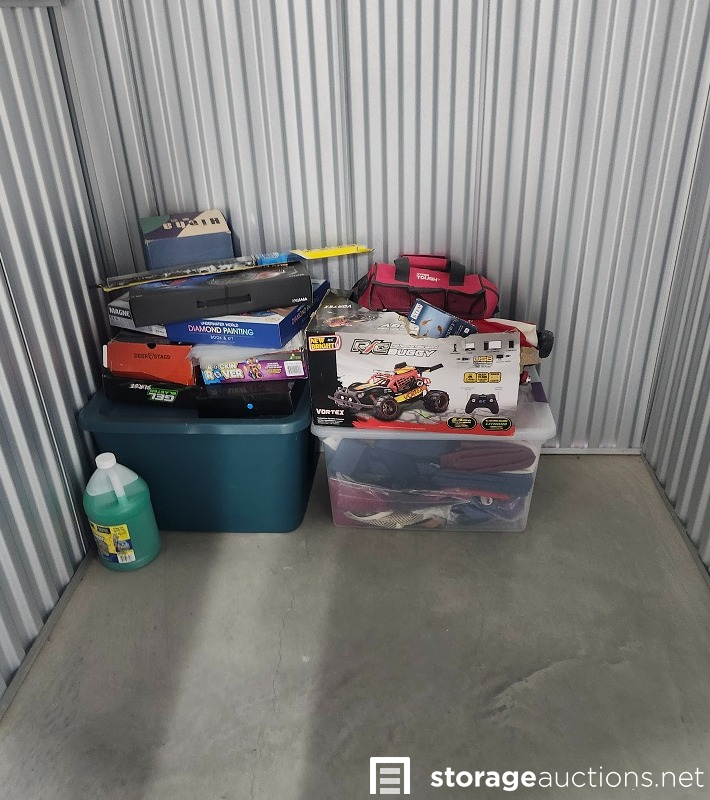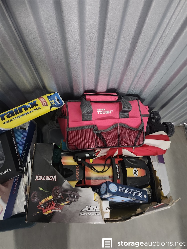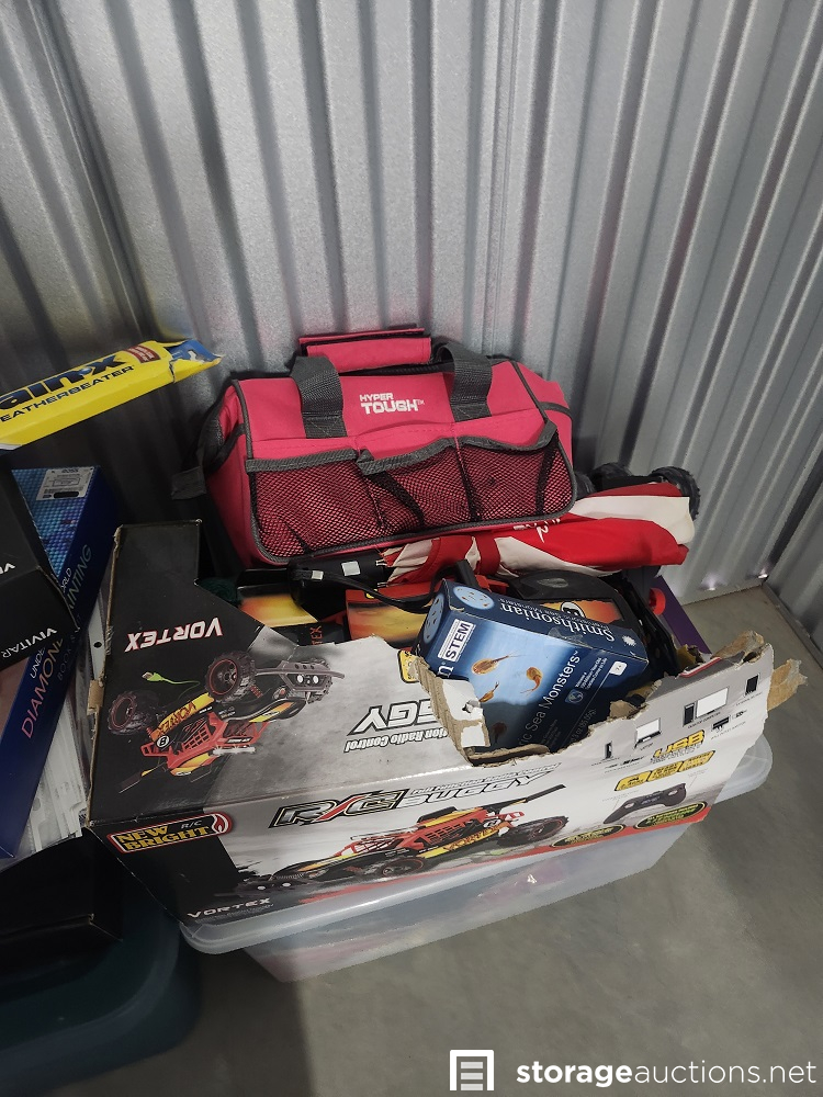 Unit appears to contain:2 totes, windshield wiper fluid, remote control truck and helicopter, Shoe box, tool bag, 6 small boxes