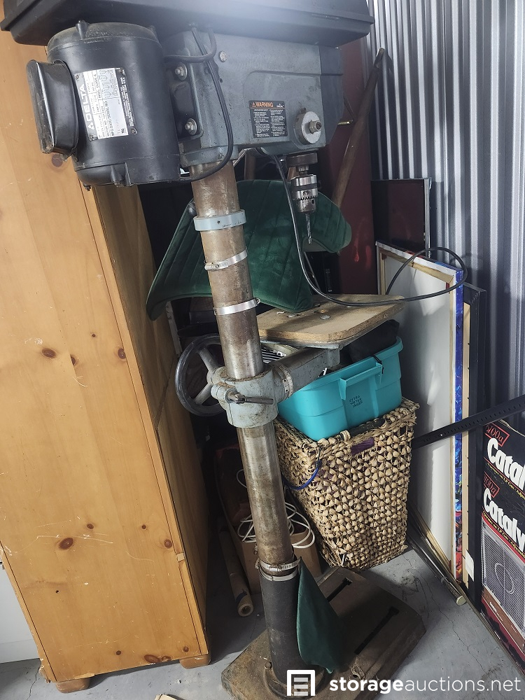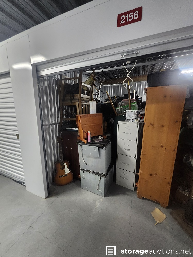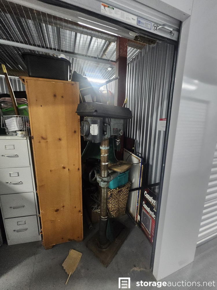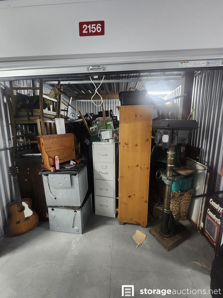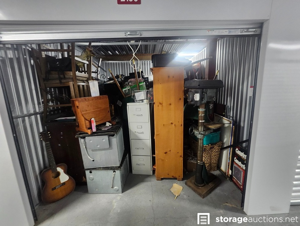 unit appears to contain:bookshelves, dining chairs, file cabinets, drill press, wall art, car parts, tools, ovens wall ac unit, guitar, area rugs, 4 totes, laundry basket, mirror, lamp