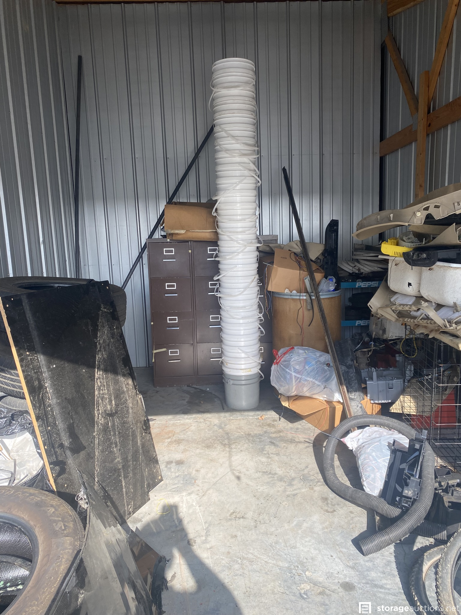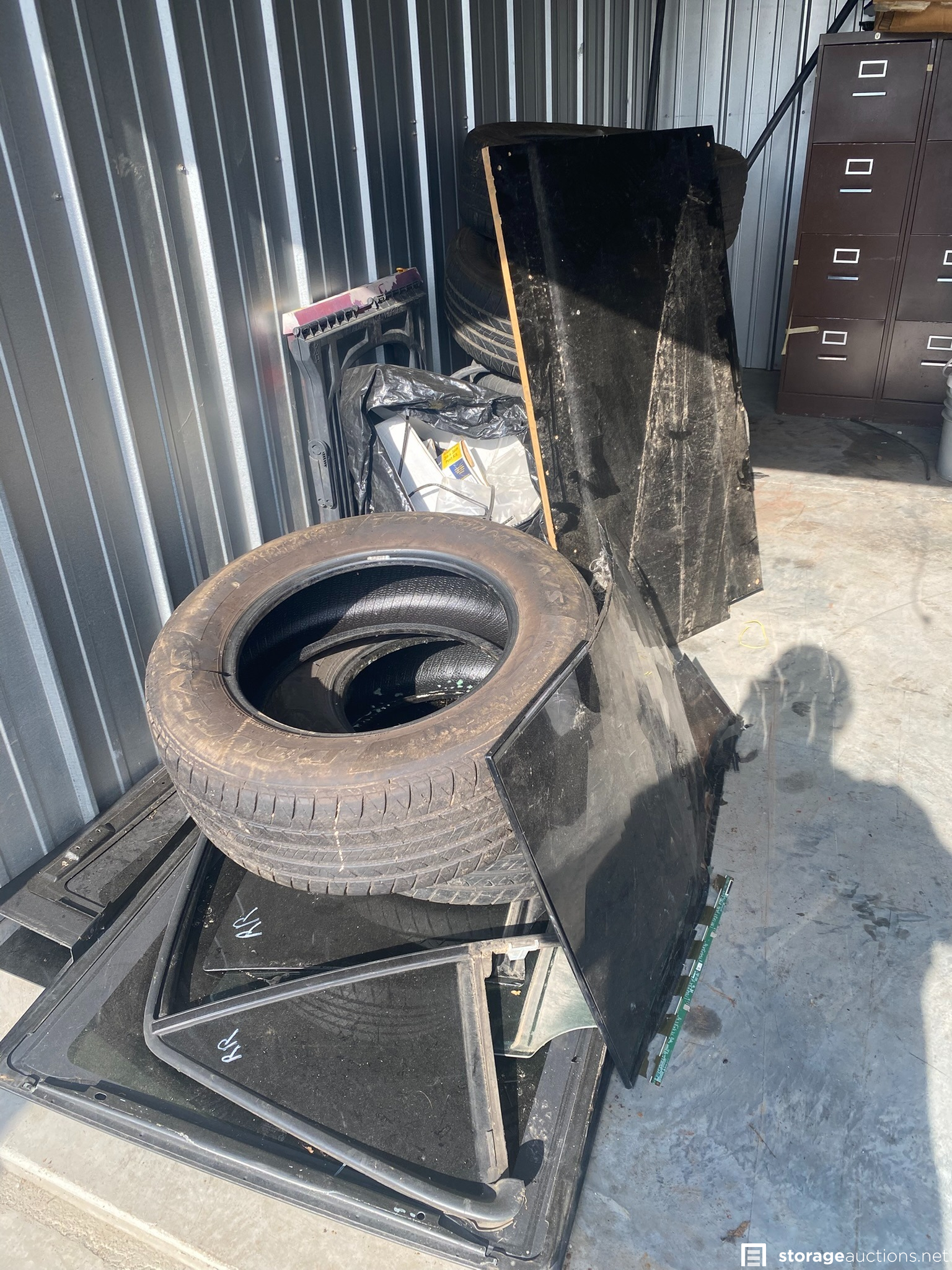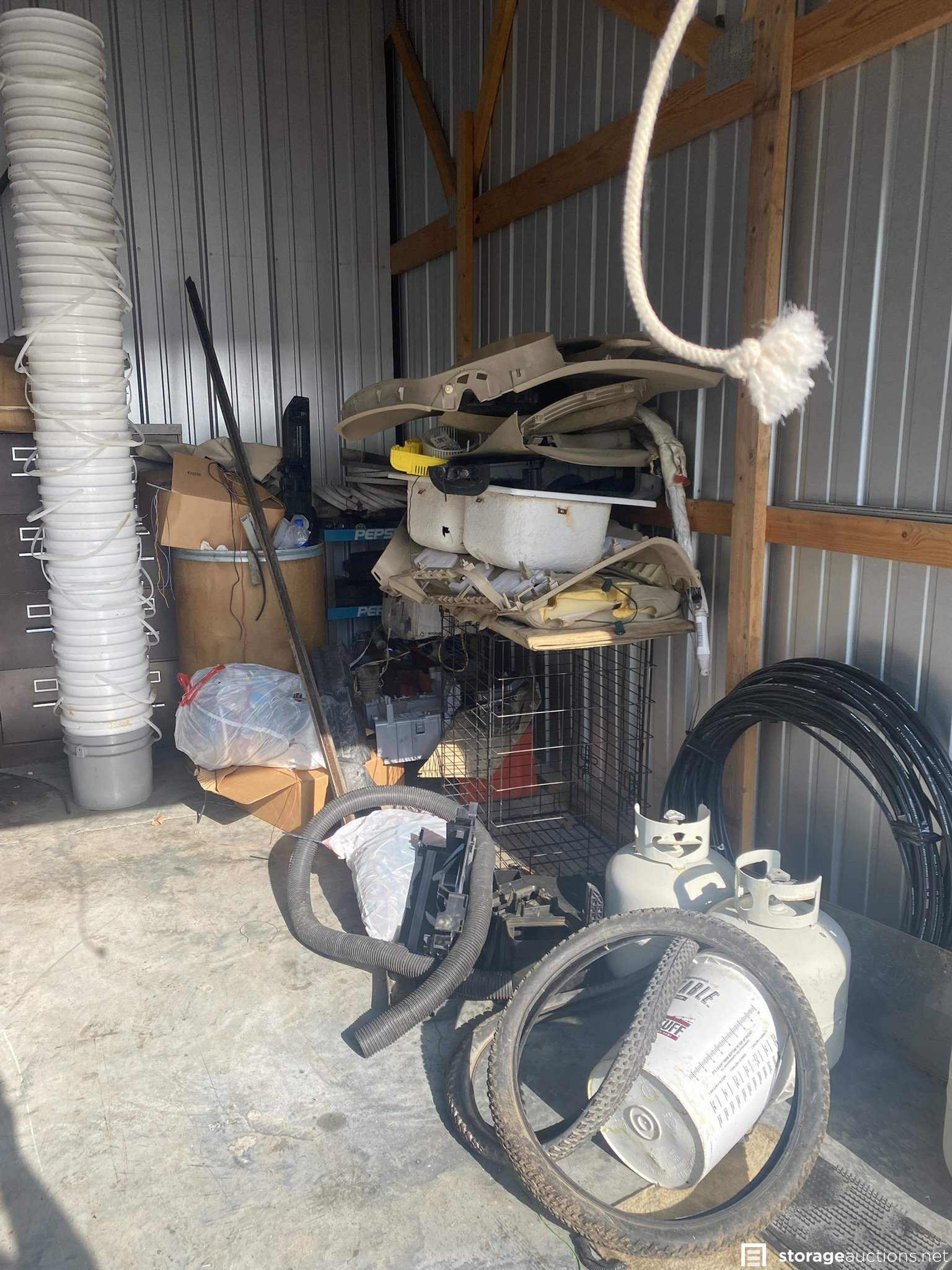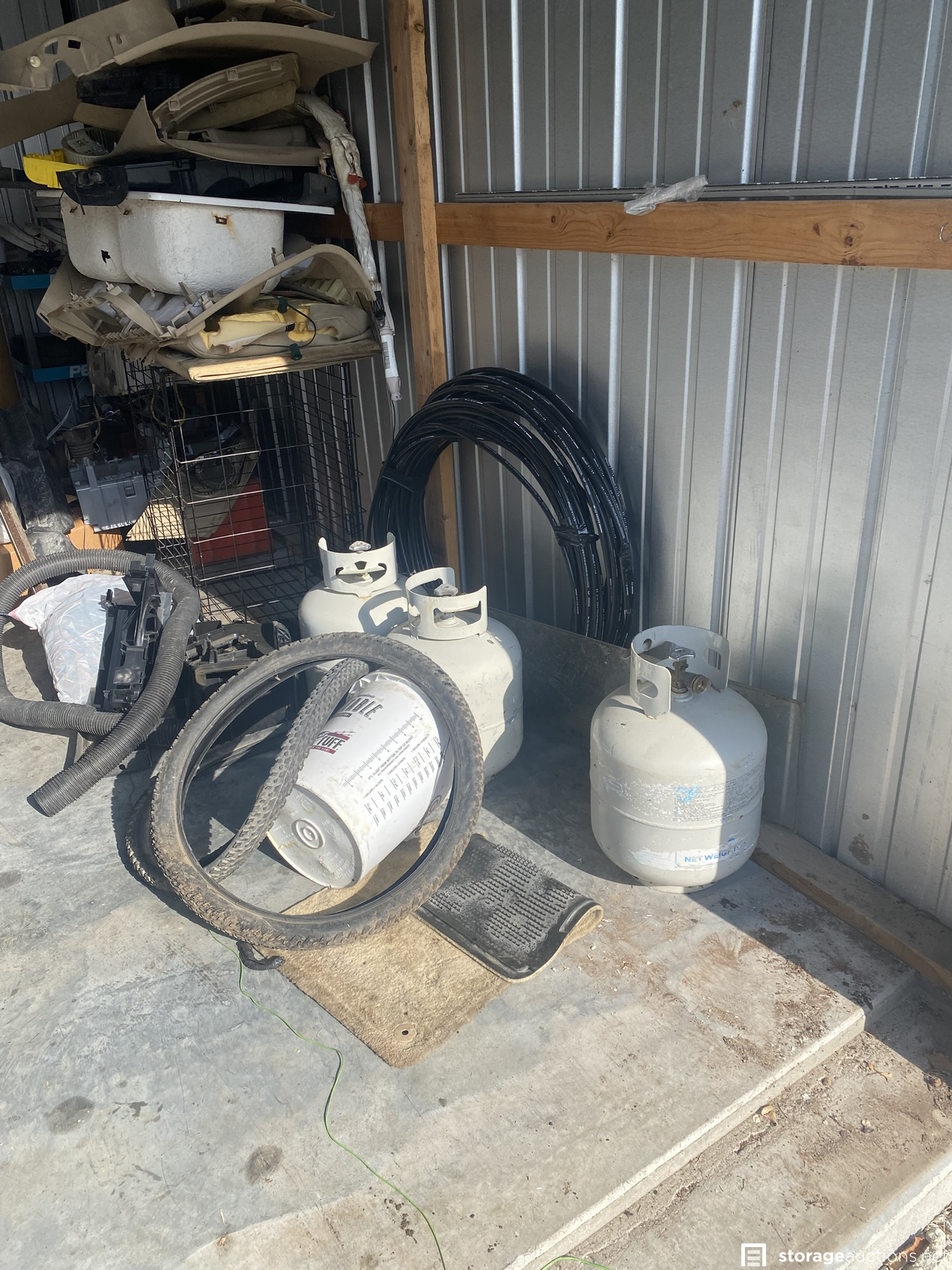Propane tanks, filing cabinets, tires, dog kennel, tubing, 5 gallon buckets, and various other household goods.