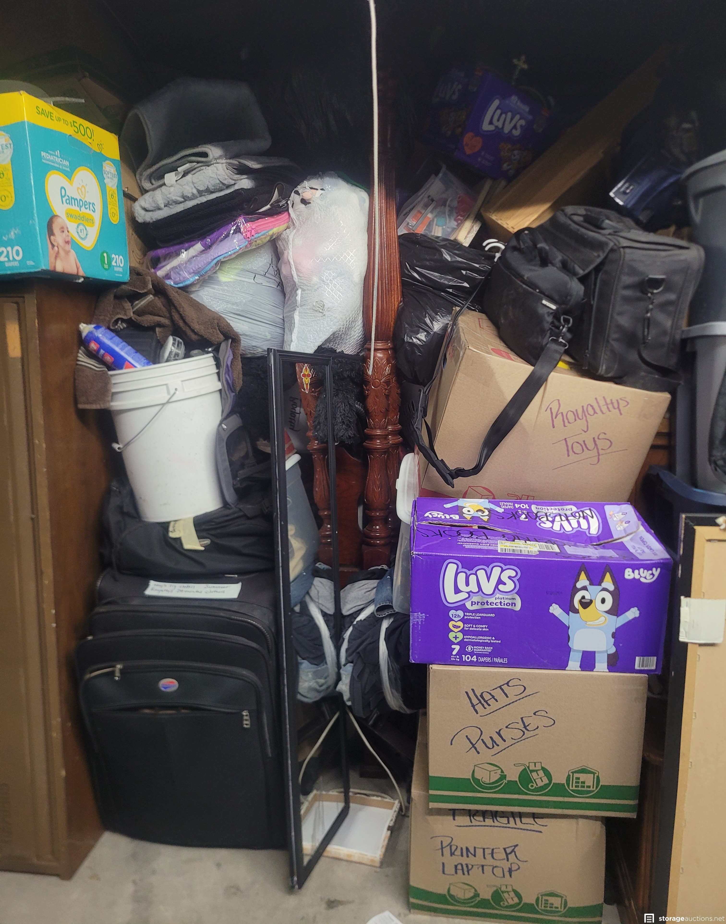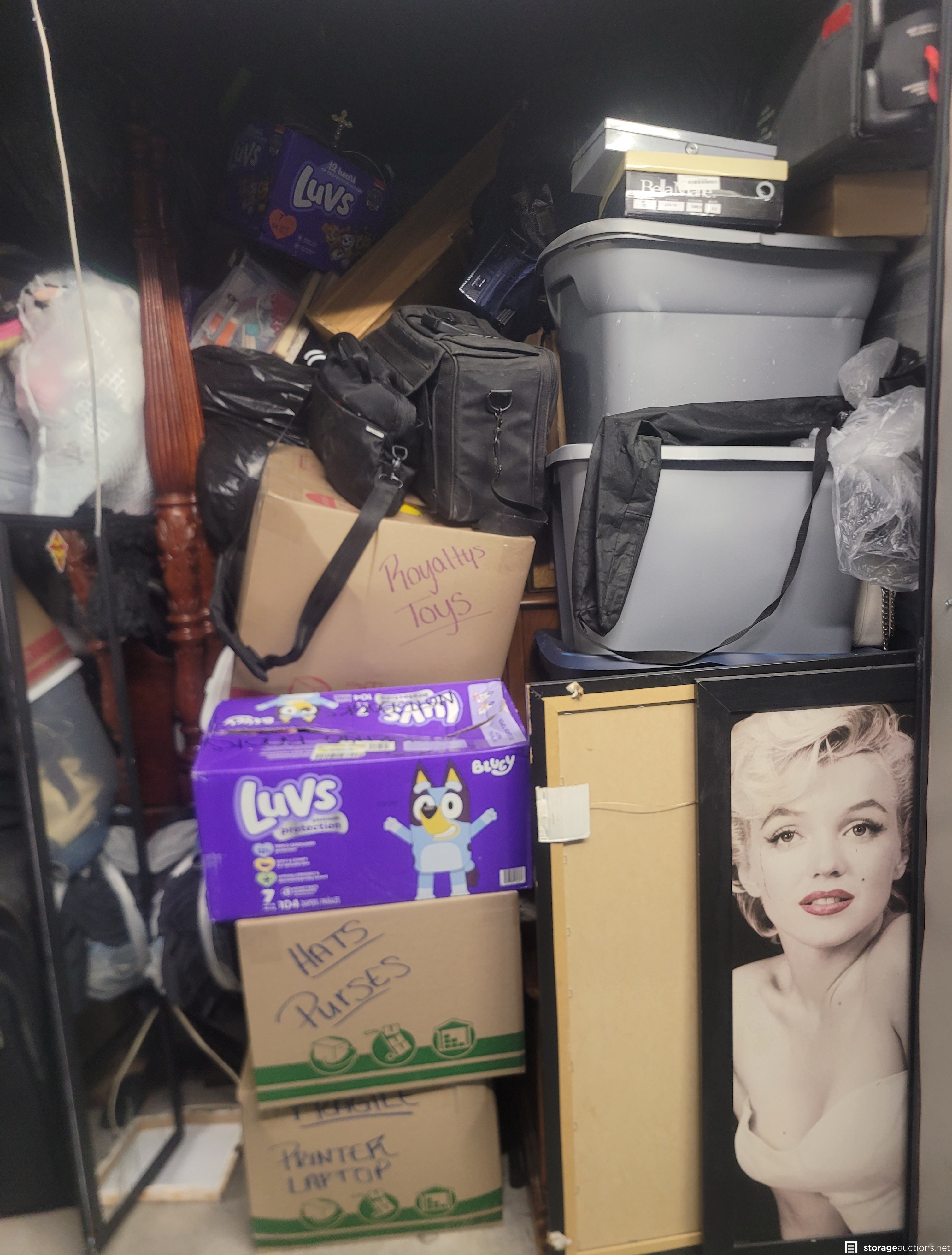 This Unit Contains: Bed, Dresser, Bags, Boxes, Clothes, Totes, Toys, Playpen, Pictures, Suitcases, Speakers