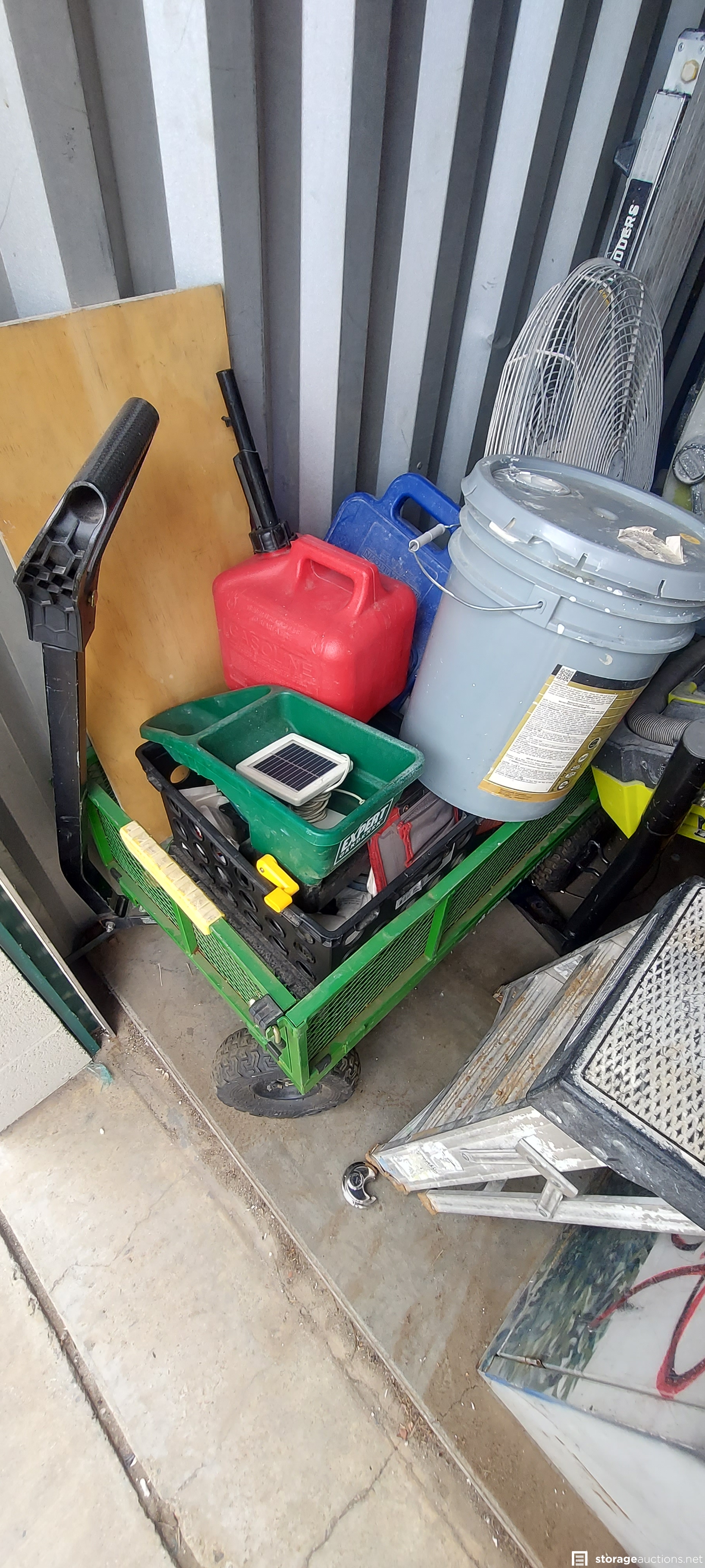 tool box, cabinet, ladder, wagon, fan, vacuum, drill, lawnmower, wheel barrel, stilts, tool bags, scaffolding, stilts