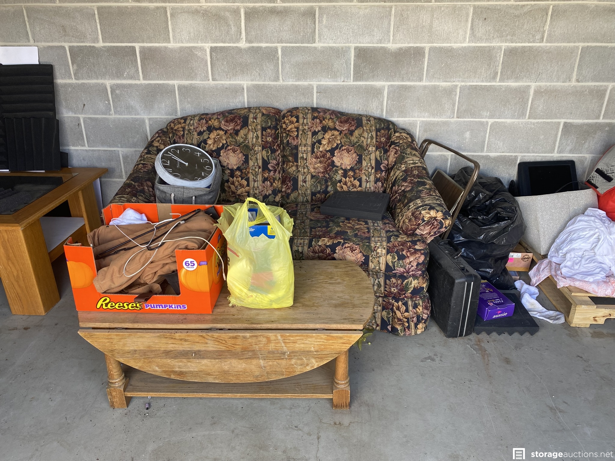 Couple of coffee tables, loveseat sofa, dresser, wall clock, soundproofing insulation, kids bike and scooter, stanley cup, traffic signs.
