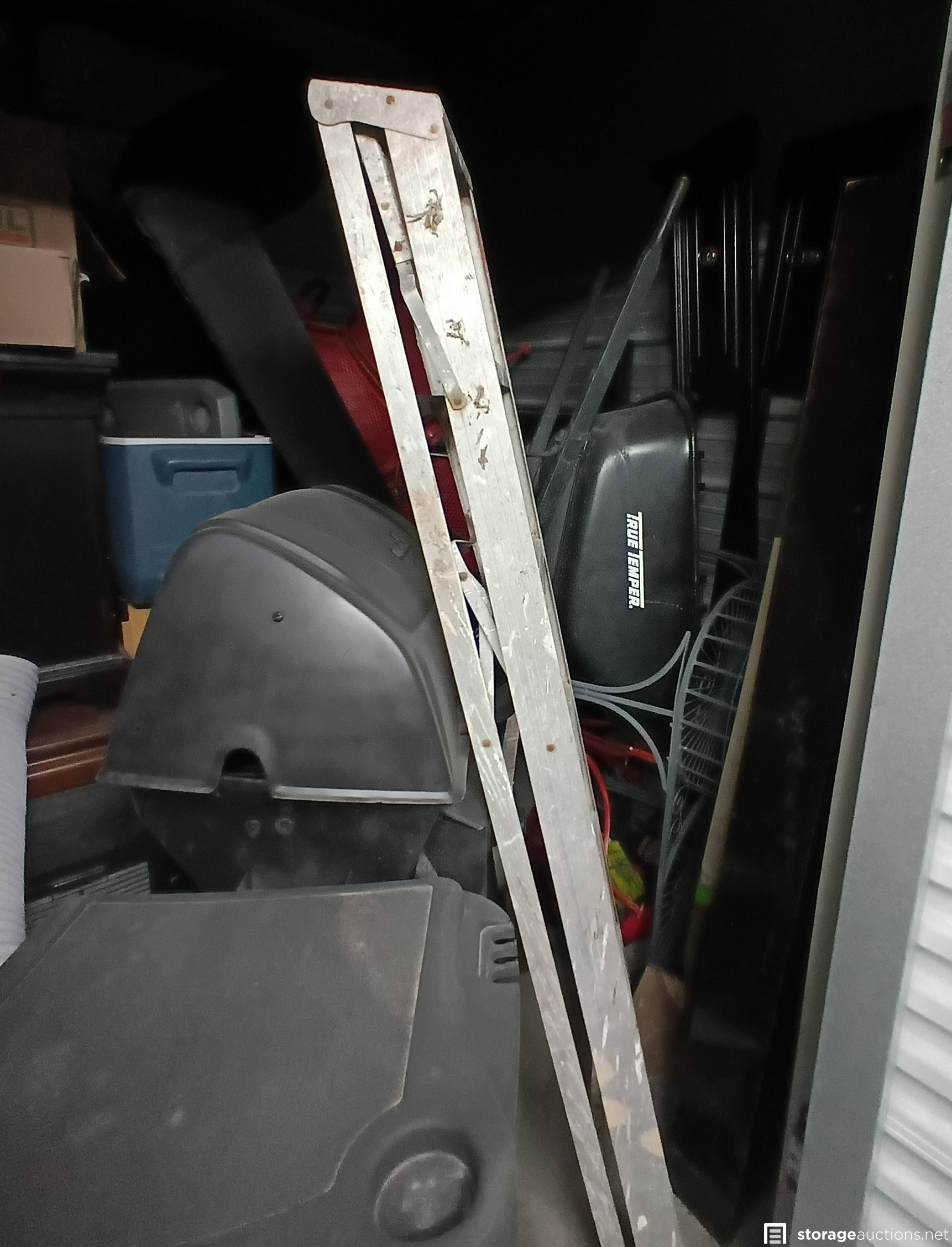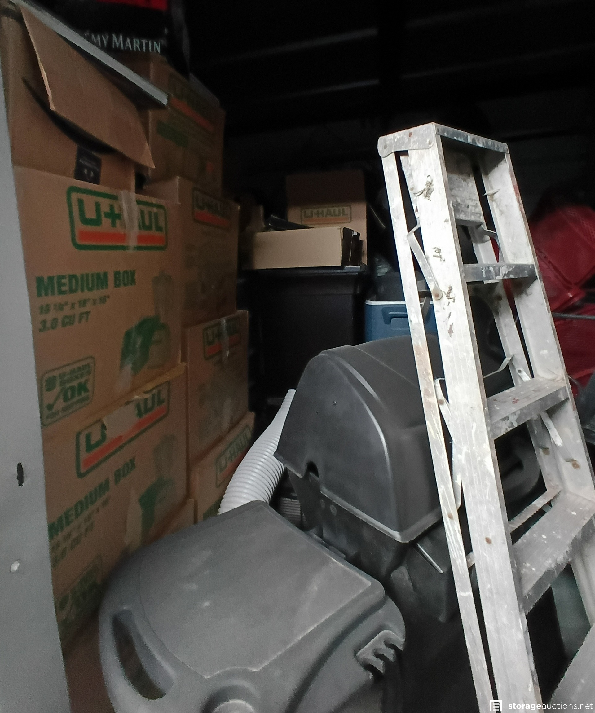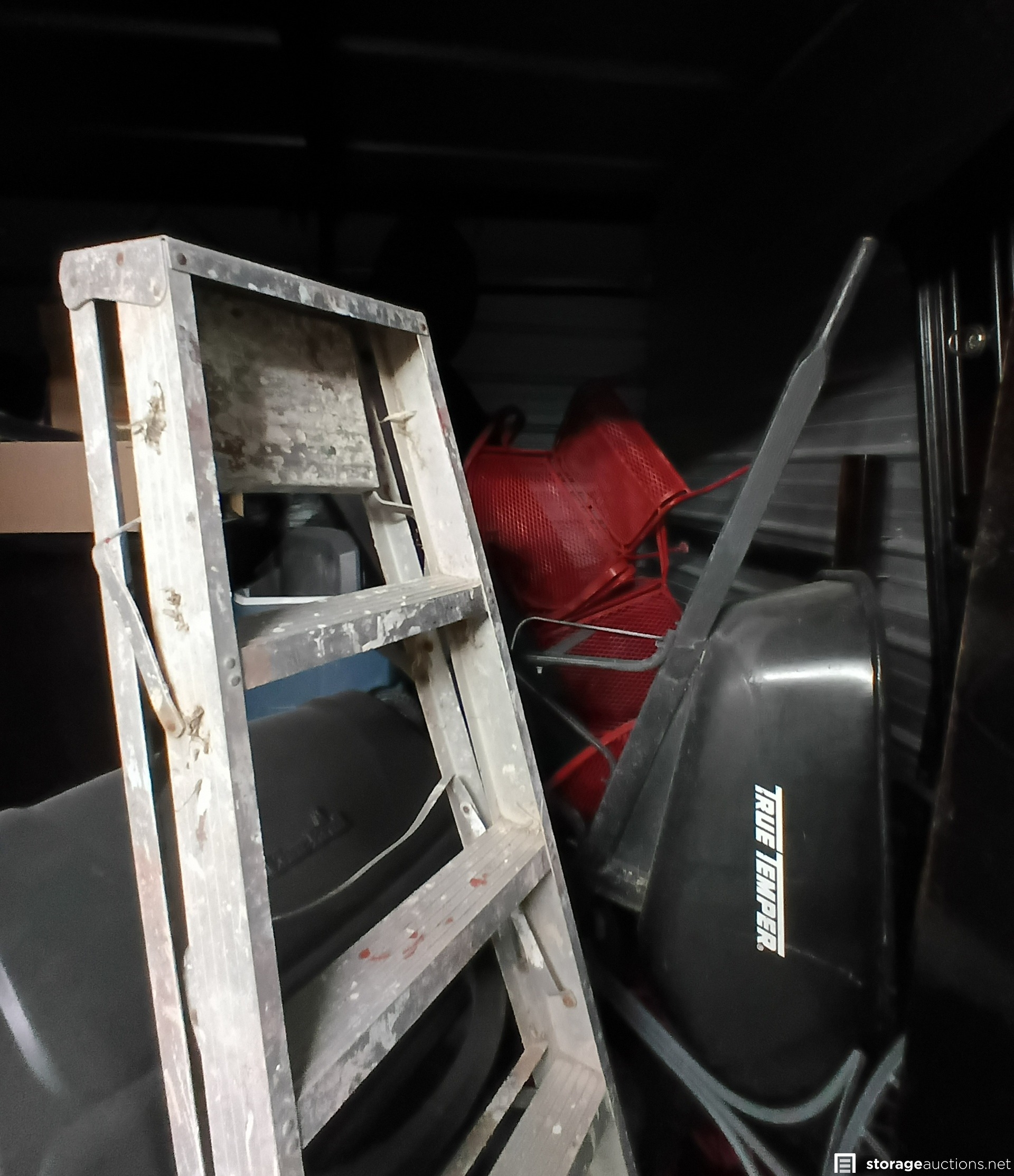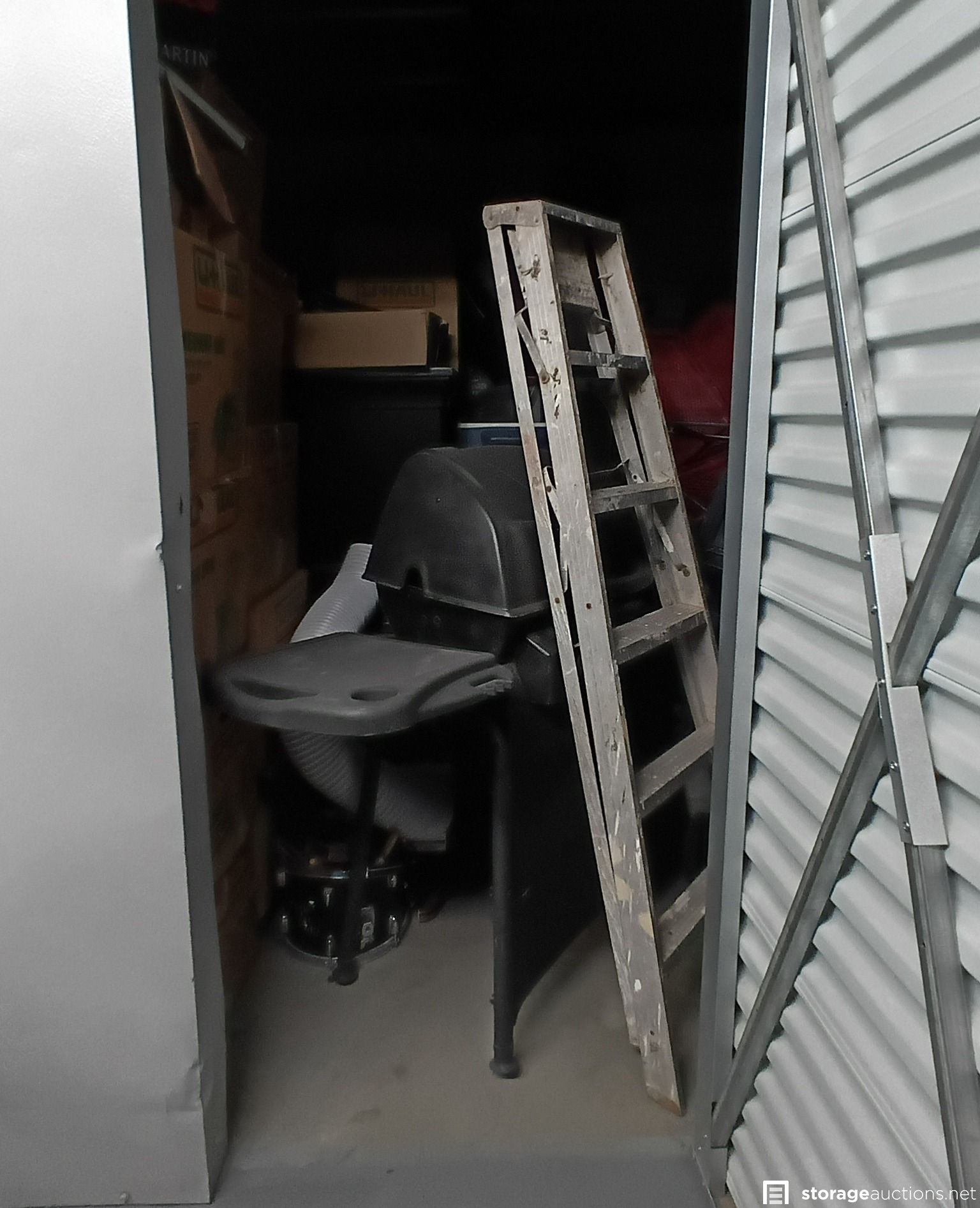 this unit contains: A couch, night stands, boxes, grill, ladder, drum, wheelbarrow, patio furniture, portable A/C