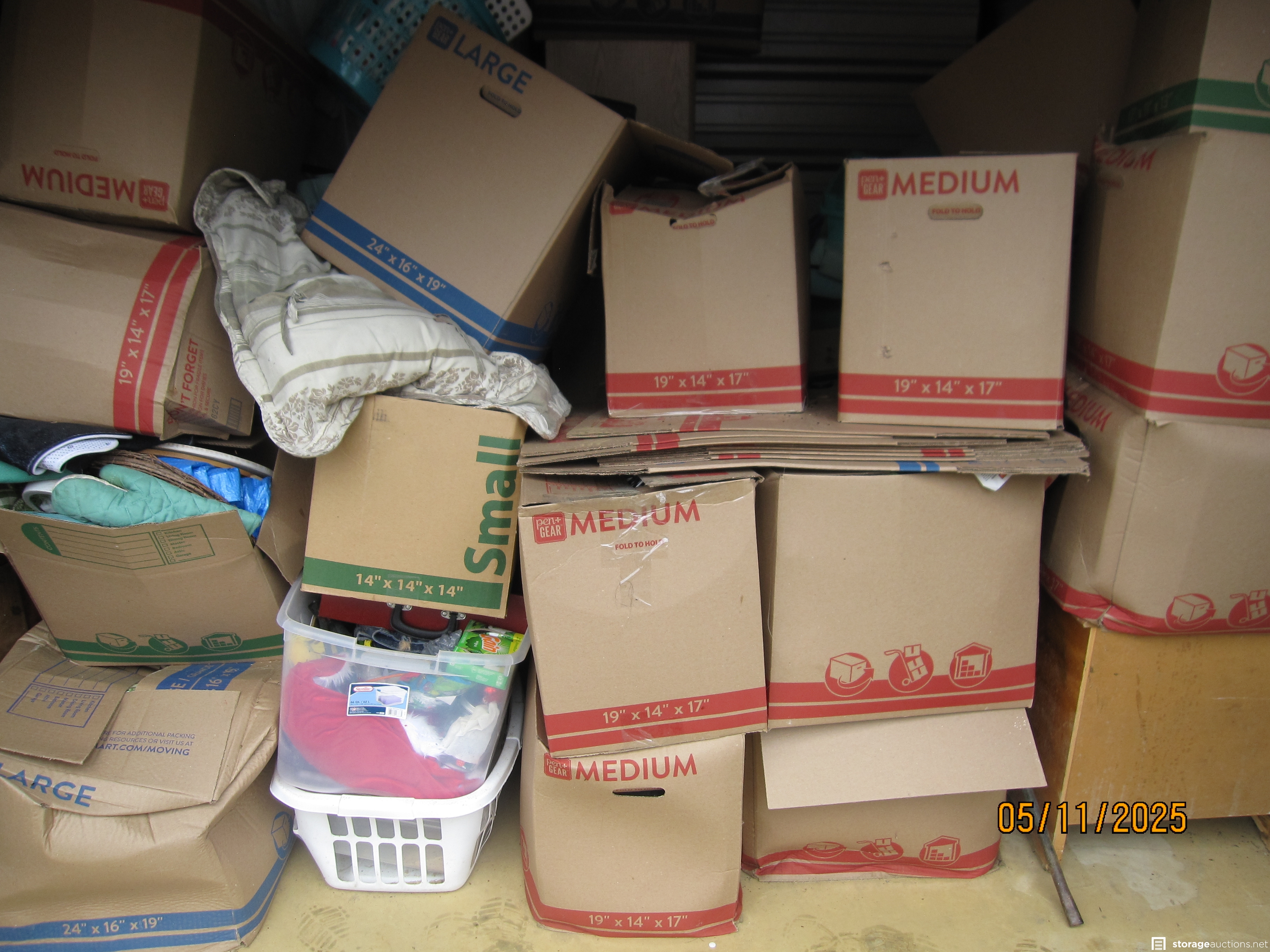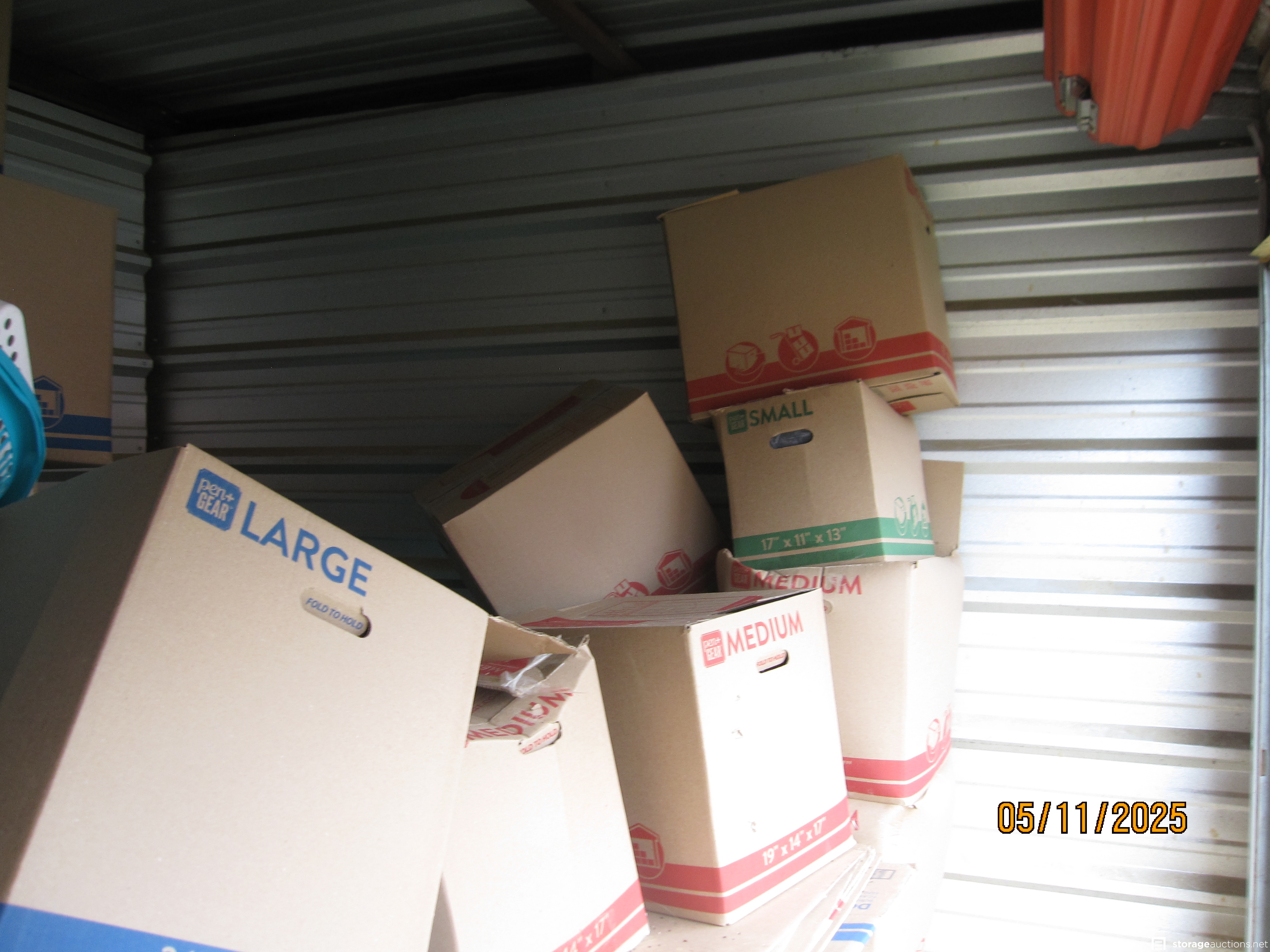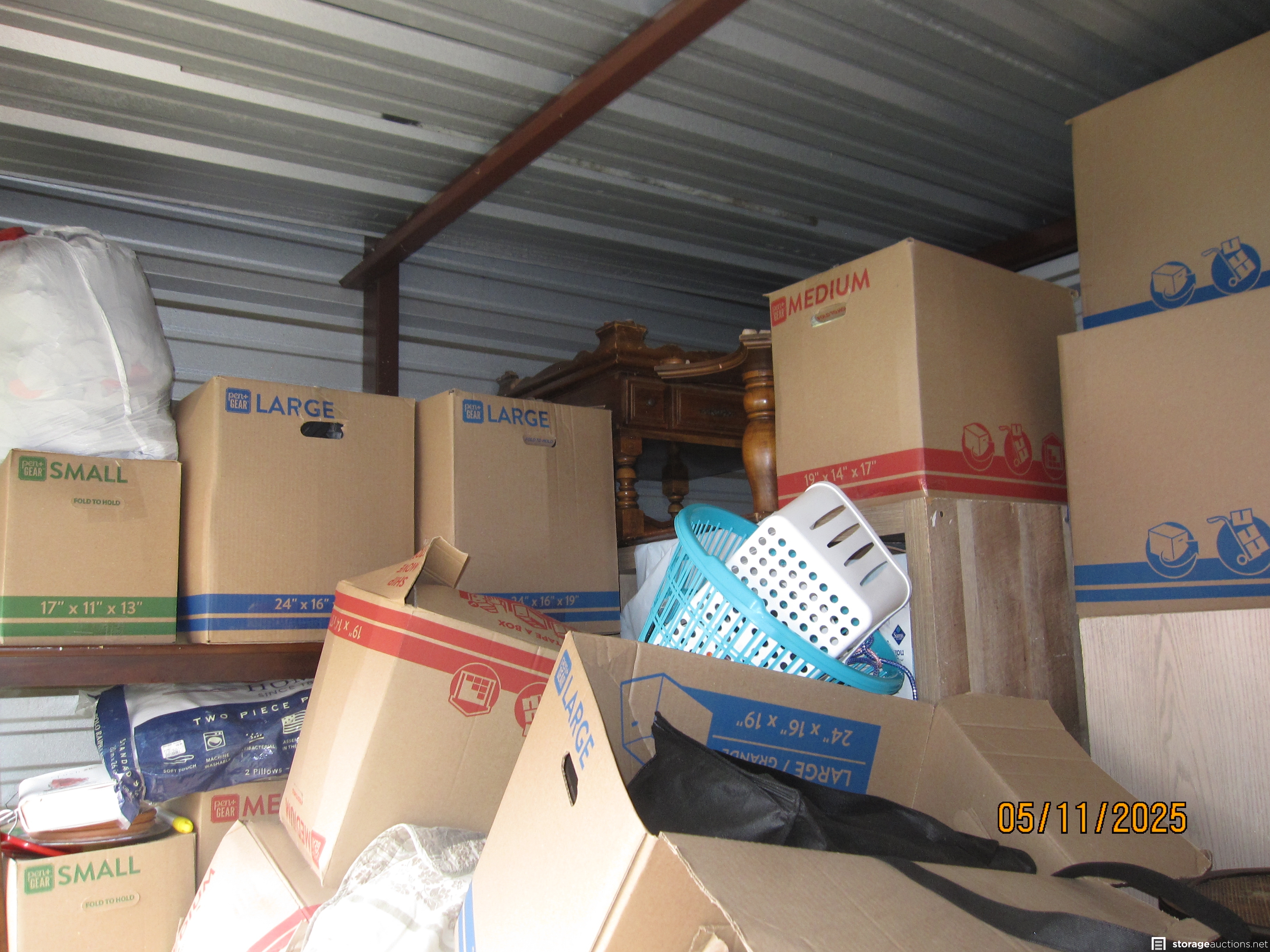Everything in this unit is in neat boxes other than furniture. Can't tell the contents. You can see that someone cared enough to buy all consistent boxes and pack and store very neatly! Someone cared about the condition of their stuff! Unit is packed FULL of boxes of whatever.