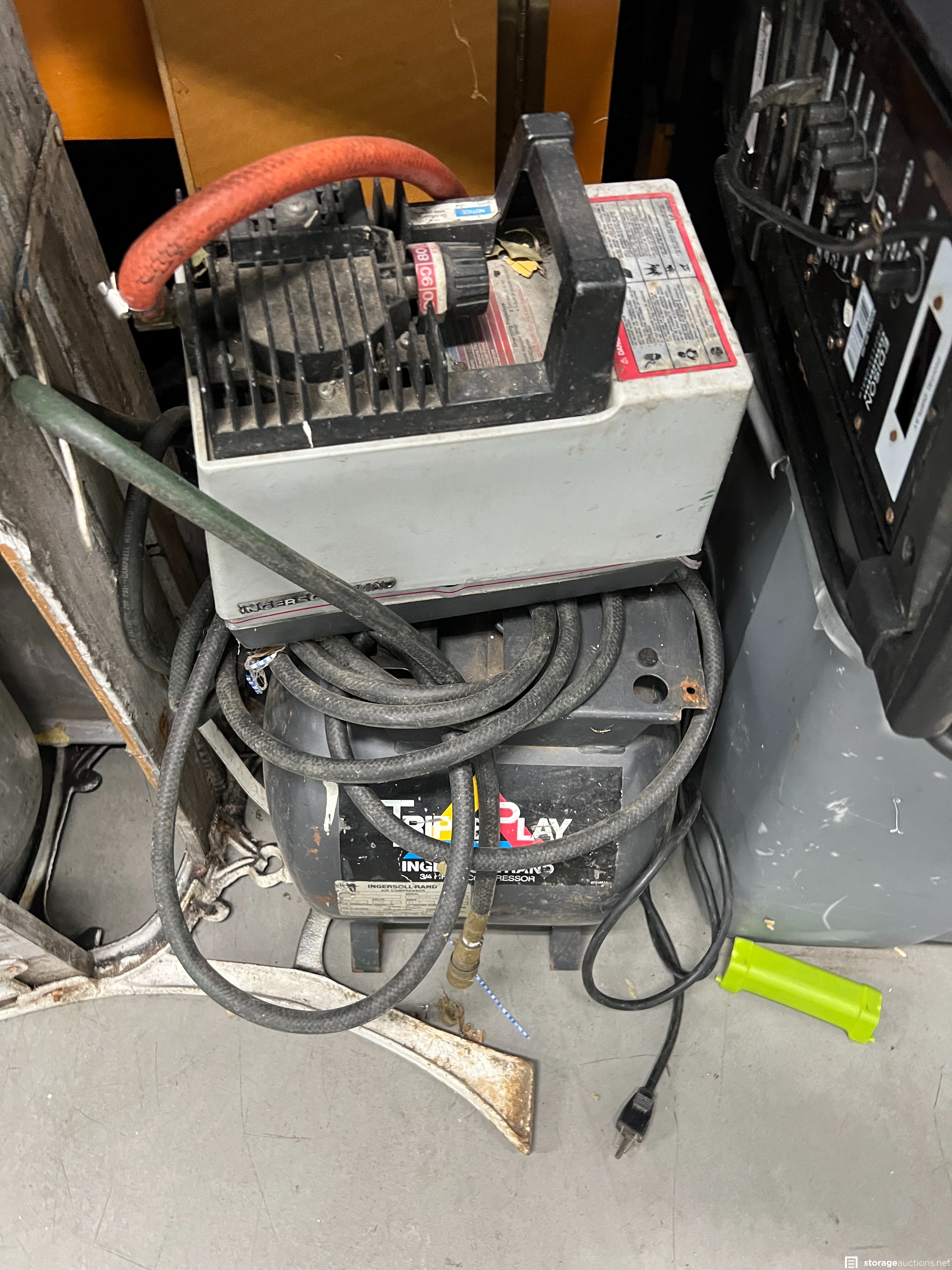 (SABRINA SENA.) TOTES, BOXES, AIR COMPRESSOR, FURNITURE, BAGS, BENCH, WALL DECOR, PROPANE BURNER, BIKE, LUGGAGE, SPEAKERS, MACHINERY.