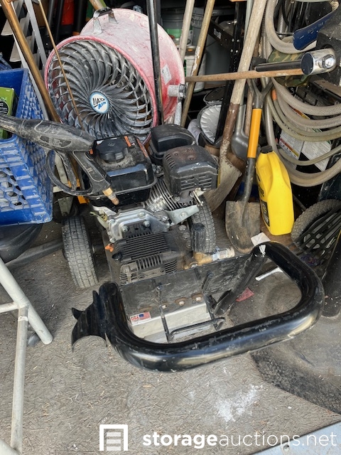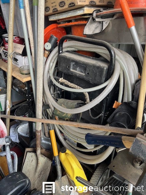 Hopper, tool cart, floats, shovels, shelving, pressure washer, multiple ladders, heavy machinery, tool boxes, levels, weed whacker, fish tank, paint sprayers, air compressor, chop saw, tool bag, const. equipment, vise