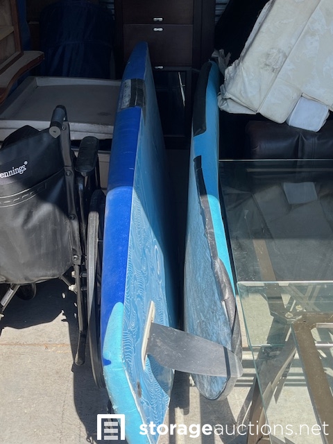 Couches/loveseat, wood furniture, small tv, surfboards, coffee table/end tables, wheelchair, box, exercise ball, small glass front cabinet