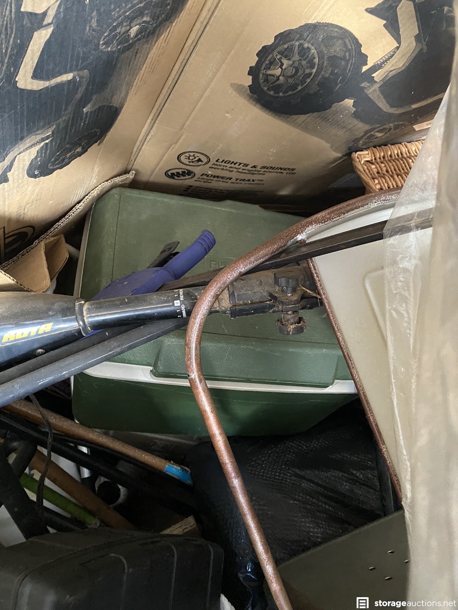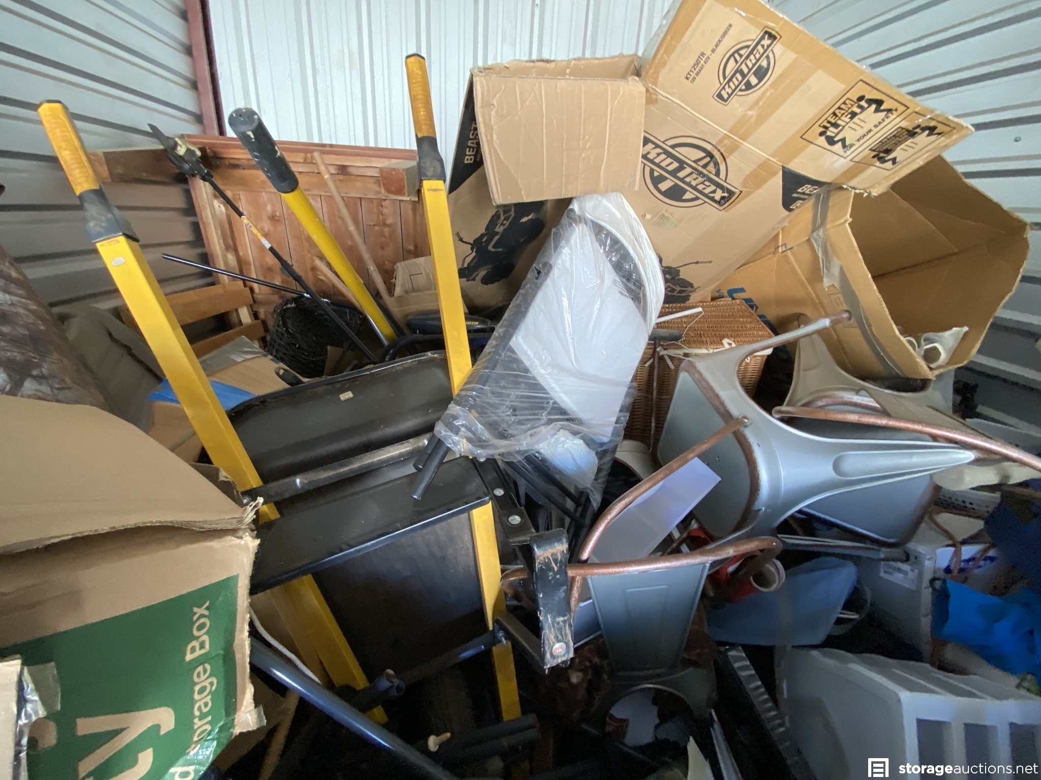 tents, dishwasher, grill, coolers, yard care tools, chairs, tables, wood, wheelbarrow, tarp, clothes, headboard, misc