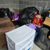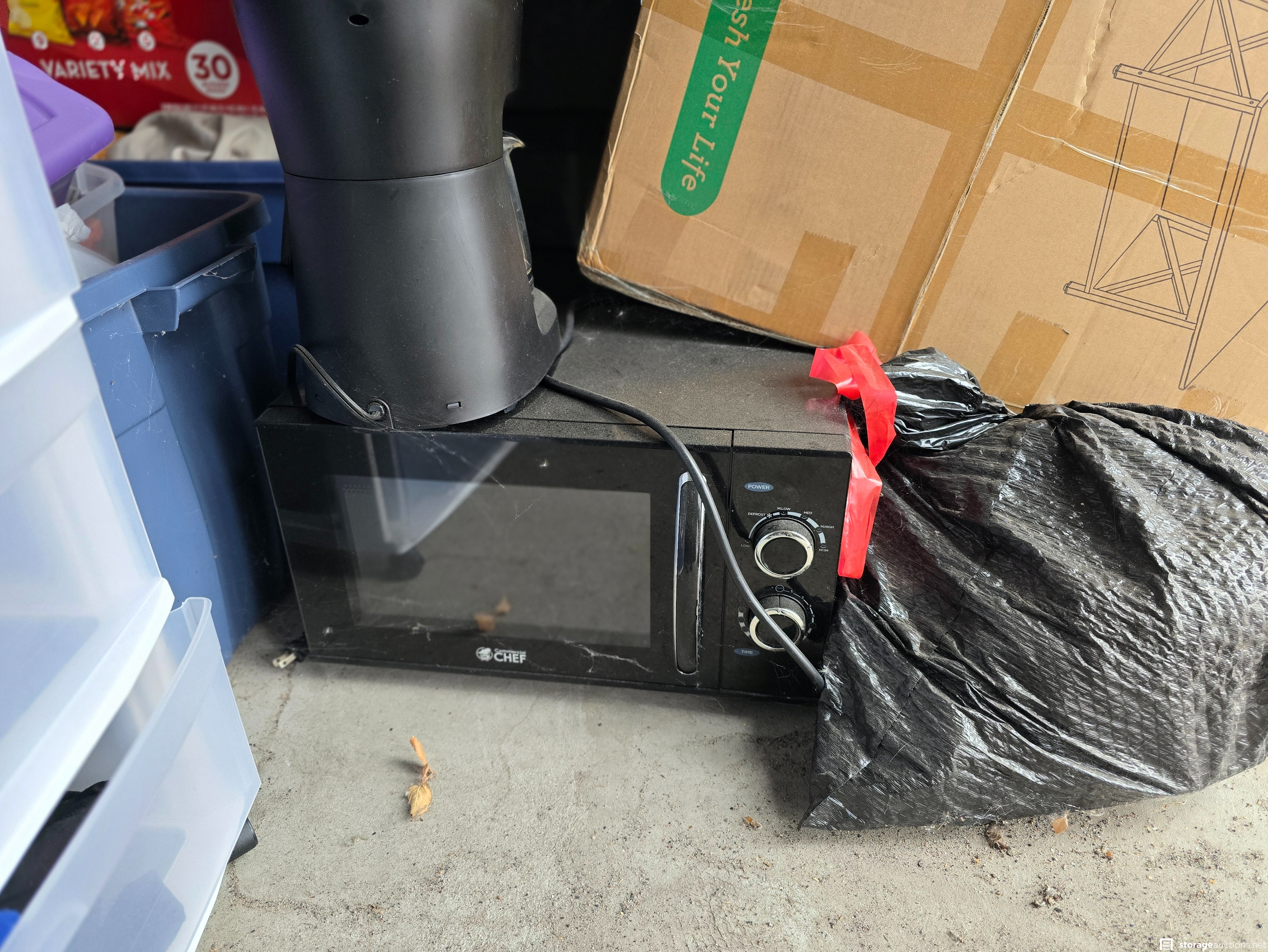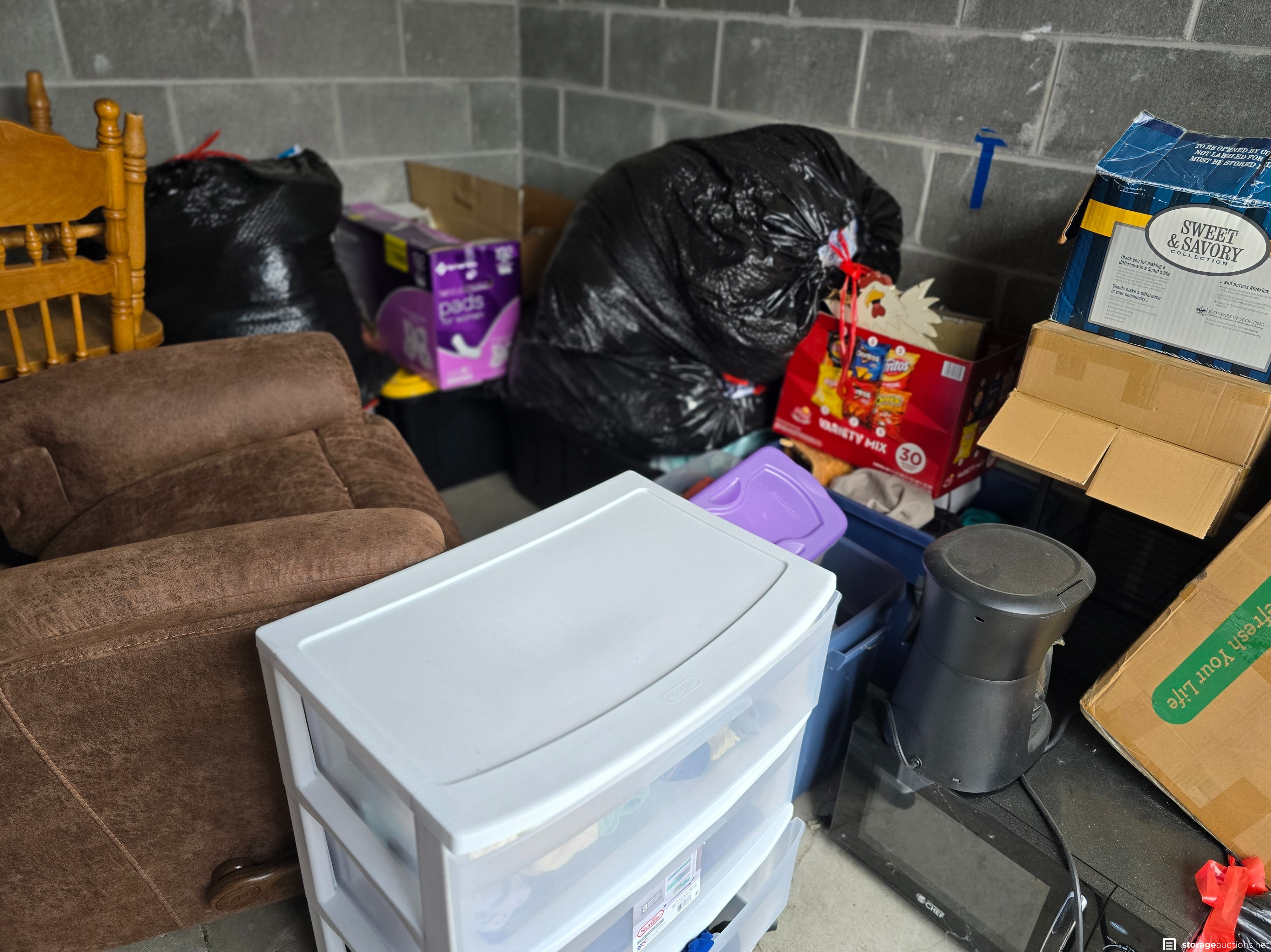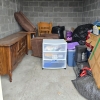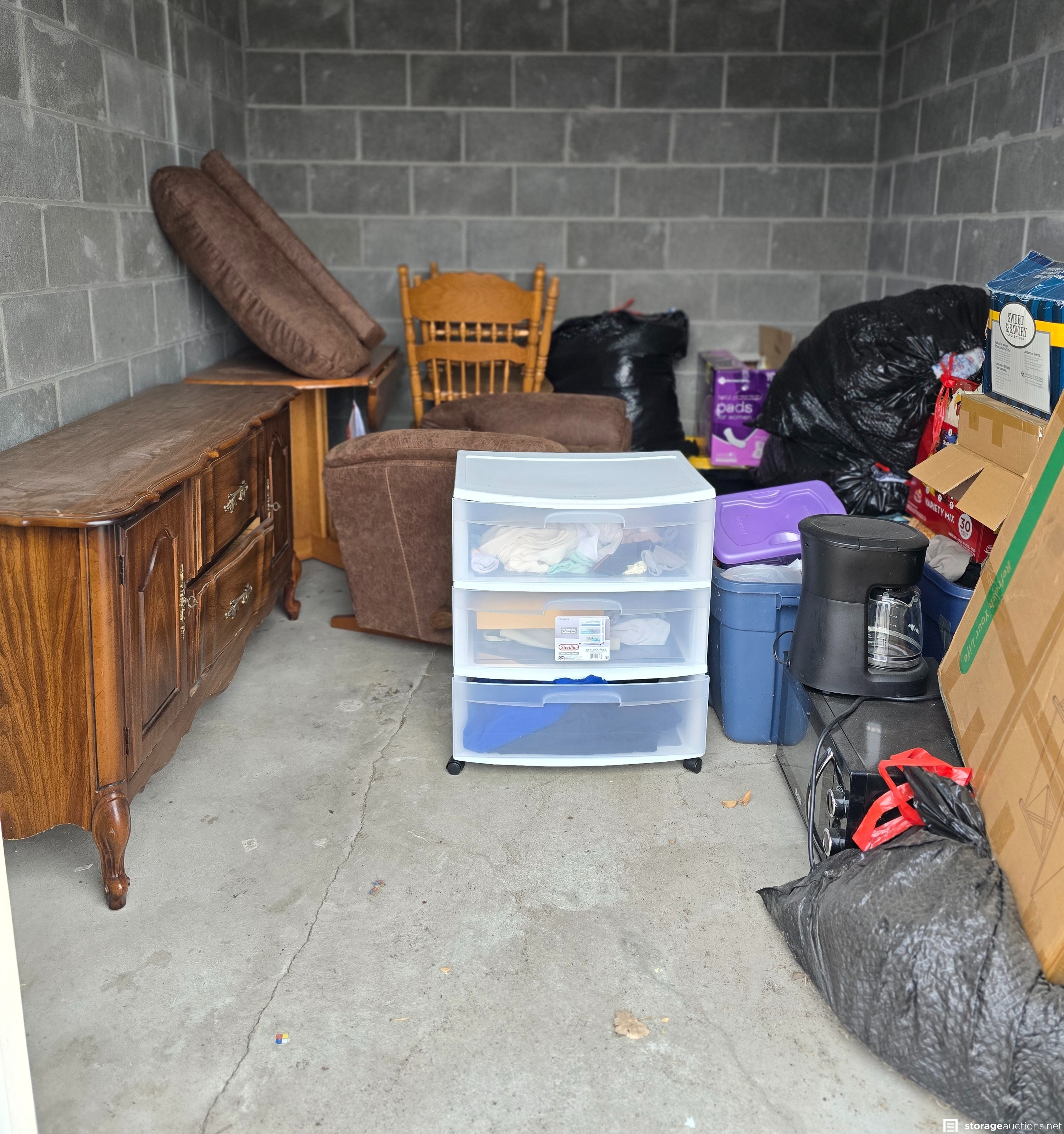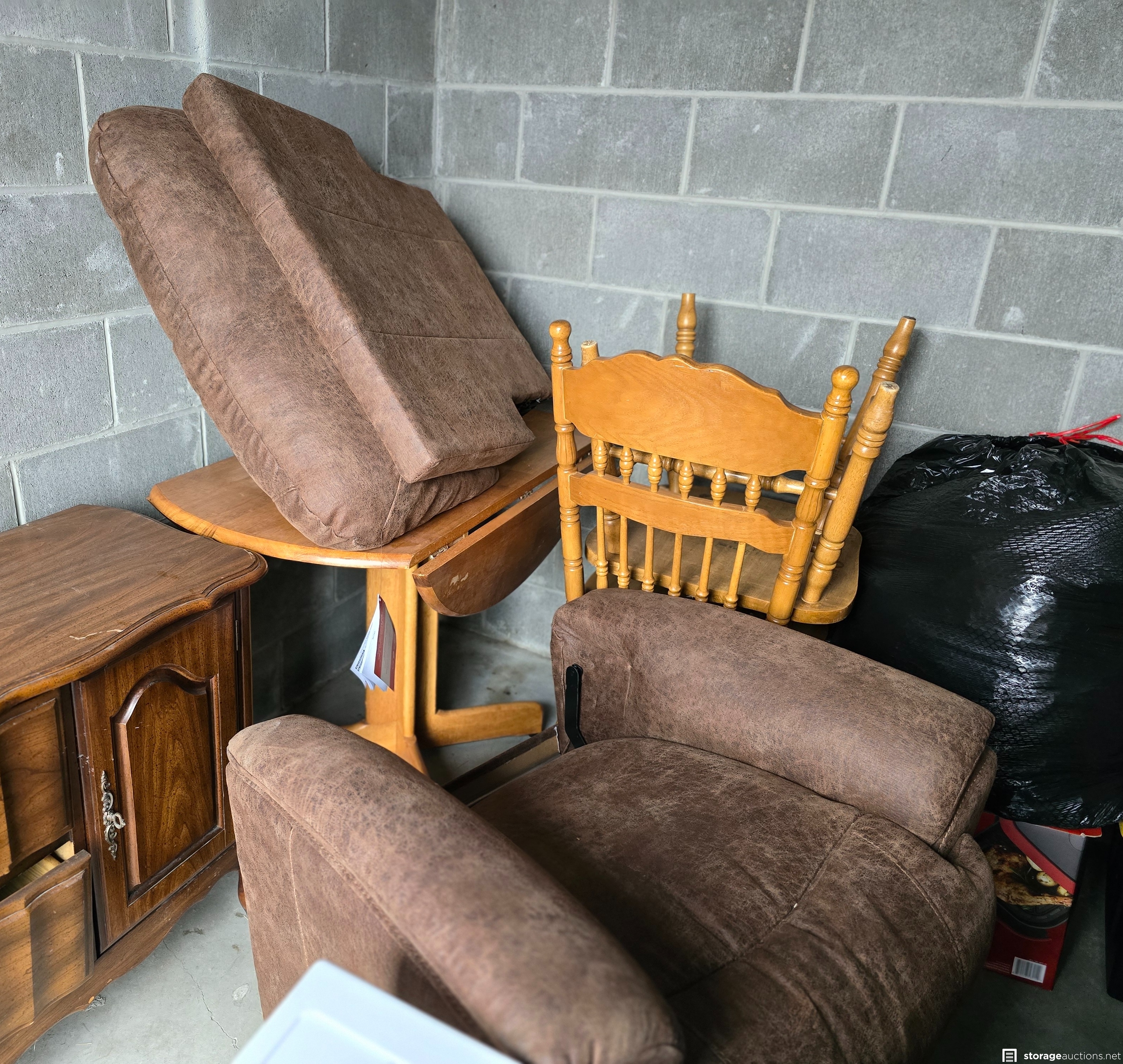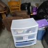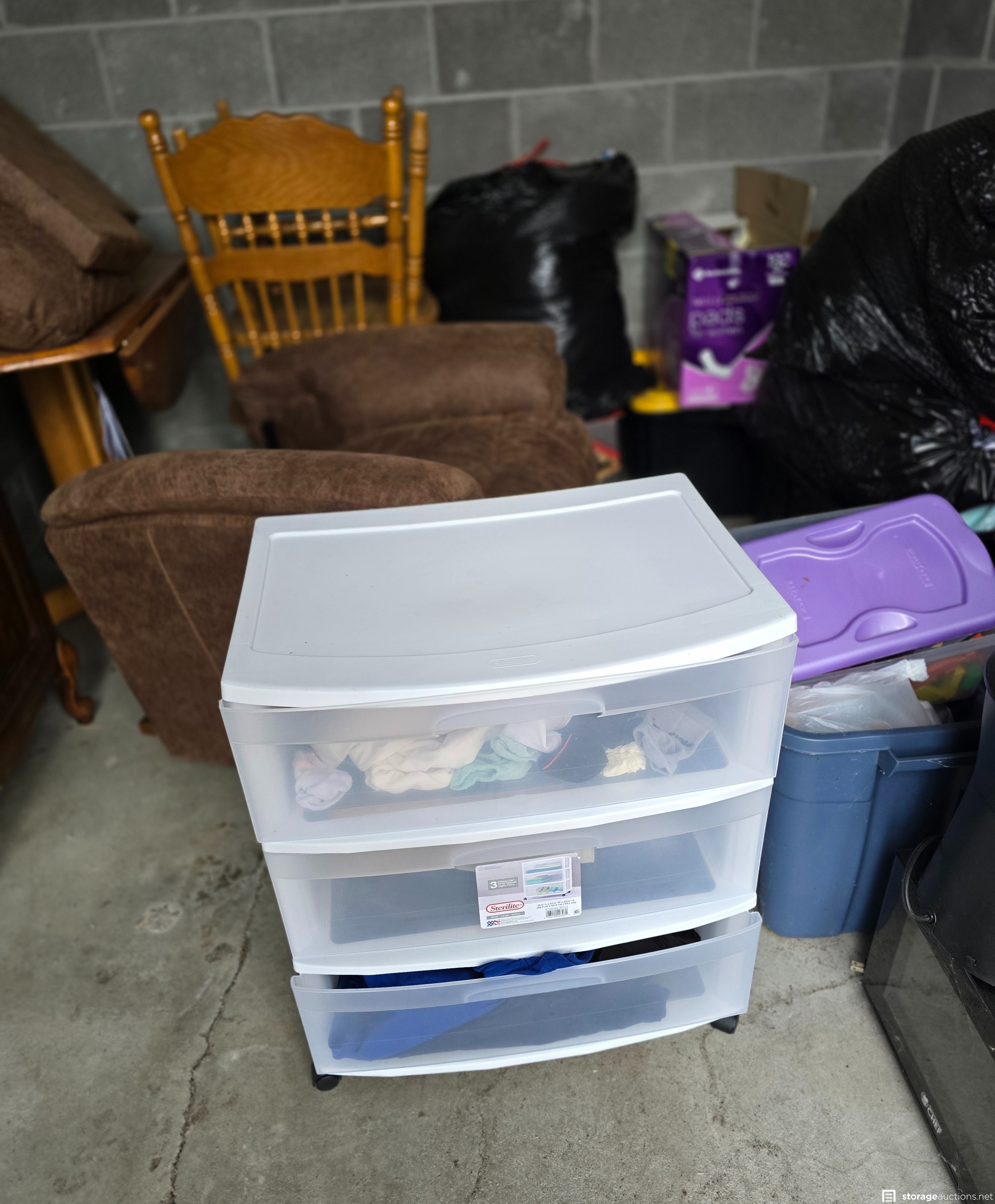 Dresser, small table, recliner, coffee table, microwave, coffee maker, clear plastic drawer organizer, misc.