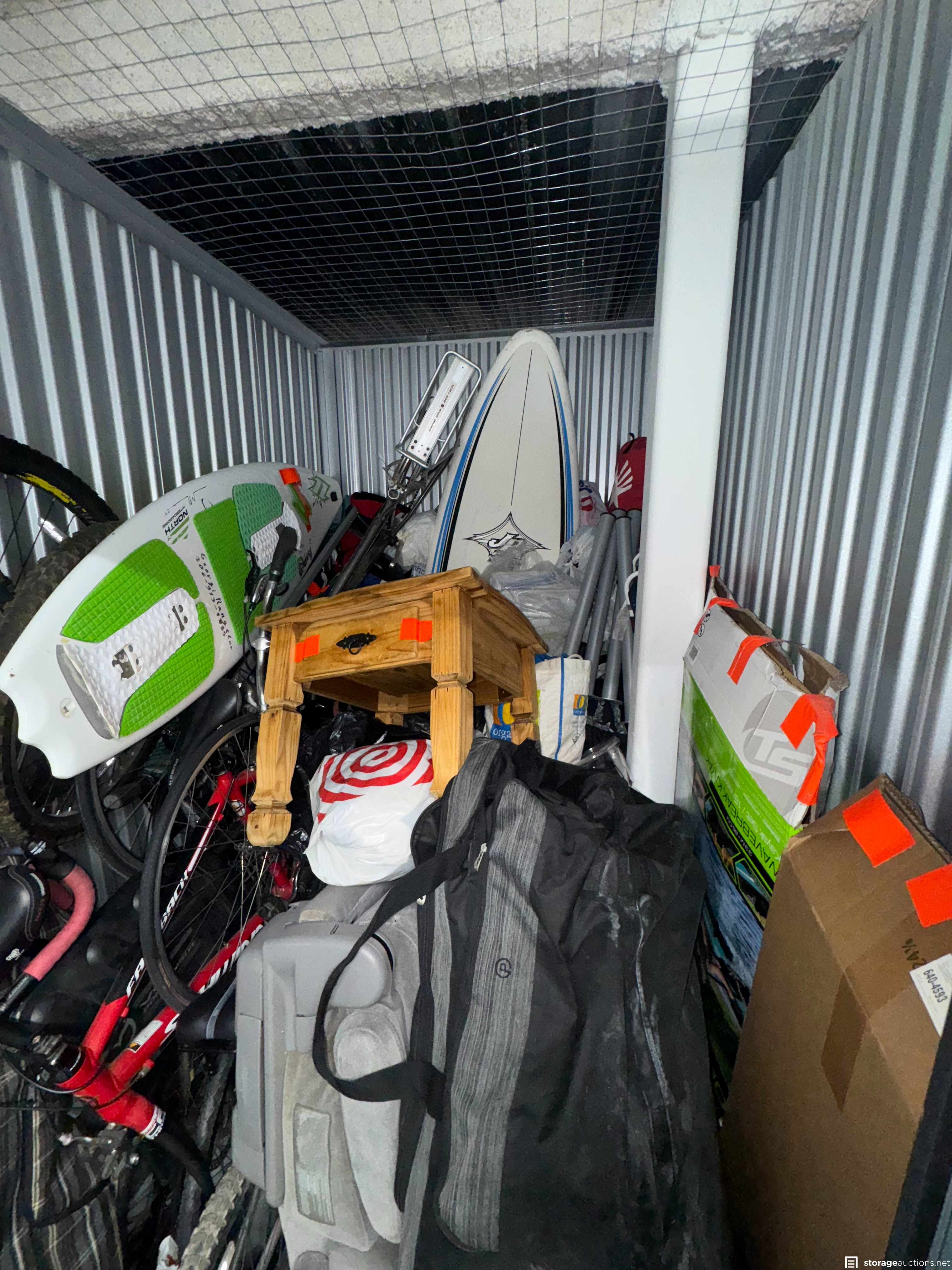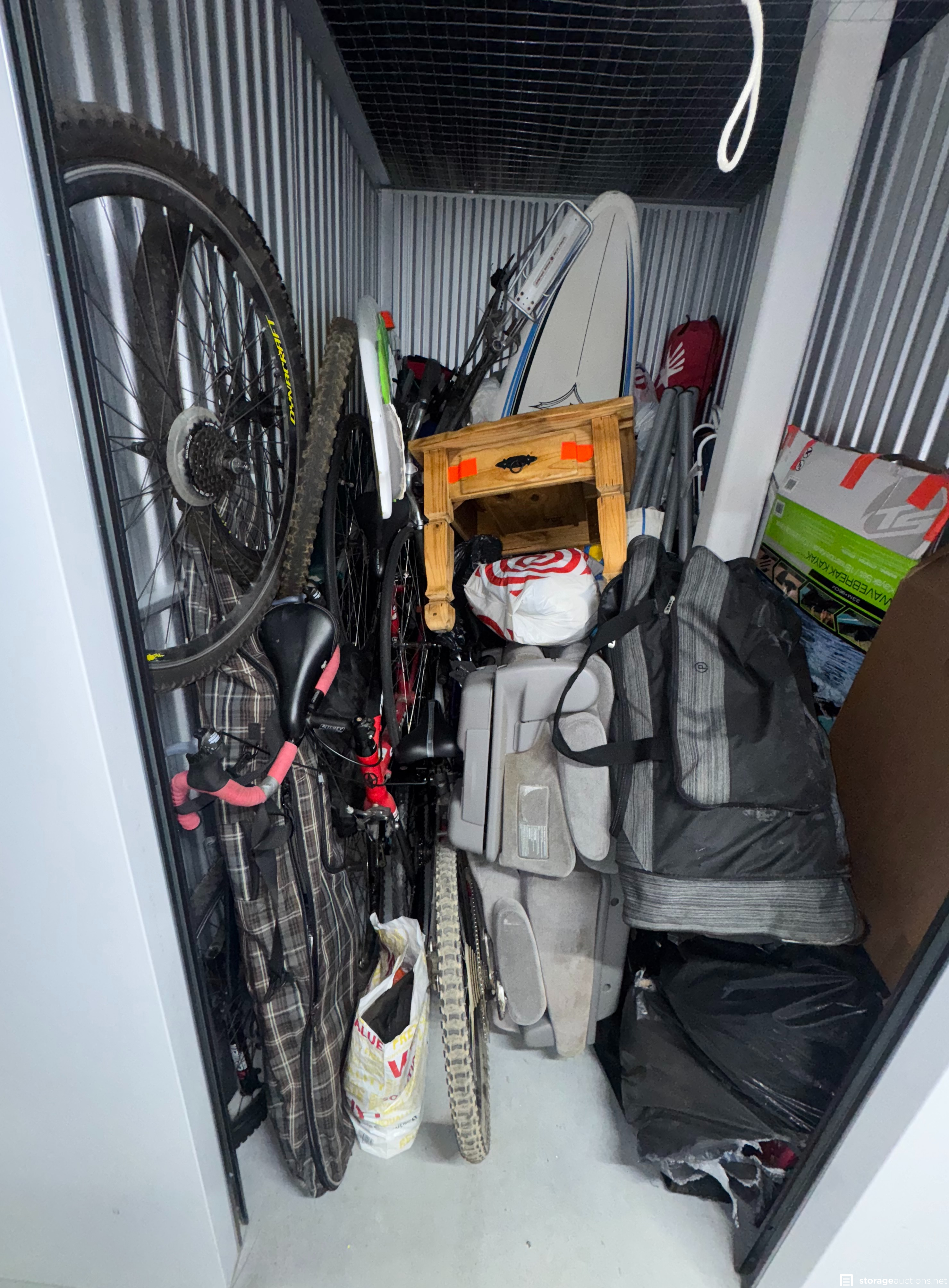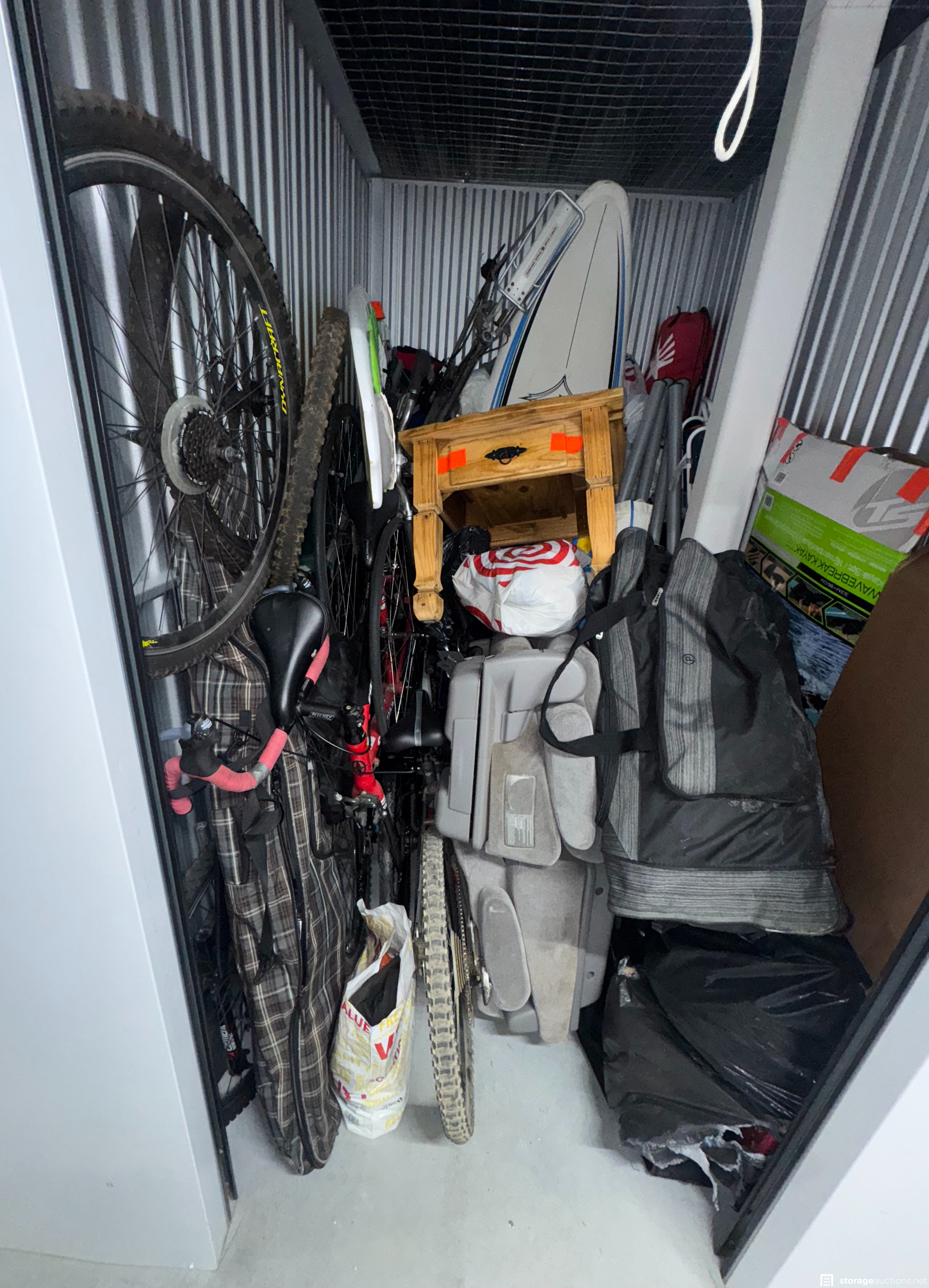 Appears to be Bikes, Surfboard, Paddleboard, bags, boxes, Side Table, Clothing.