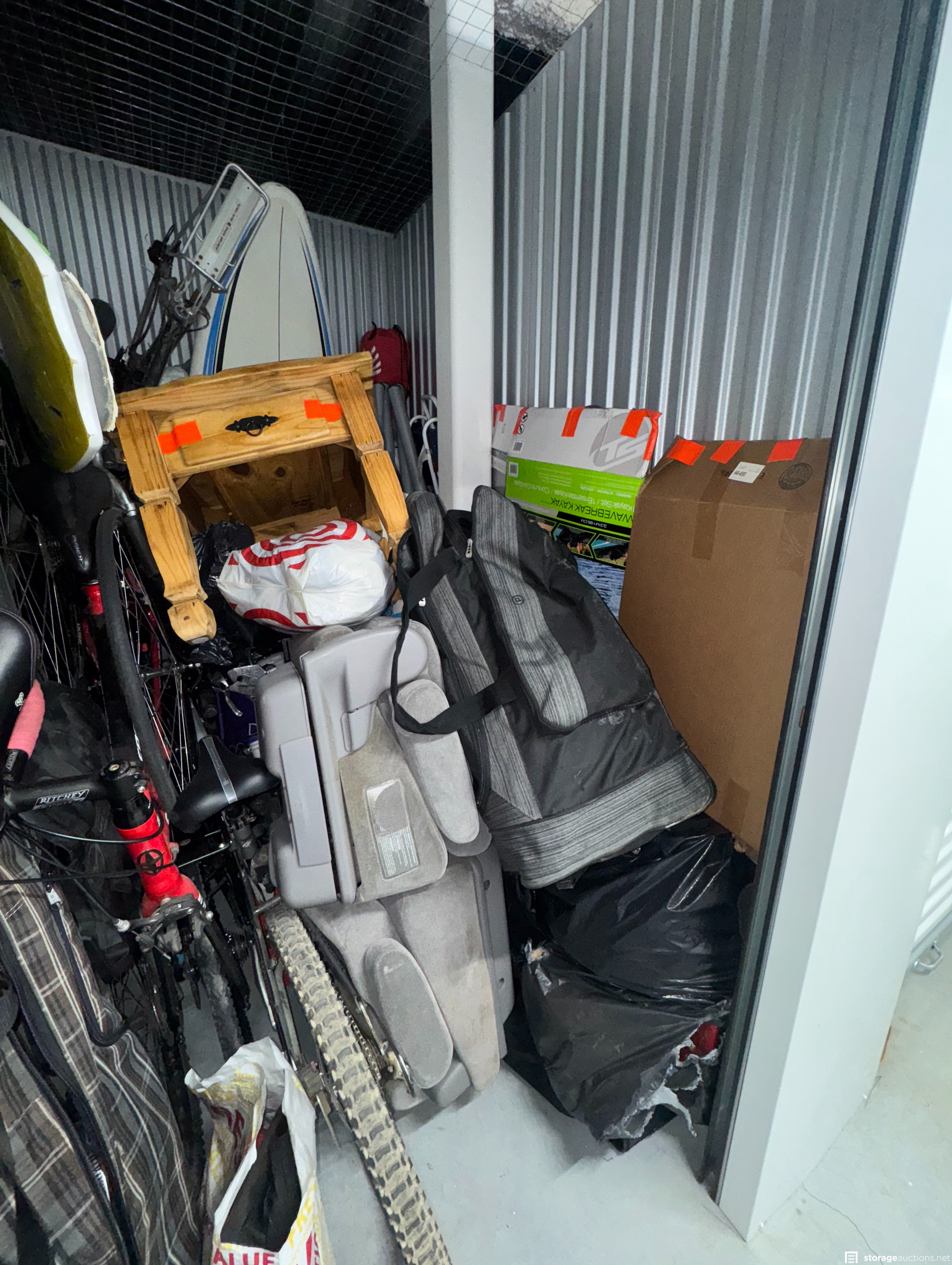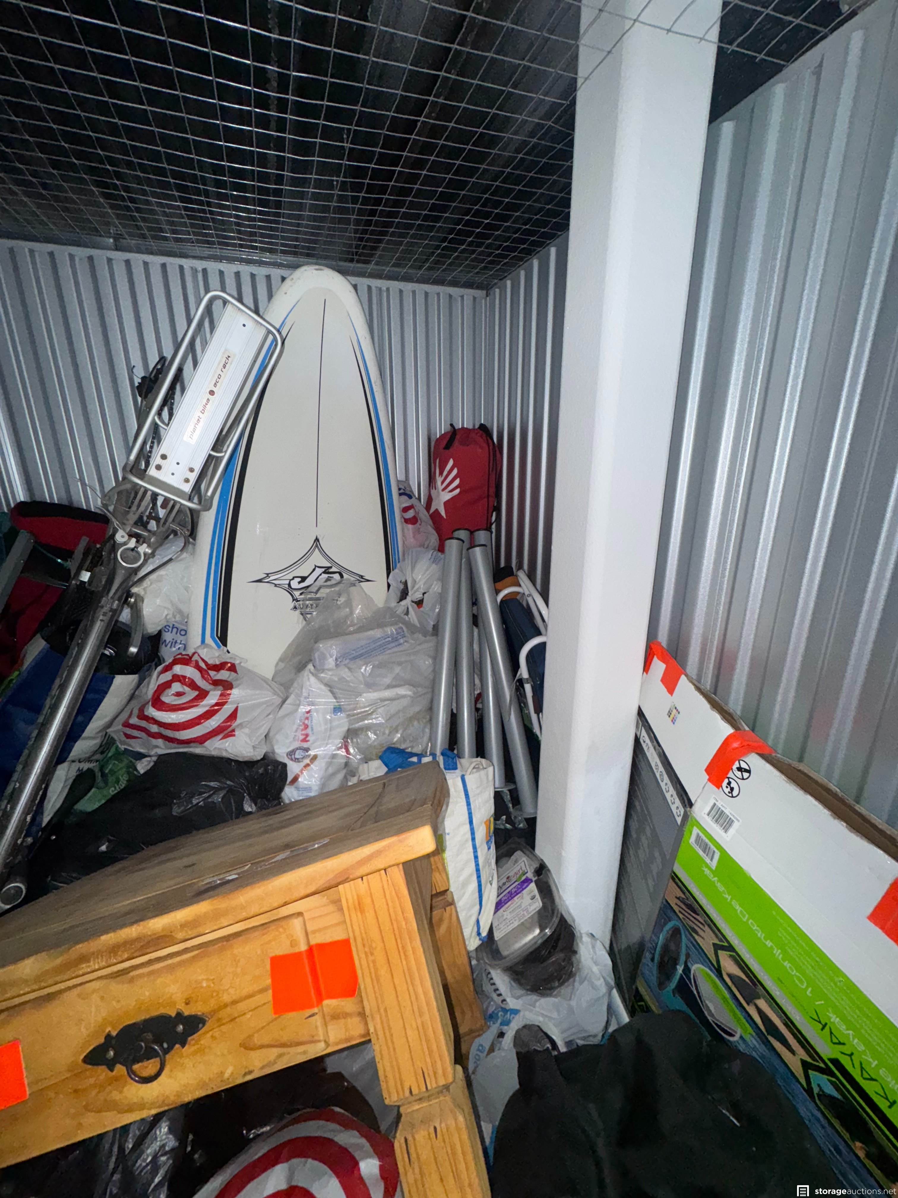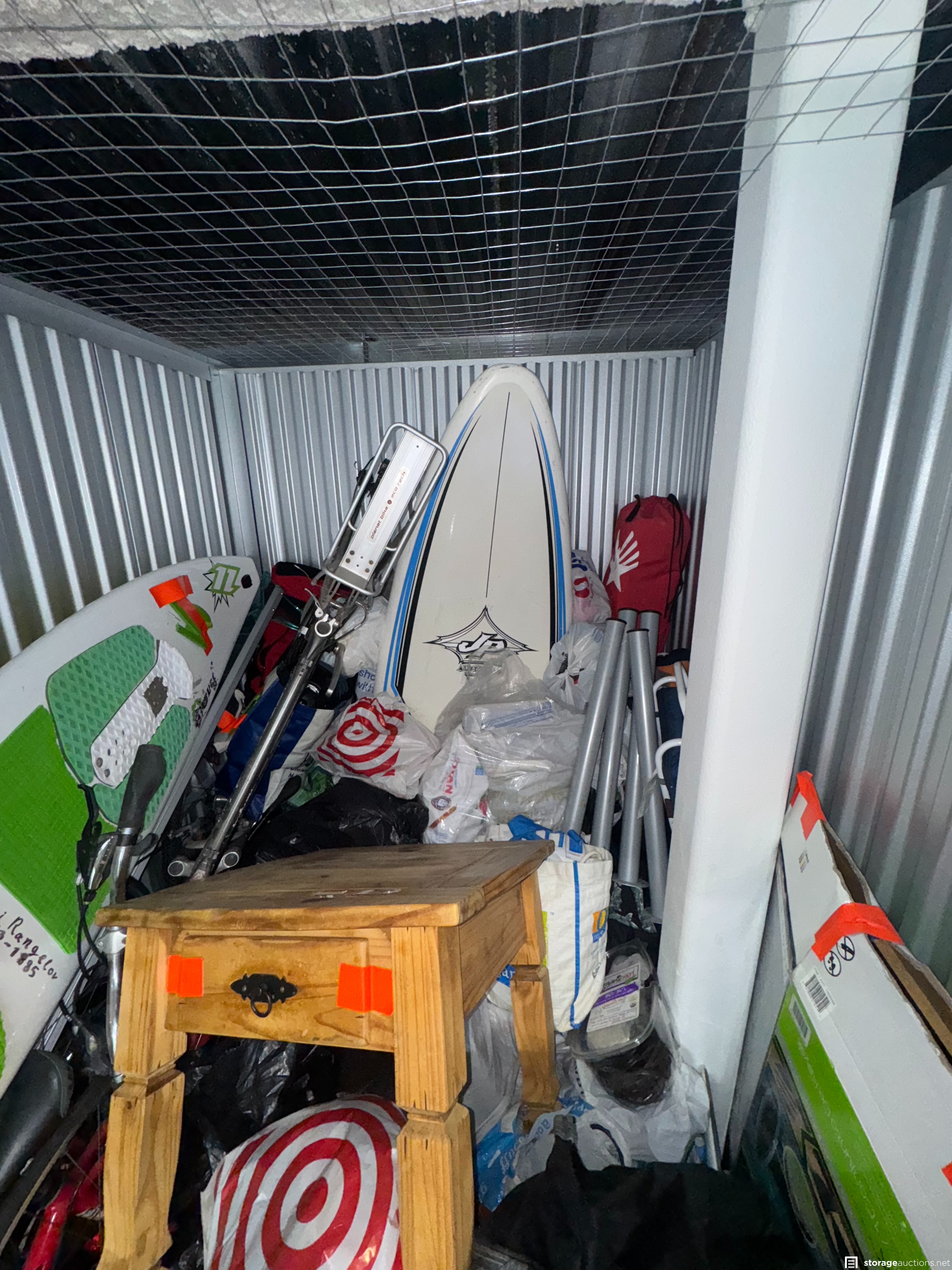 Appears to be Bikes, Surfboard, Paddleboard, bags, boxes, Side Table, Clothing.