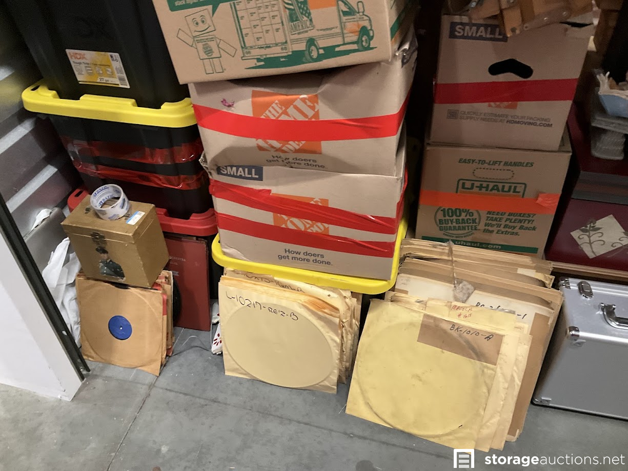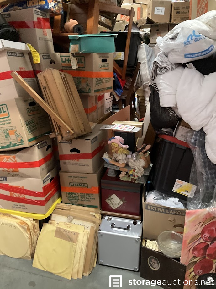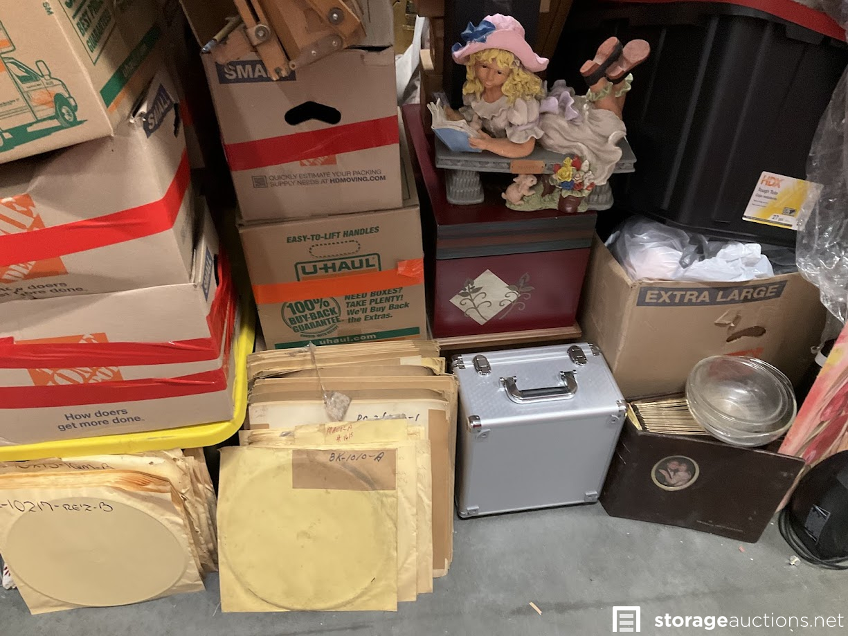 Boxes, bedding, clothing, shoe box, bins, wall art, vinyl records, statue, totes