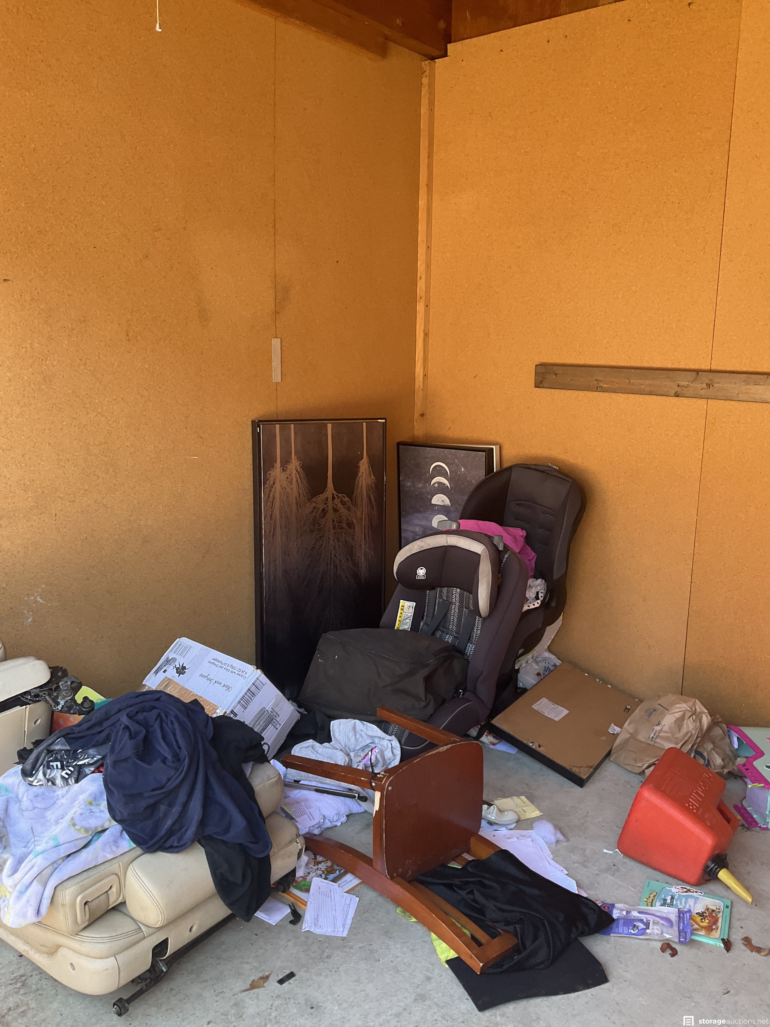 Unit appears to contain car seats, chairs, wall art, cooler, clothing, toys, etc.