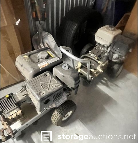 Micelllaneous boxes, various wrapped furniture, suitcase, pressure washers (2), one tire, Bed frame.