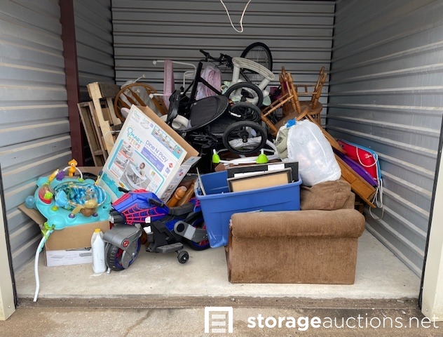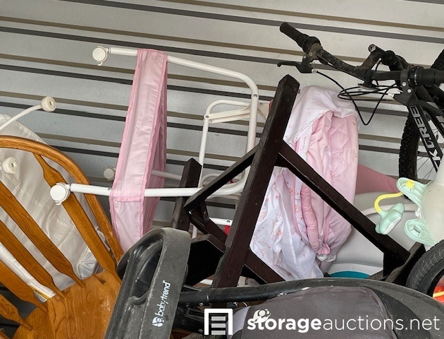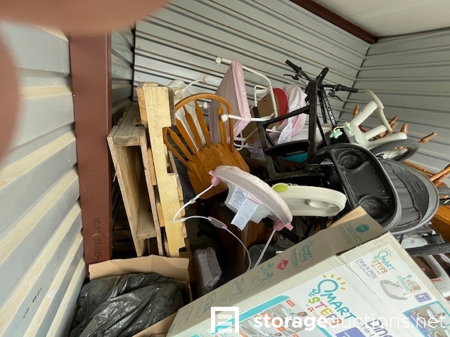 This unit seems to contain: Furniture, dining room table & chairs, baby items, strollers, bicycle, clothes, child's battery-operated motorcycle, Household items, and misc. items.
