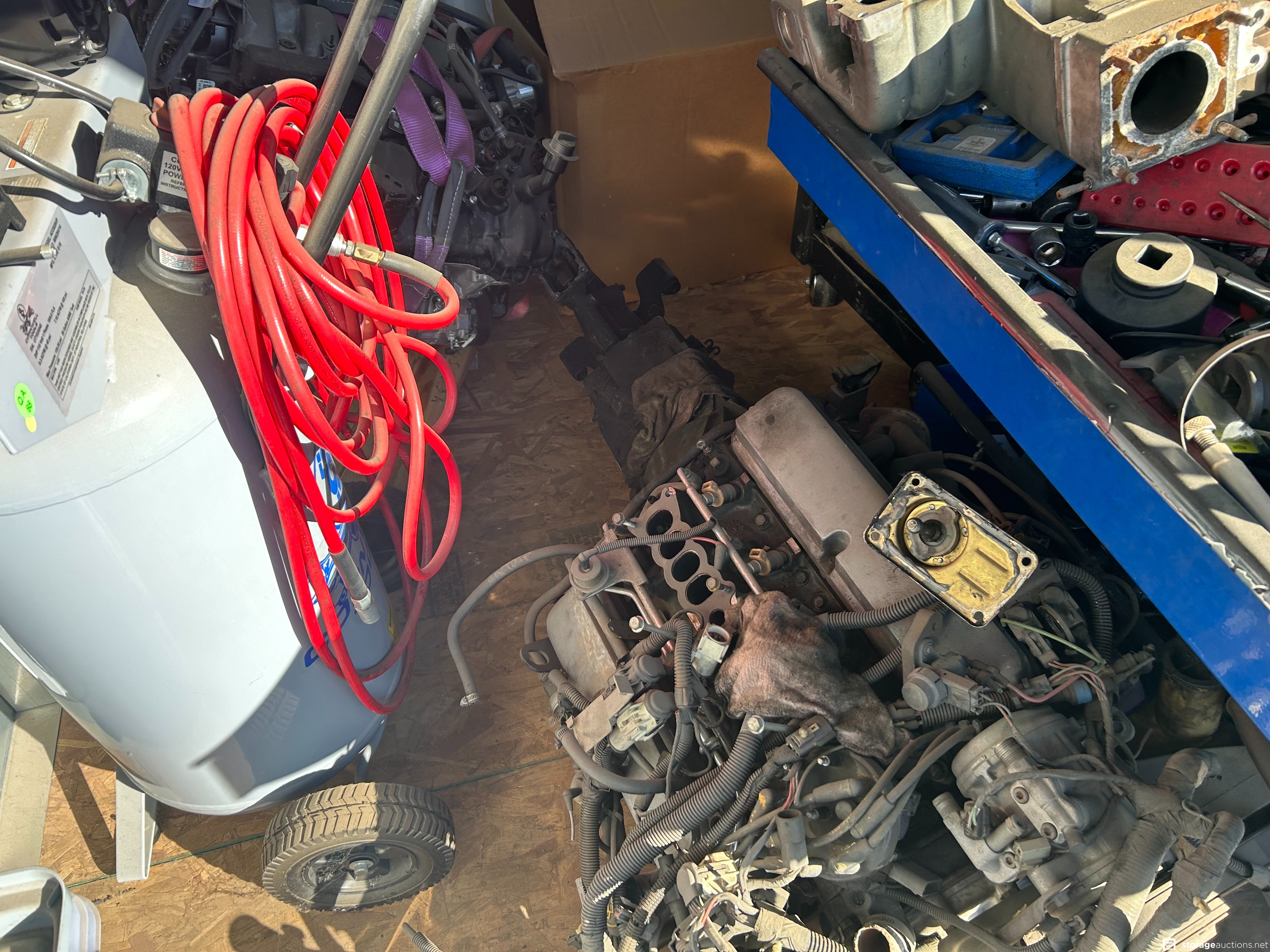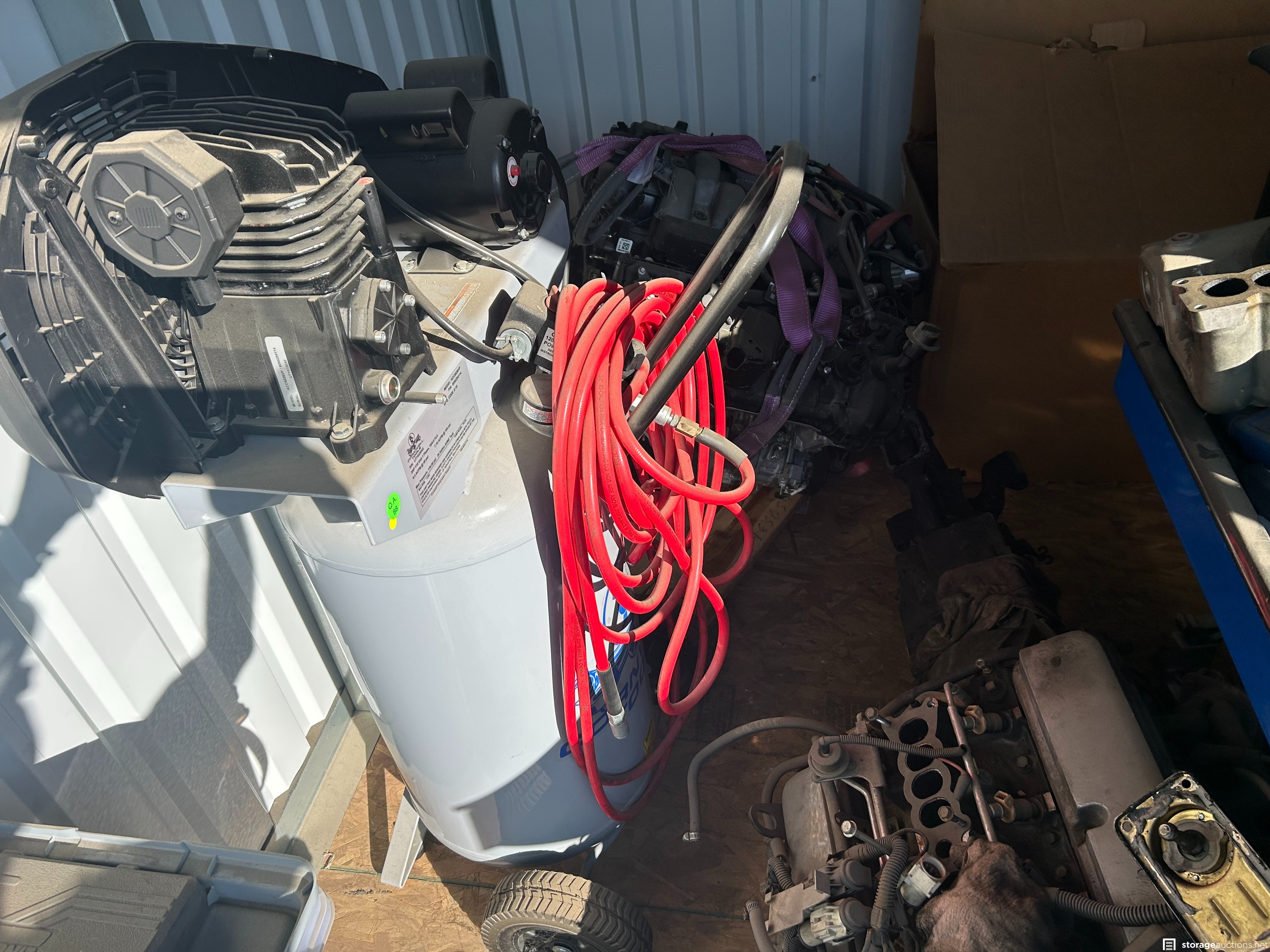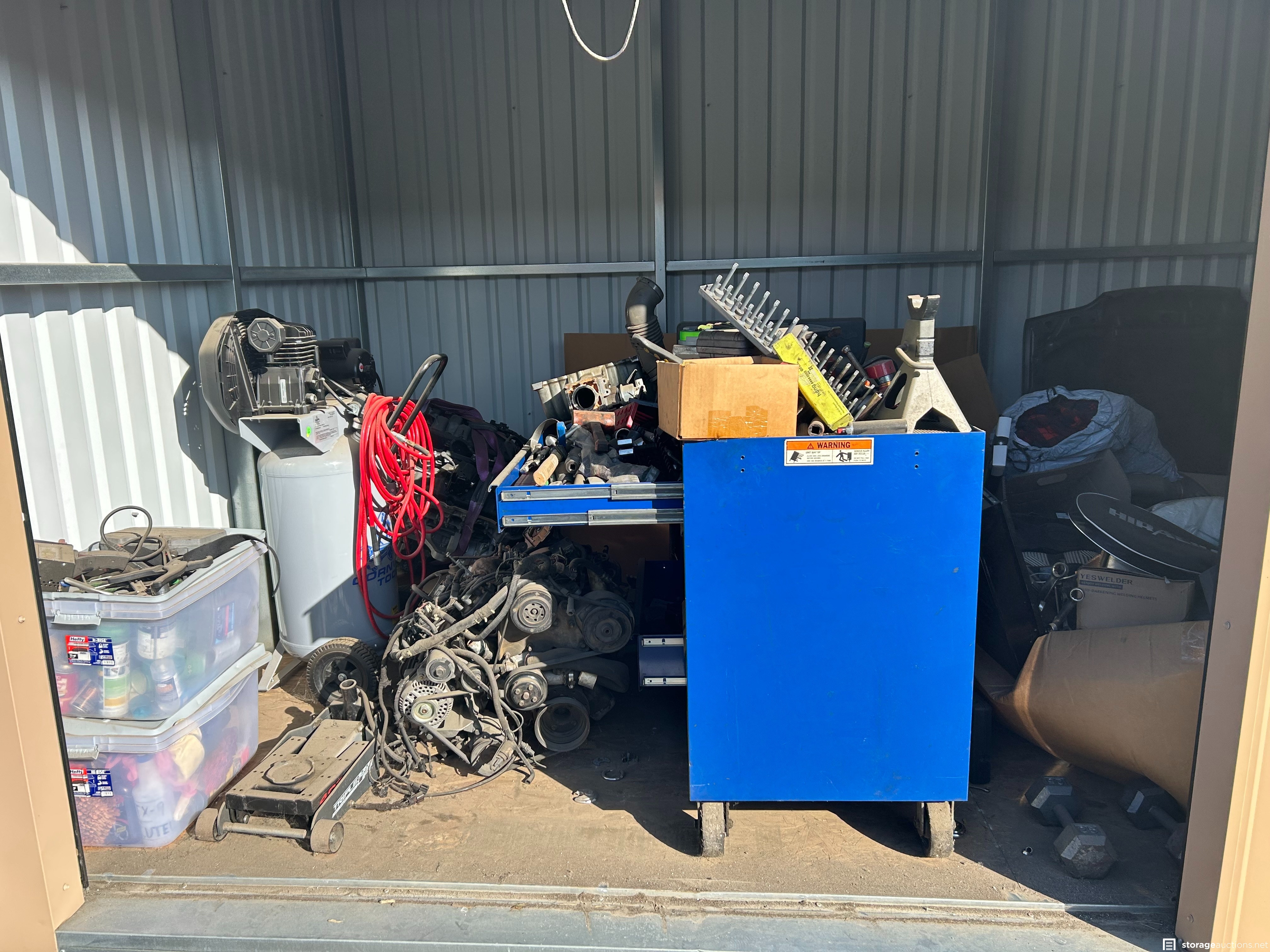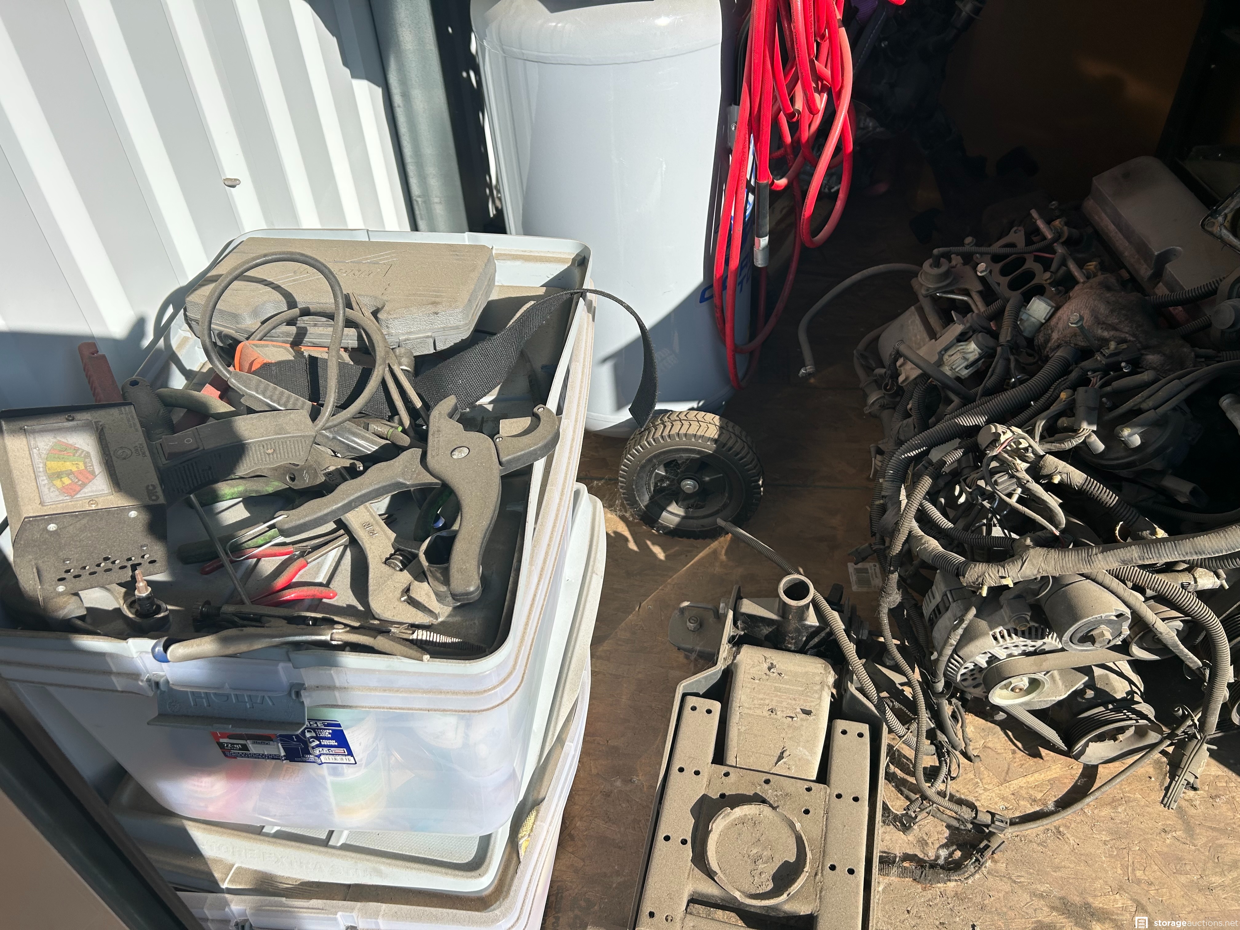 Auto parts, ice chest, wheels and tires, muffler, tools, exercise equip, air compressor, motors, mac toolbox, cornell toolbox, shoes, snap on tools, tool boxes new tools, electric scooter vacuum, totes.