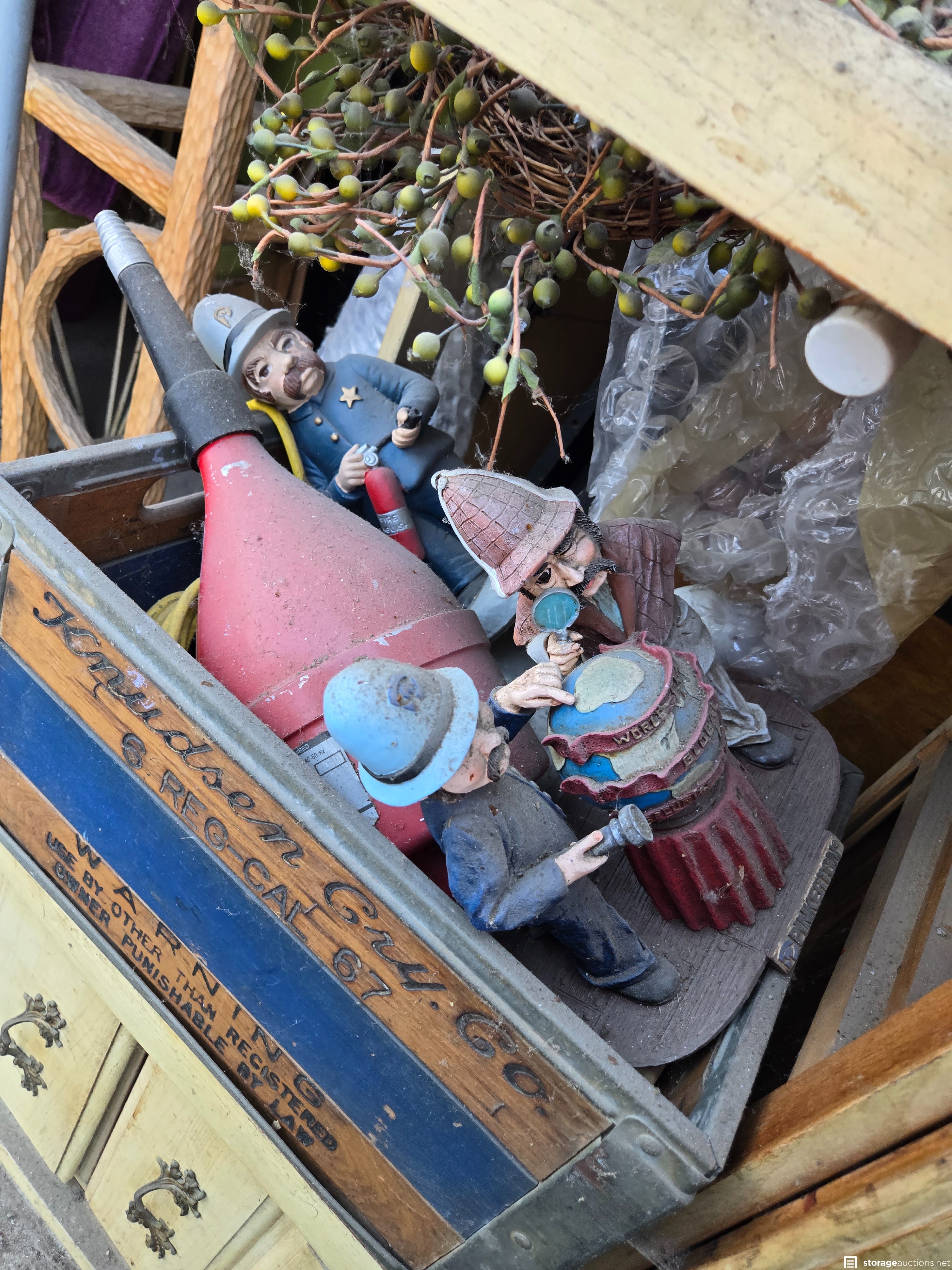 Furniture, furniture, dolly, skis, ladders, firemen figurines, faux plants, antique crates, etc.