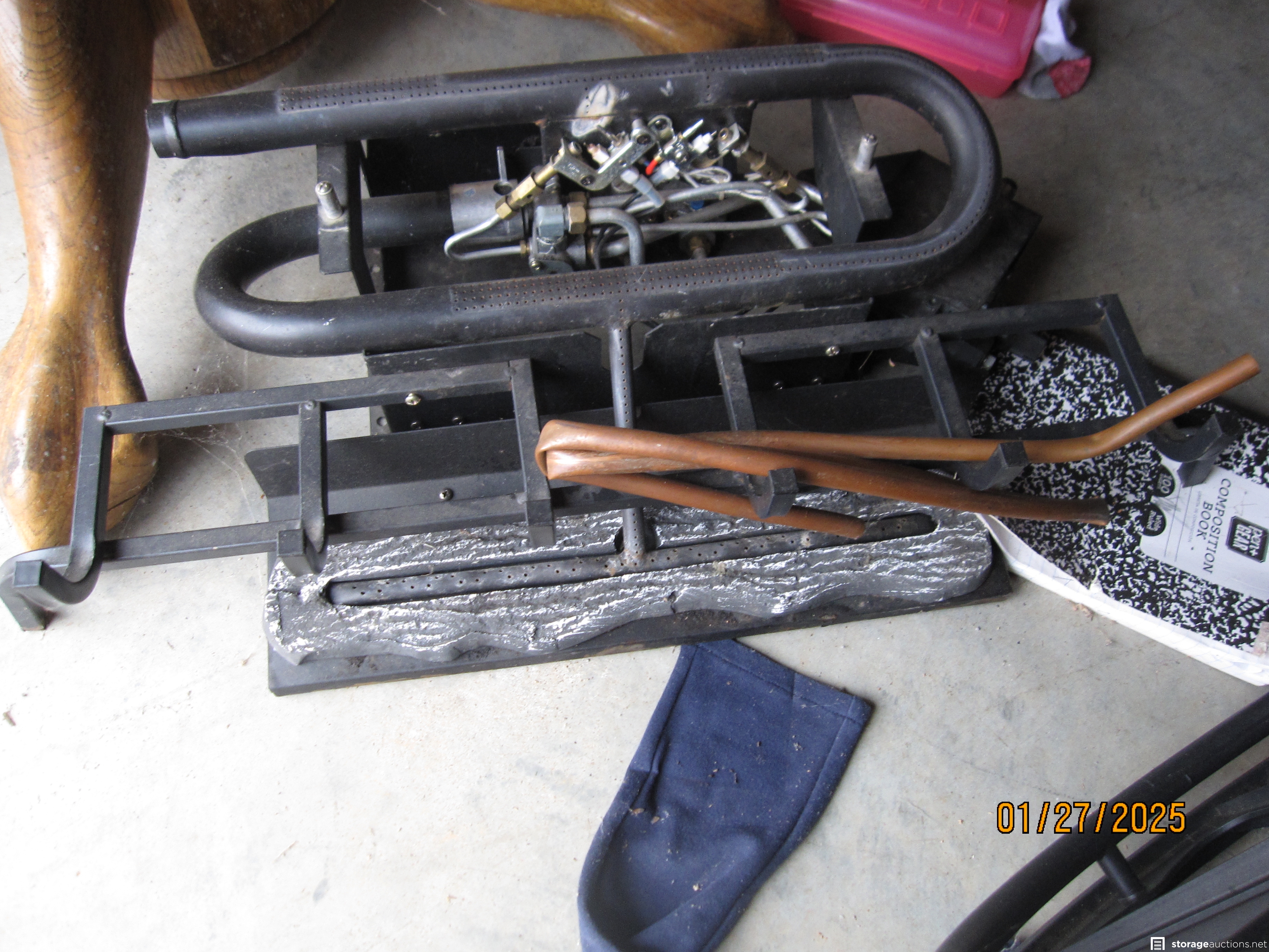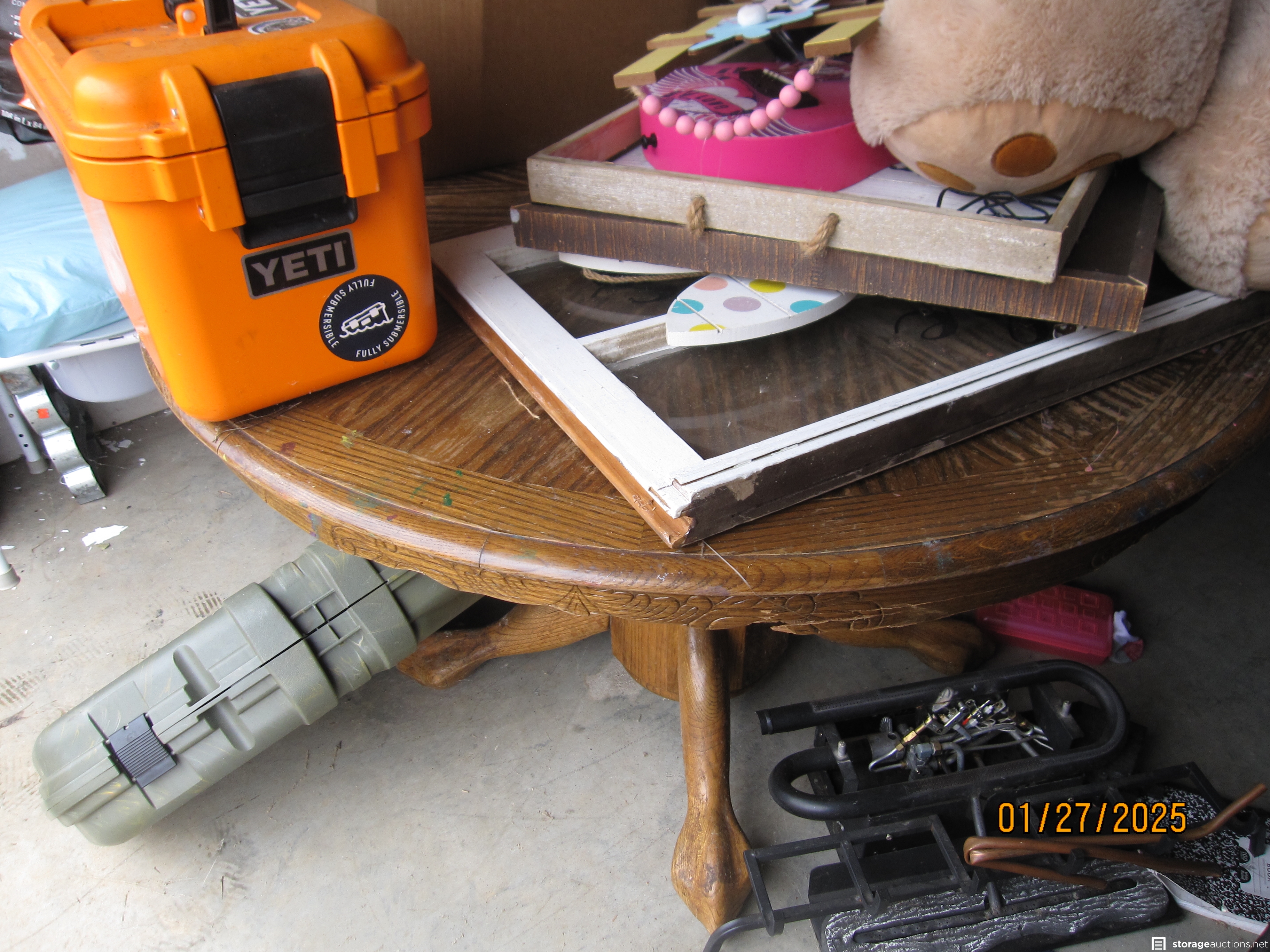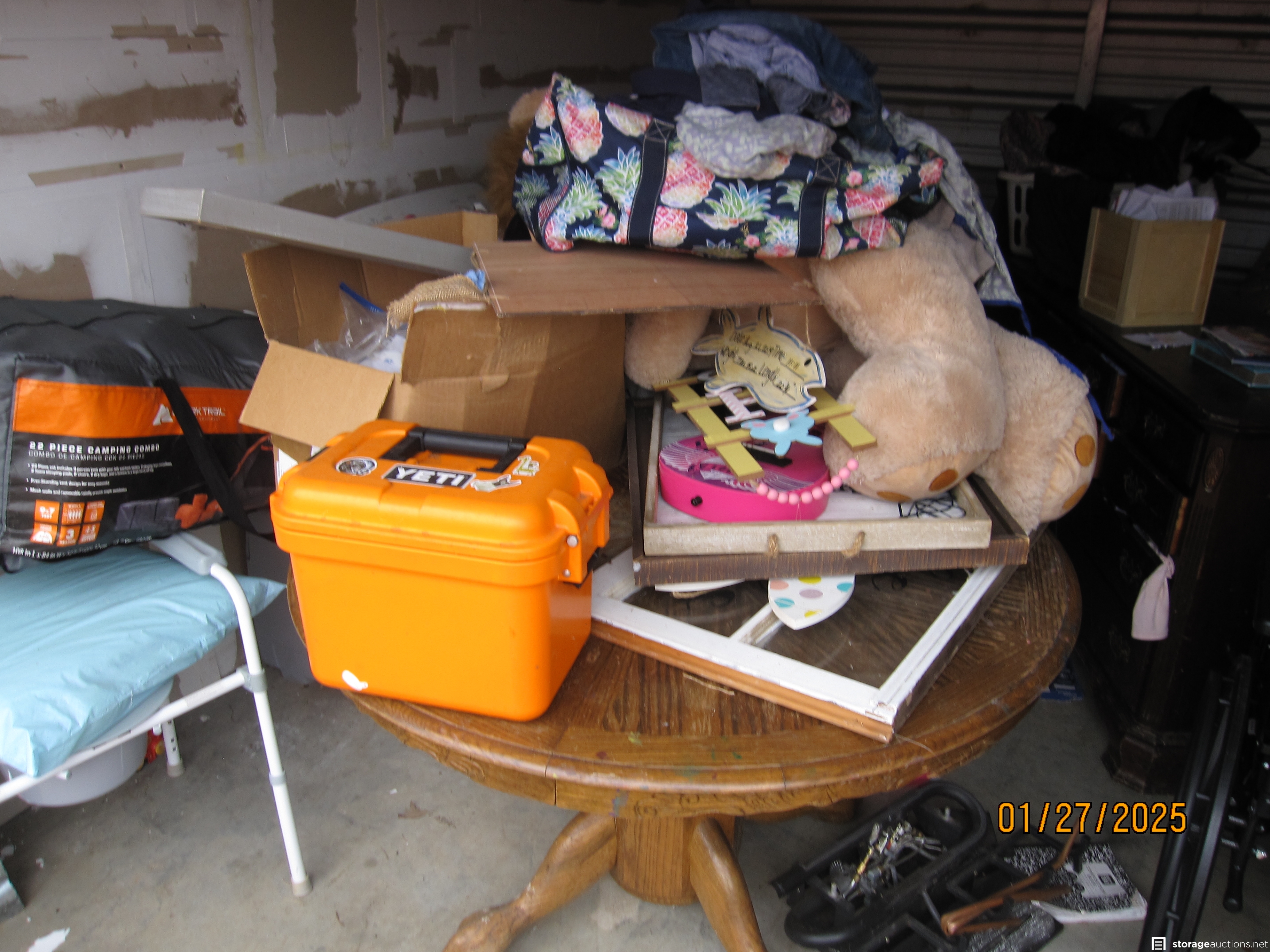 Dining table and chairs, other furniture, fireplace logs, washer and dryer, camping tent, lot of boxes and other furniture pieces.