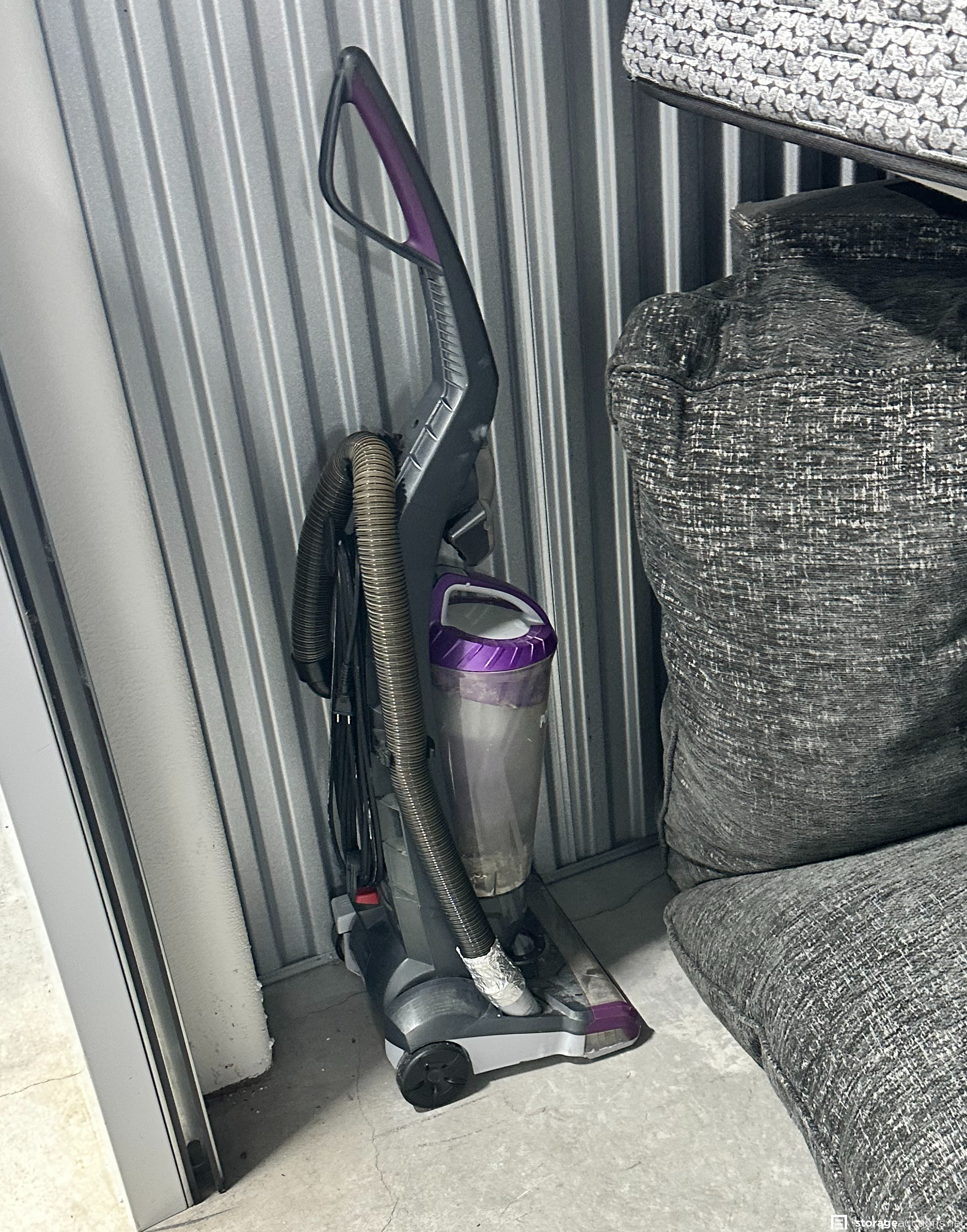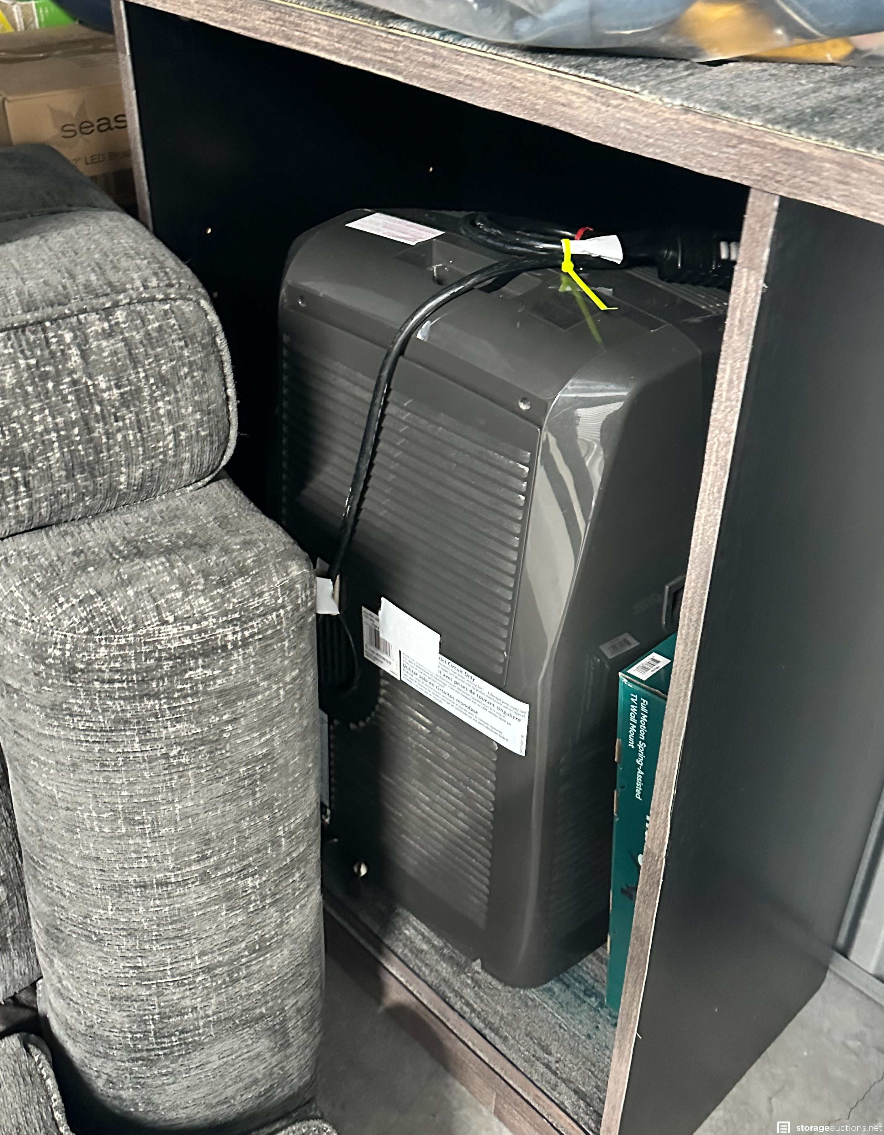 Unit appears to contain: AC unit, bed frame, box spring/mattress, boxes, ceiling fan, couch/sofa, coffee table, microwave.