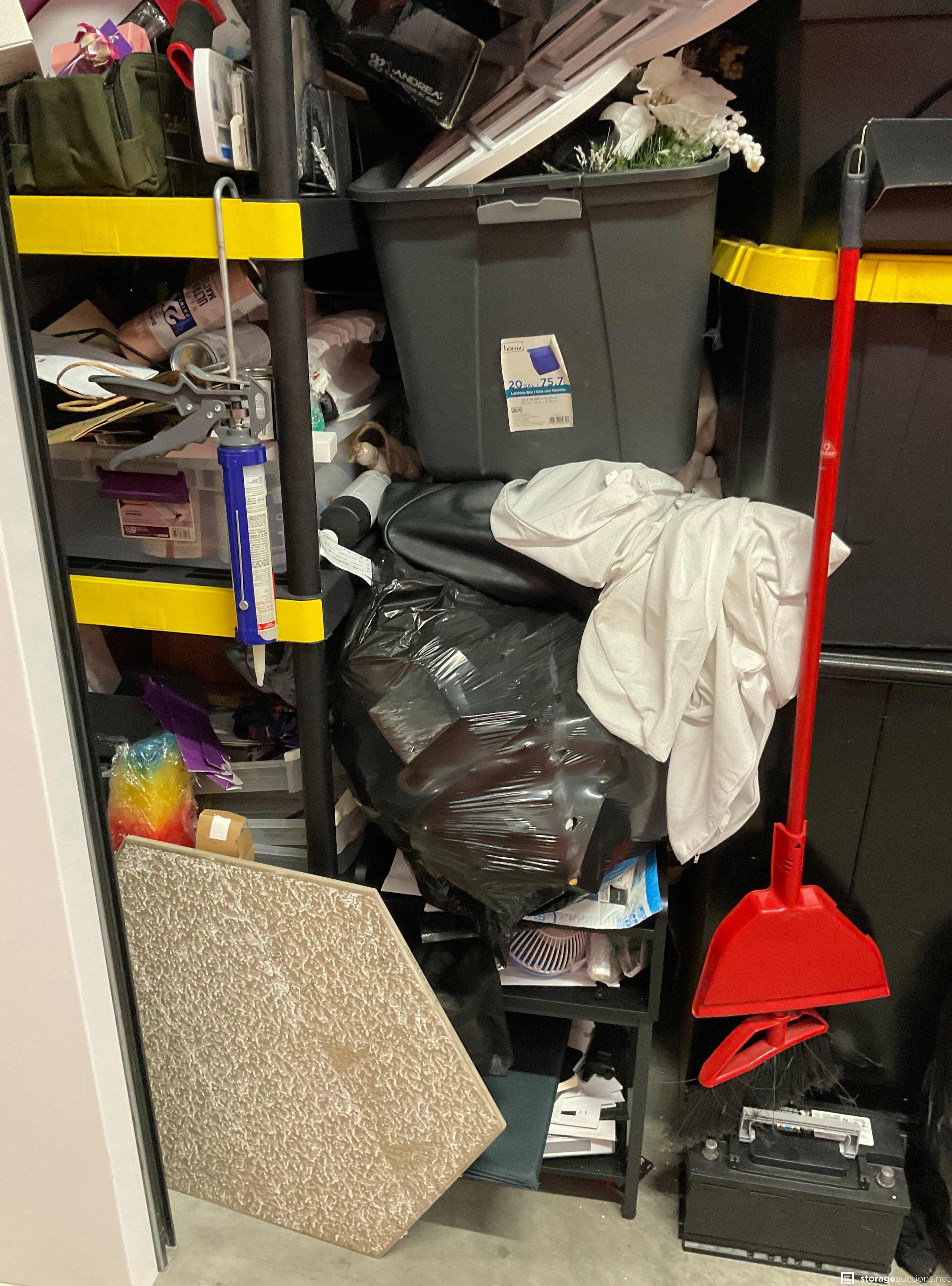 File cabinet, plastic tubs, shelf, table, fan, bags