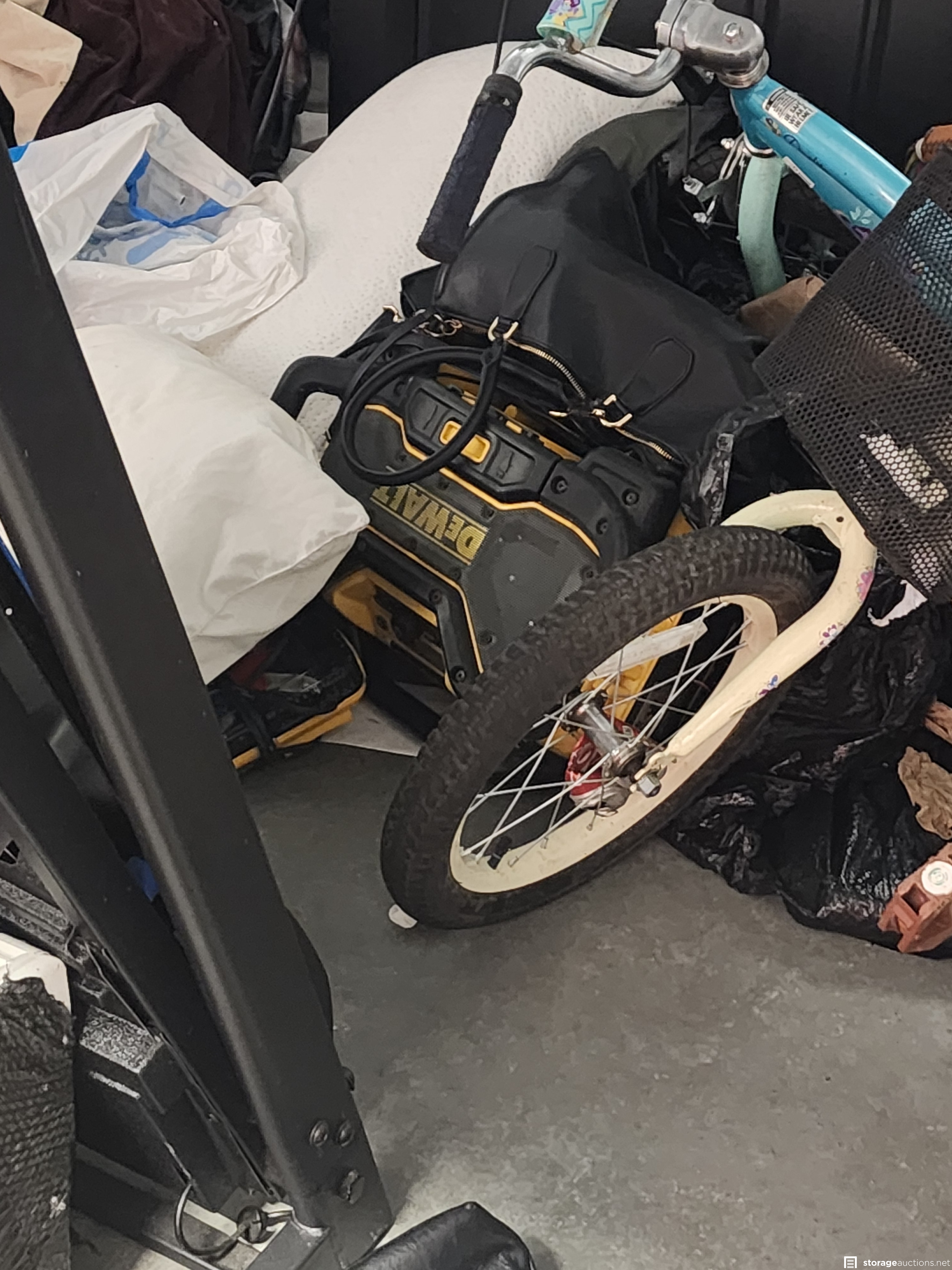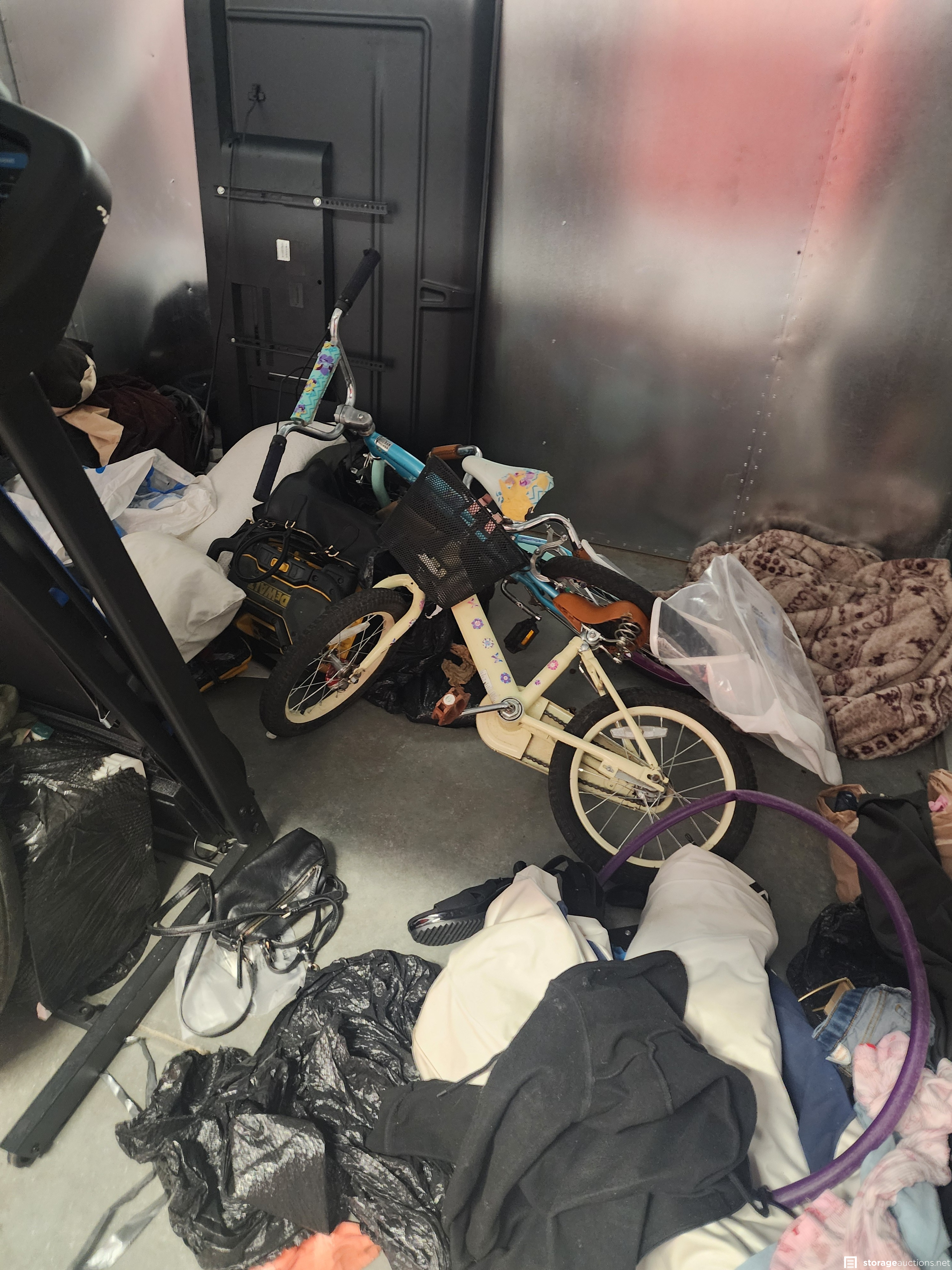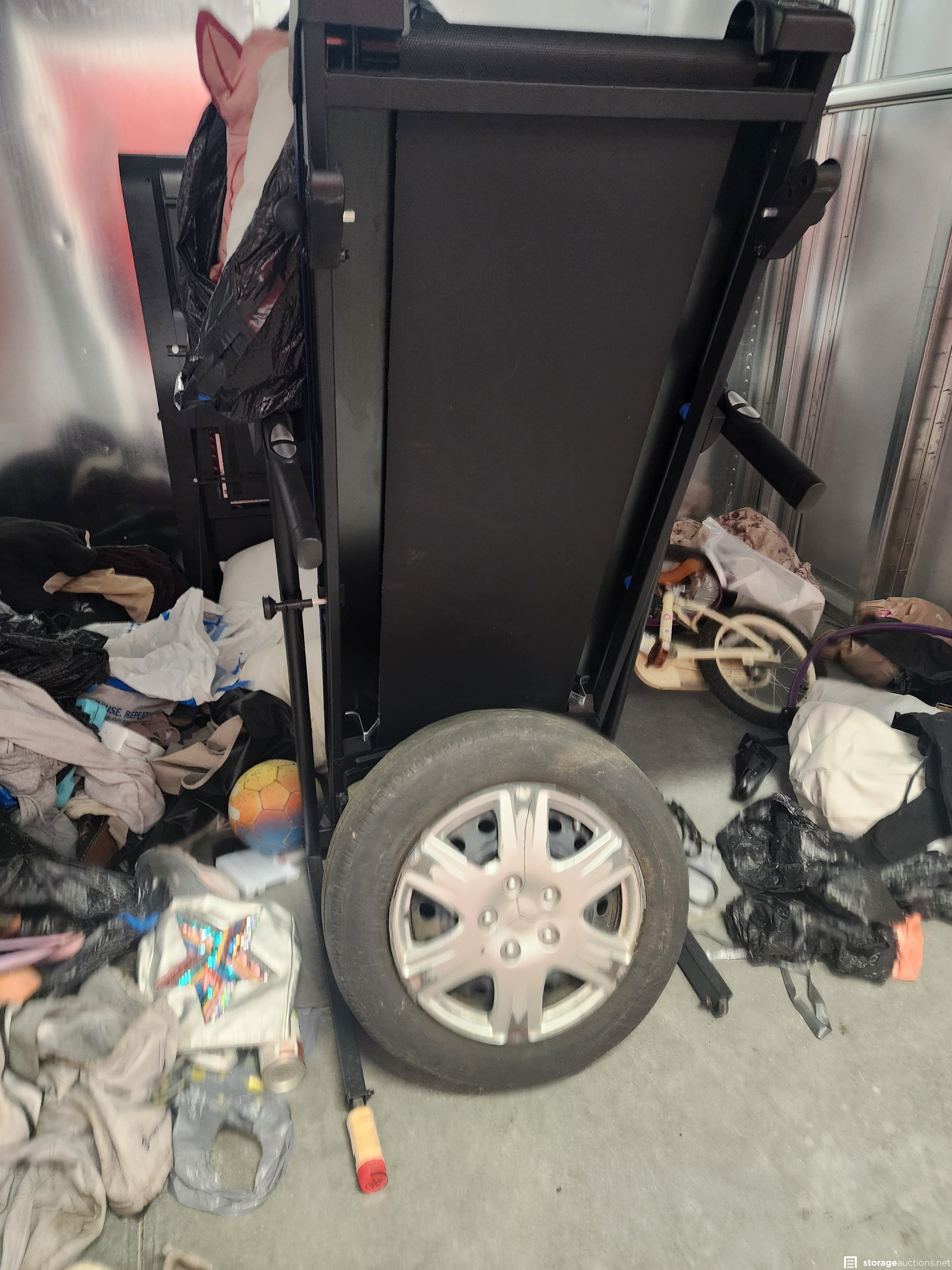 Unit appears to contain Car Tire With Tire rim, Clothes, 2 Kids Bikes, Treadmill, T.V., Hair Tools, Purse