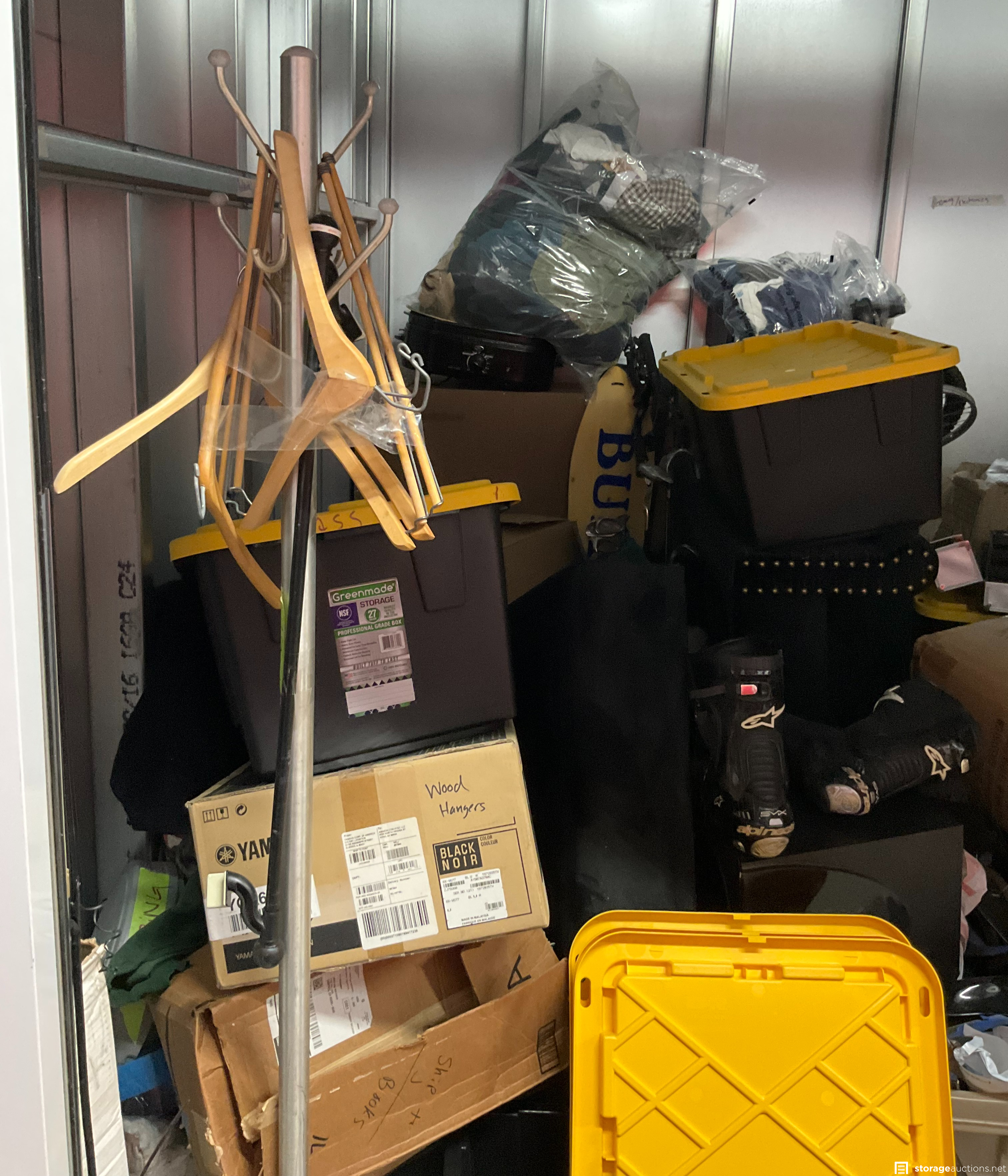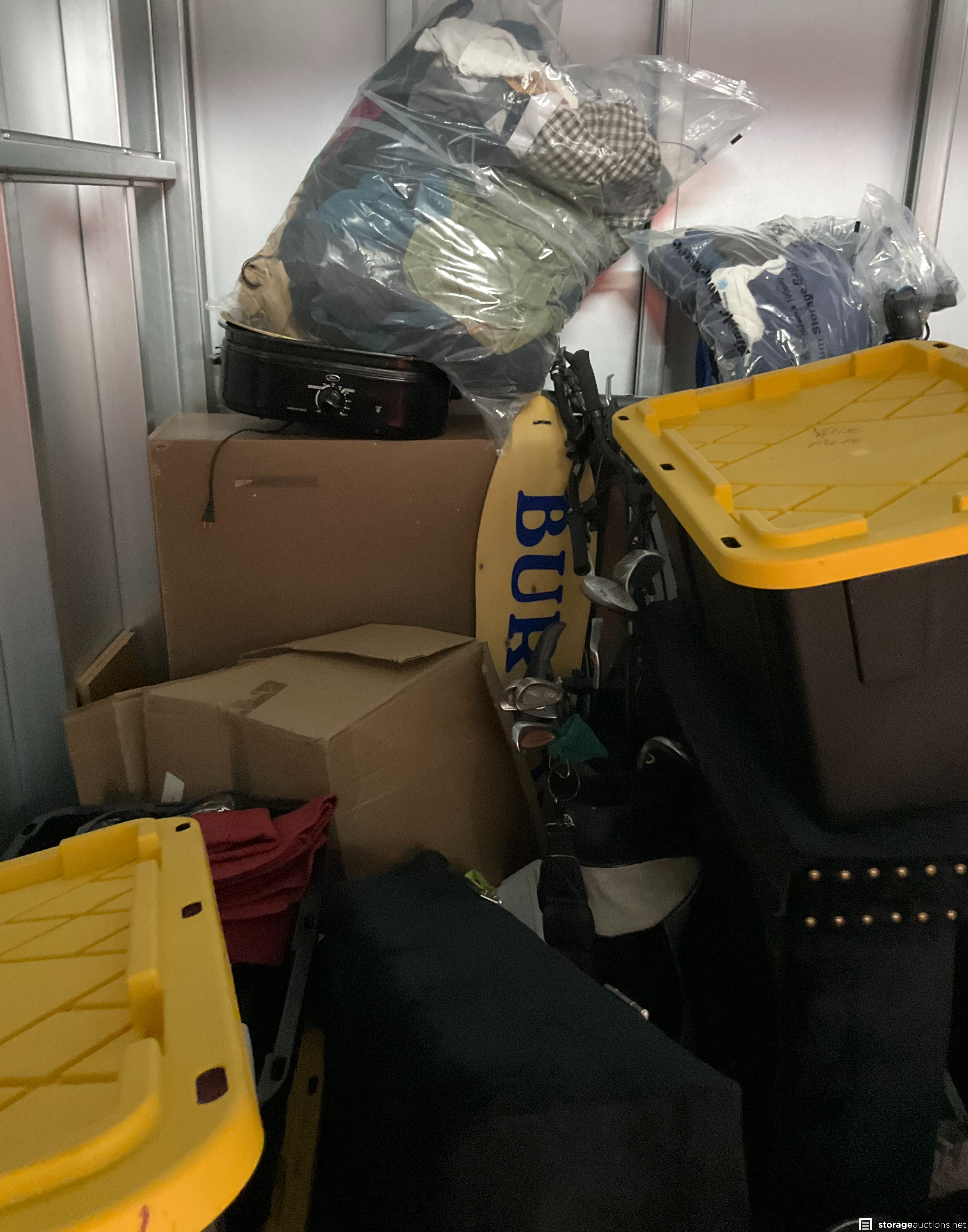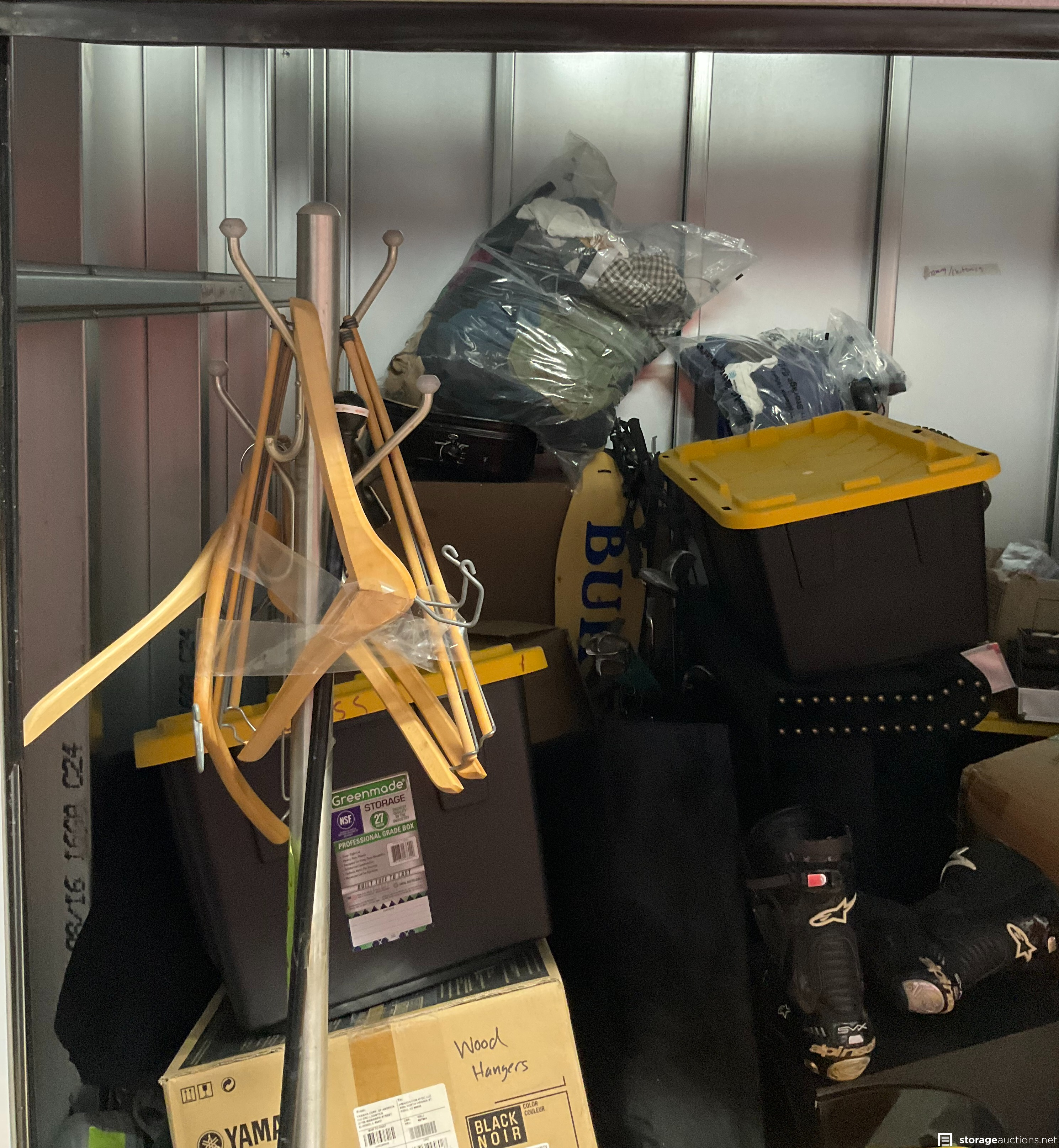 Coat Rack, Plastic Totes, Motorcycle Boots, Bike, Golf Clubs, Clothing, Boxes, Chair, Misc Items, Motorcycle Parts