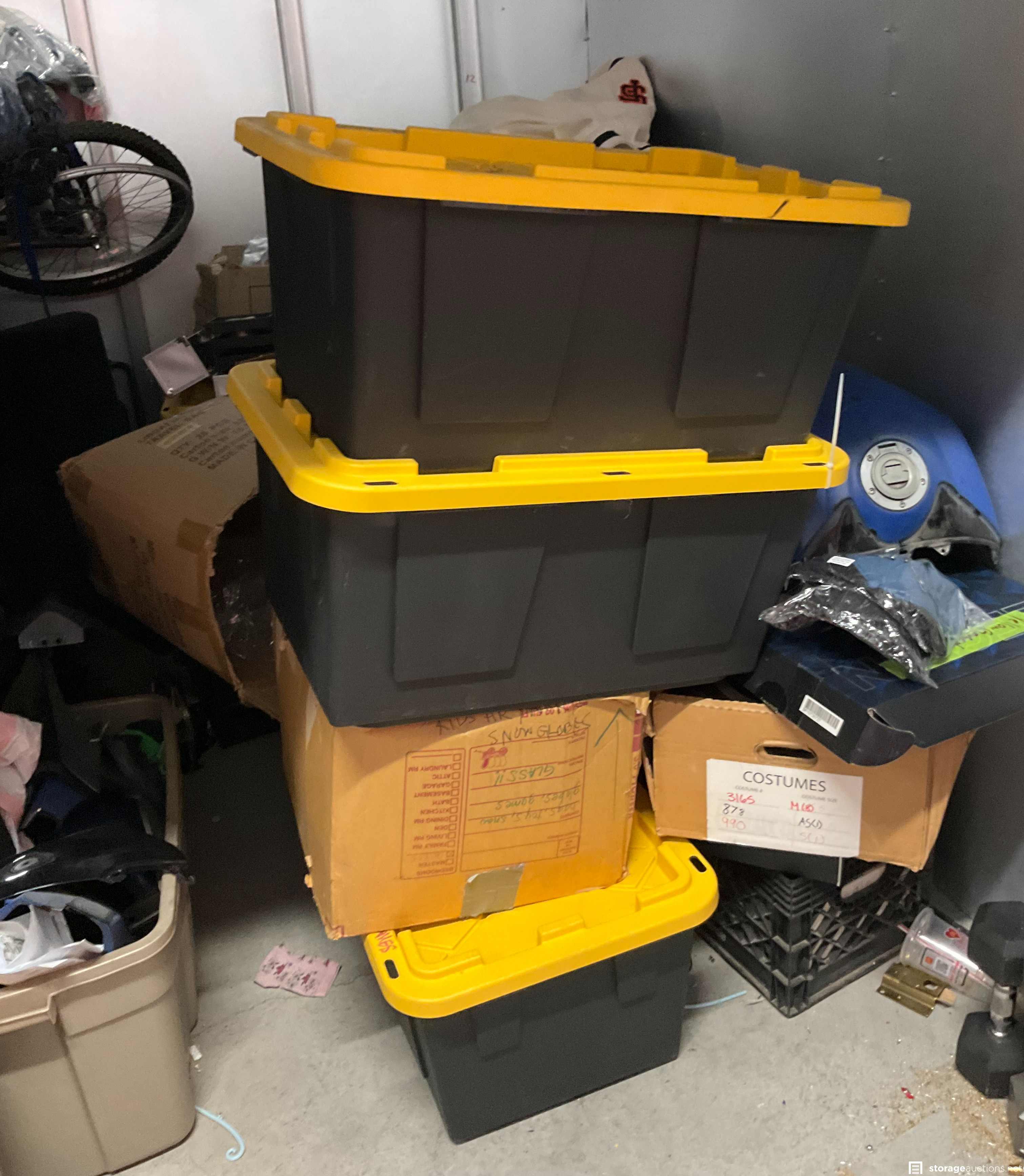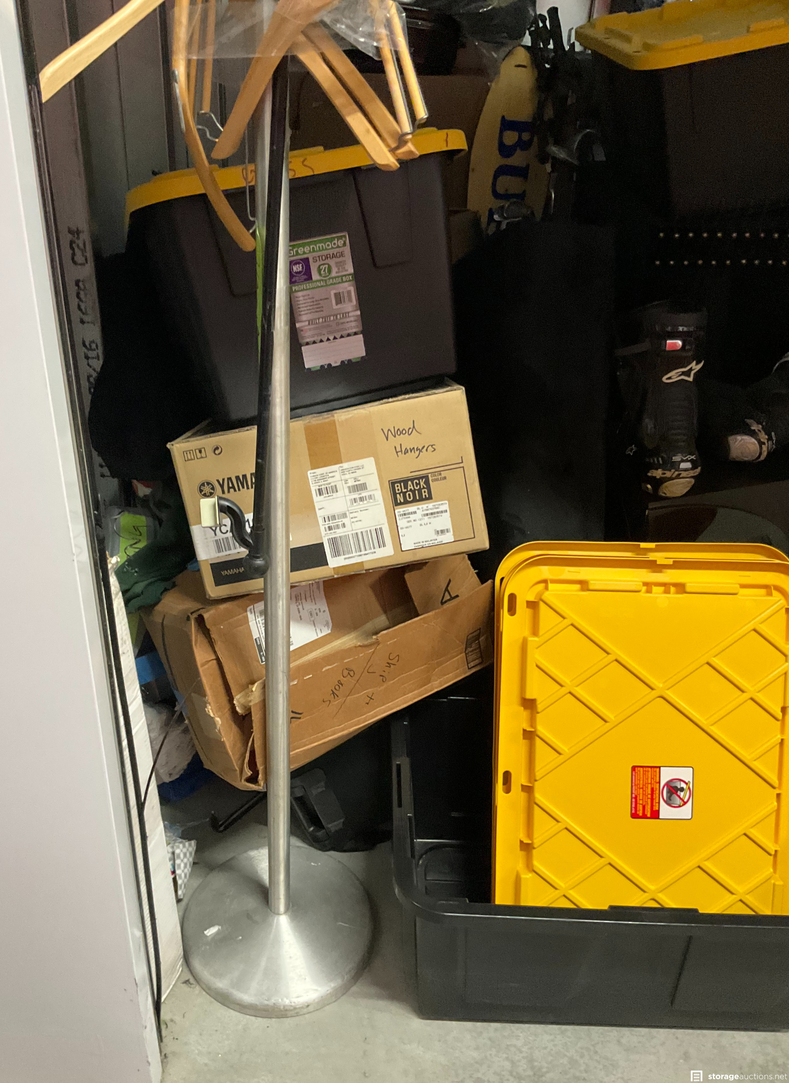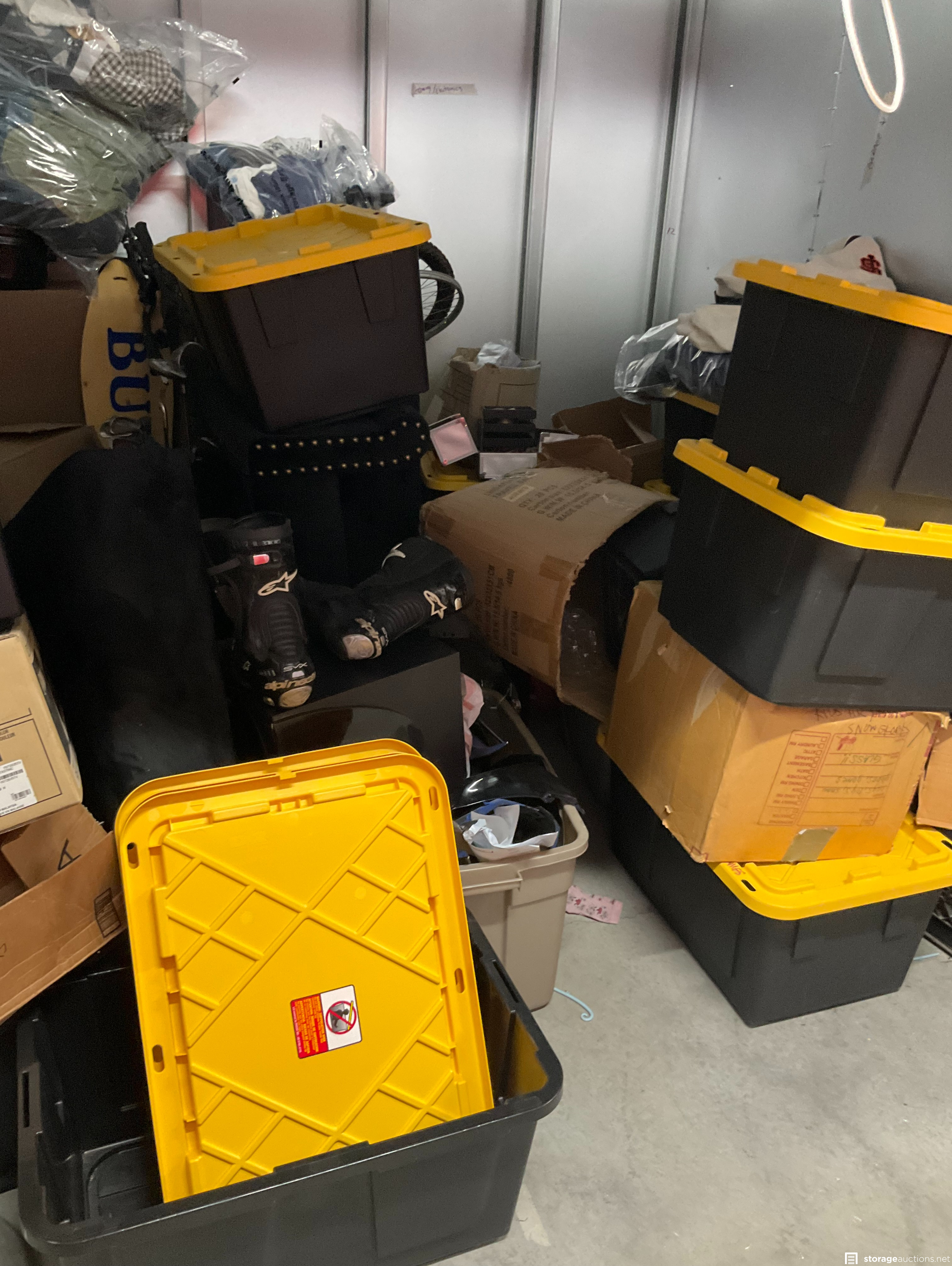 Coat Rack, Plastic Totes, Motorcycle Boots, Bike, Golf Clubs, Clothing, Boxes, Chair, Misc Items, Motorcycle Parts