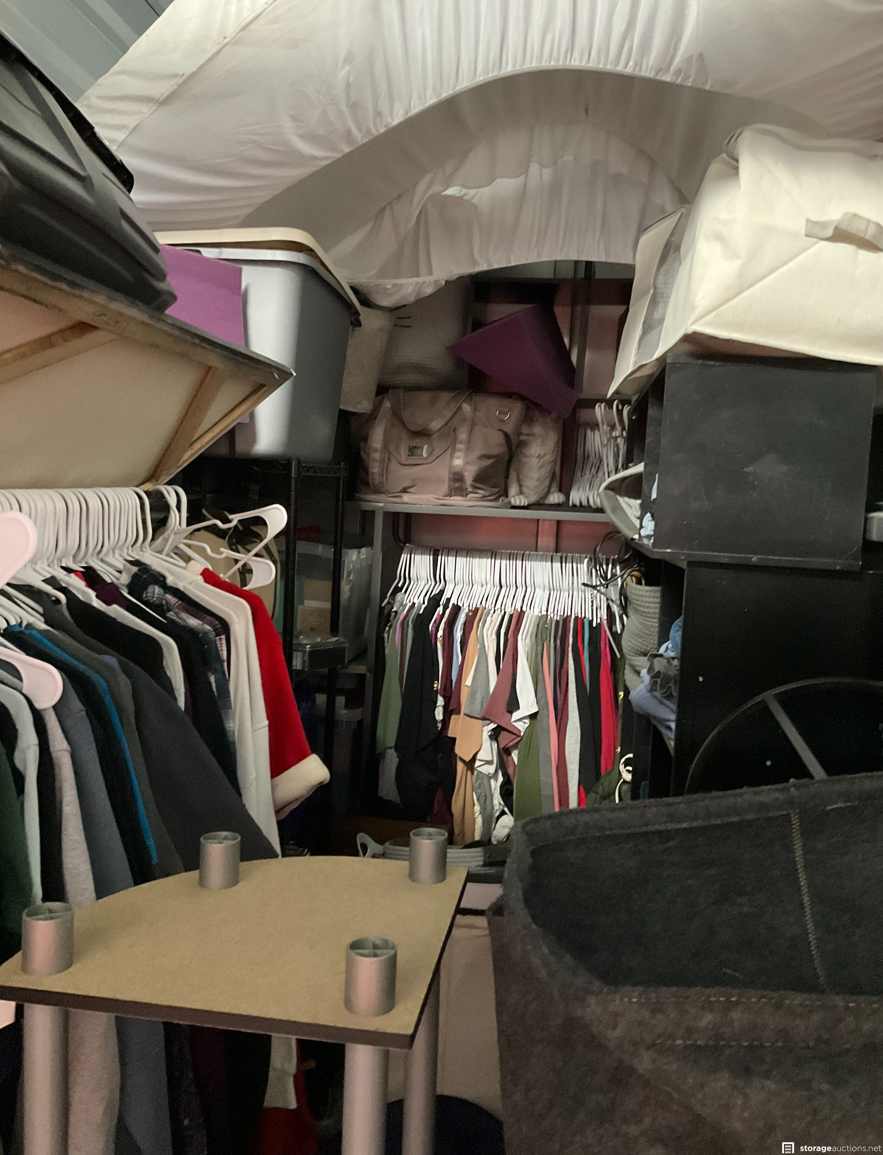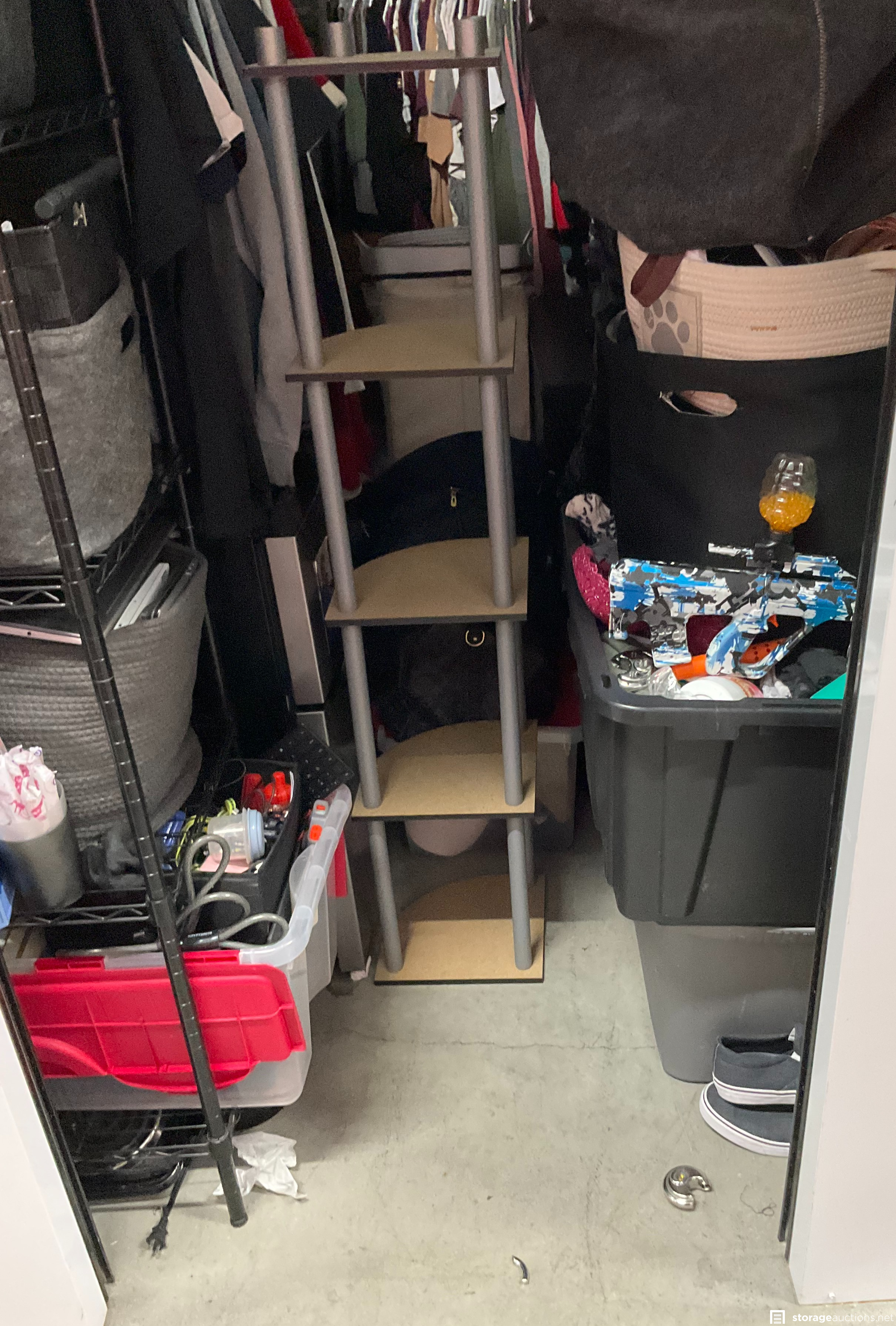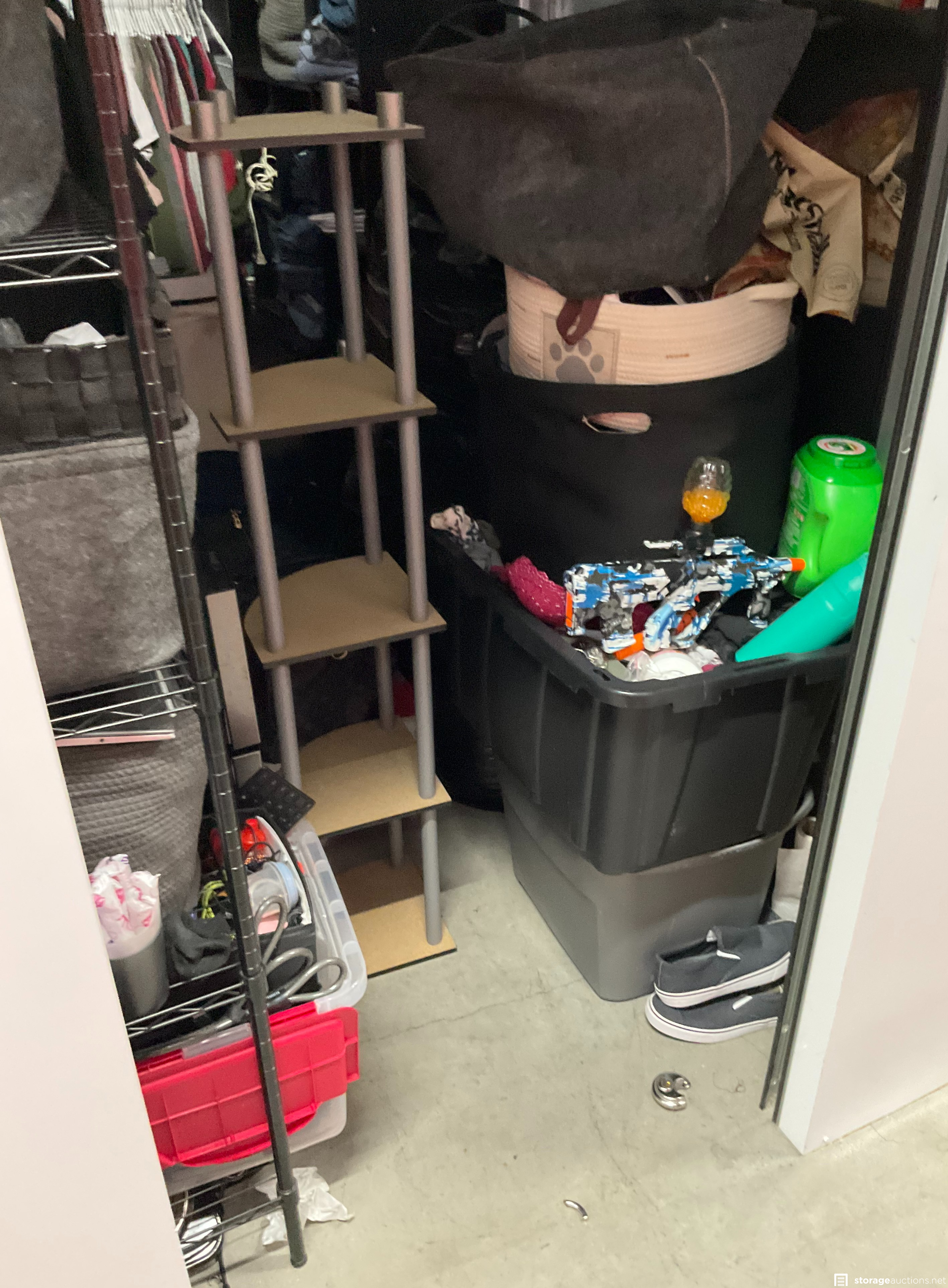 Shoes, Storage Bins, Plastic Totes, Mirror, Mattress, Metal Rack, Clothing, Misc Items, Animal Carrier, Laptop, Duffle Bag