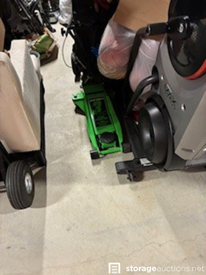 Appears to have Exercise bike,Boxes,Hand truck,Floor jack,Lawnmower,Fans.Bags,Totes.Toy,Chairs,Bar stools,.