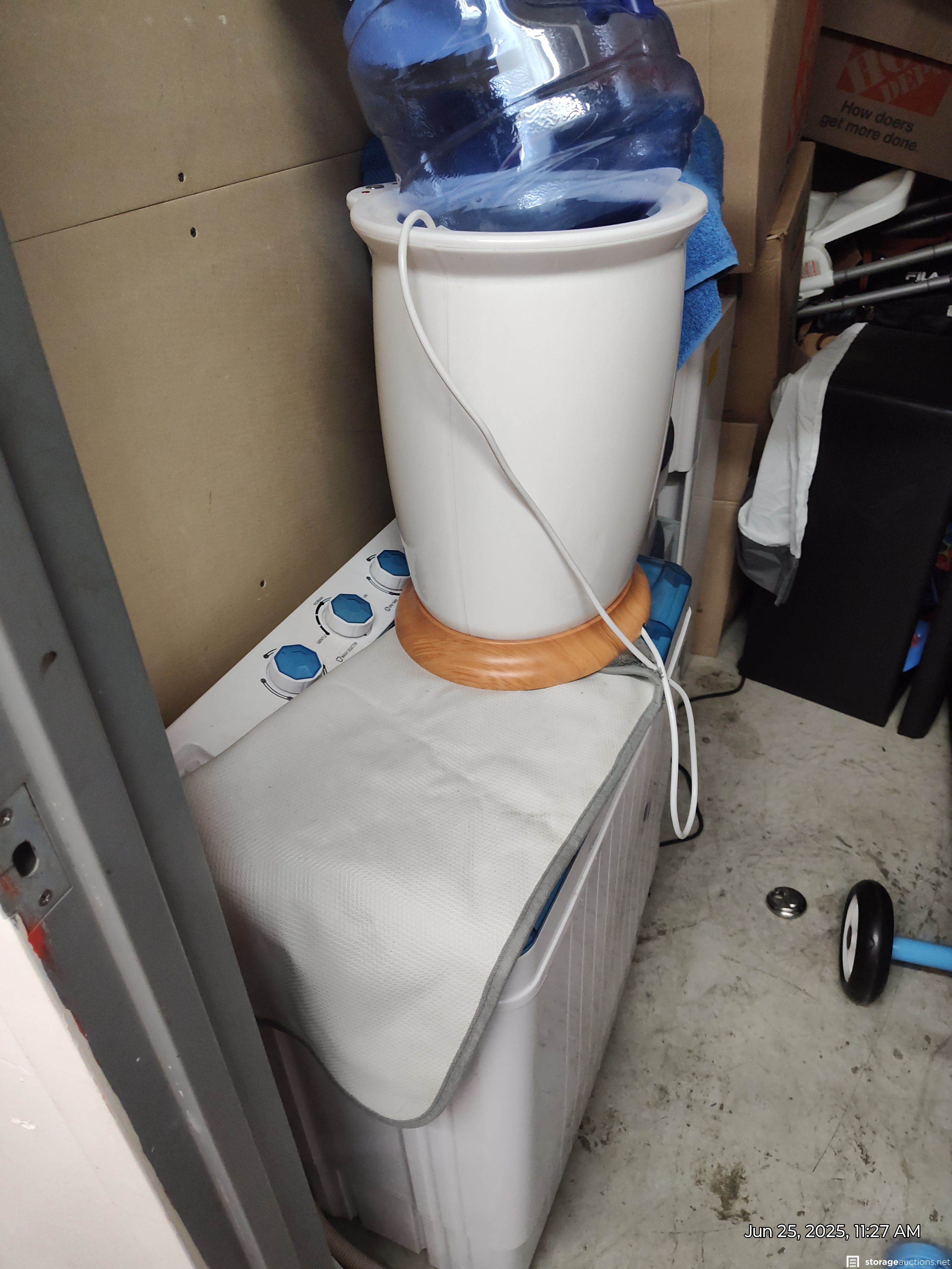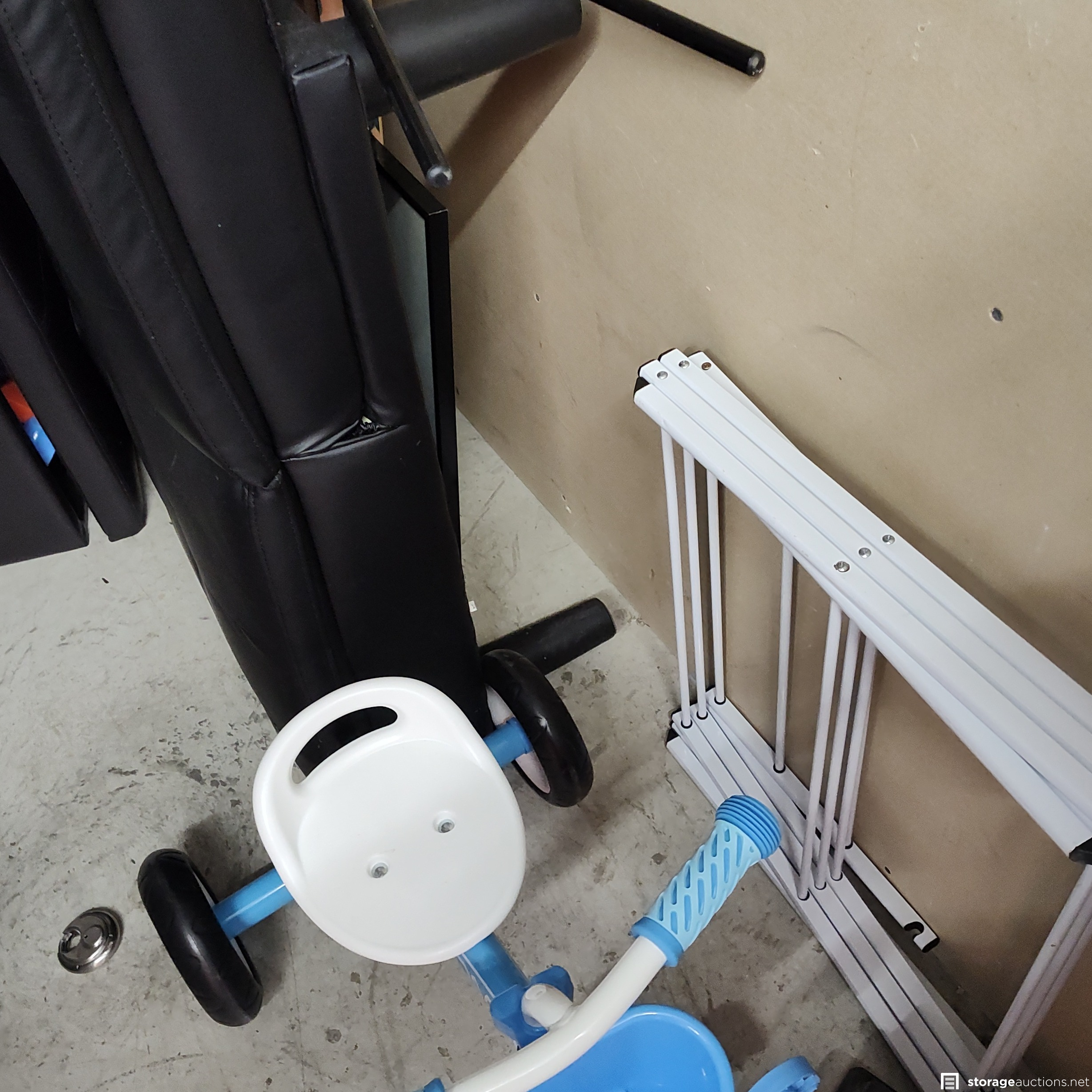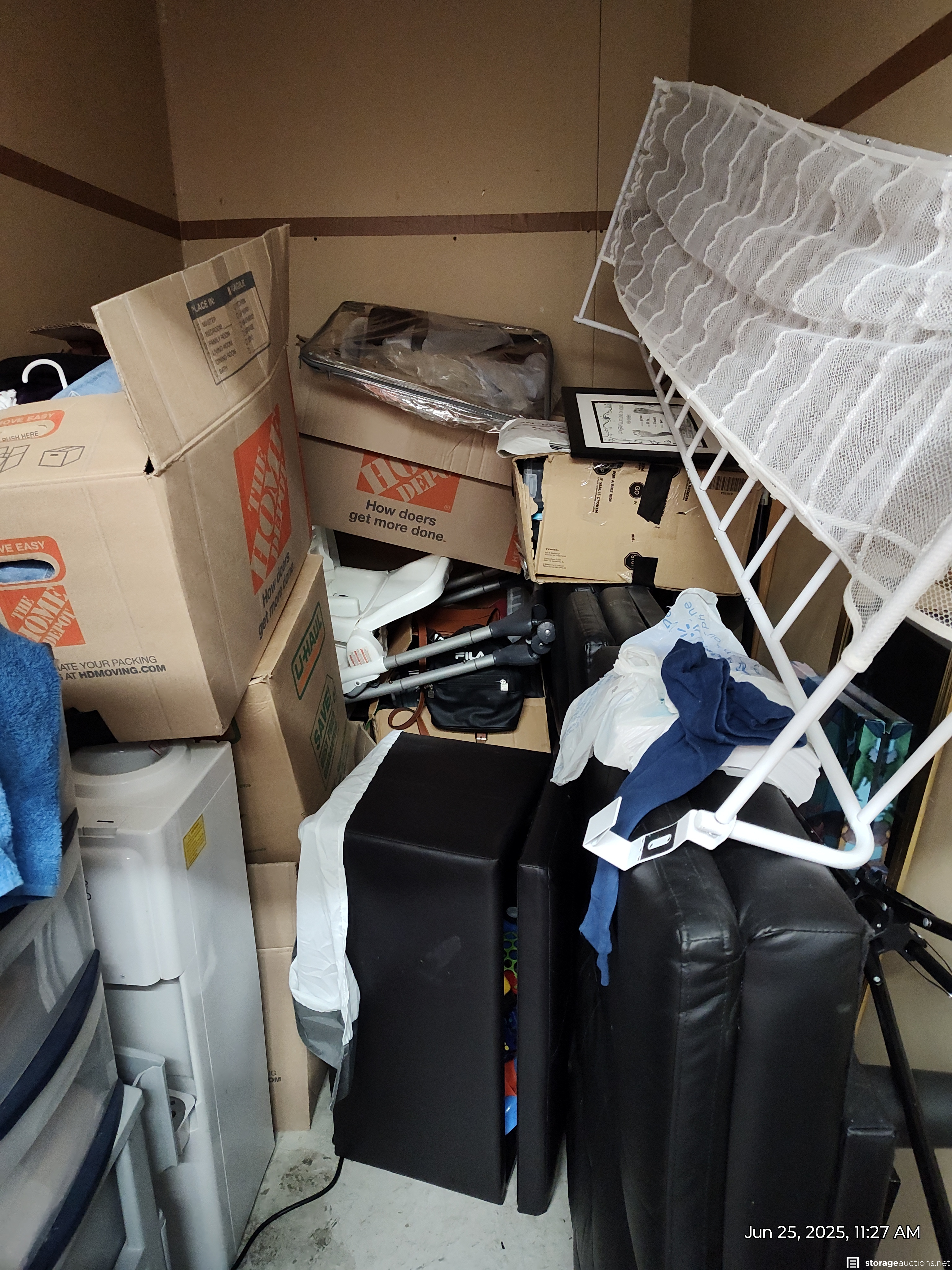 This unit has shelves, water cooler, stand, boxes, bike