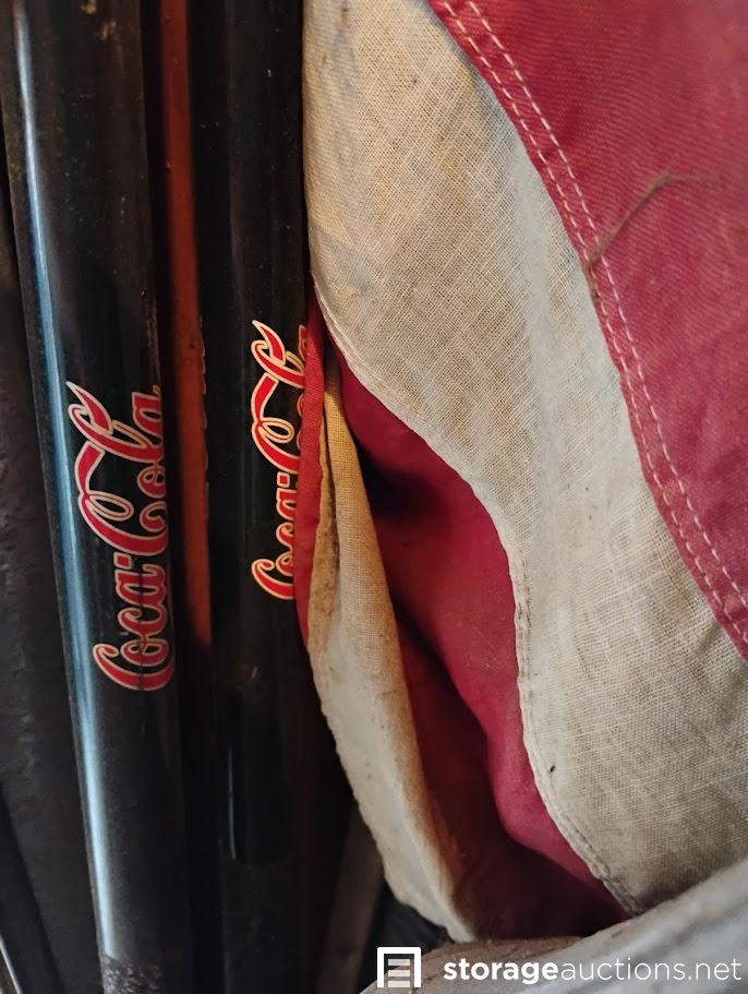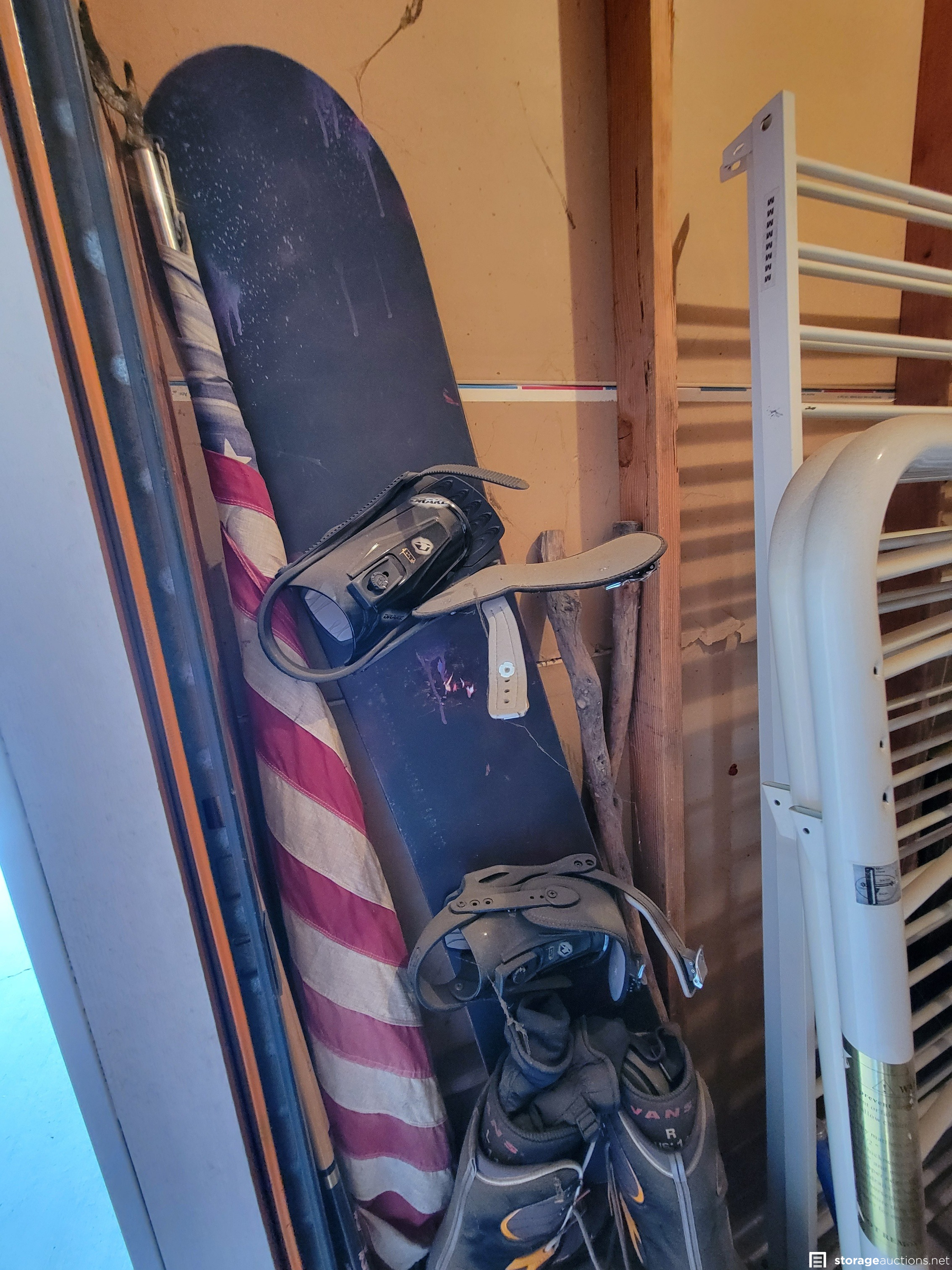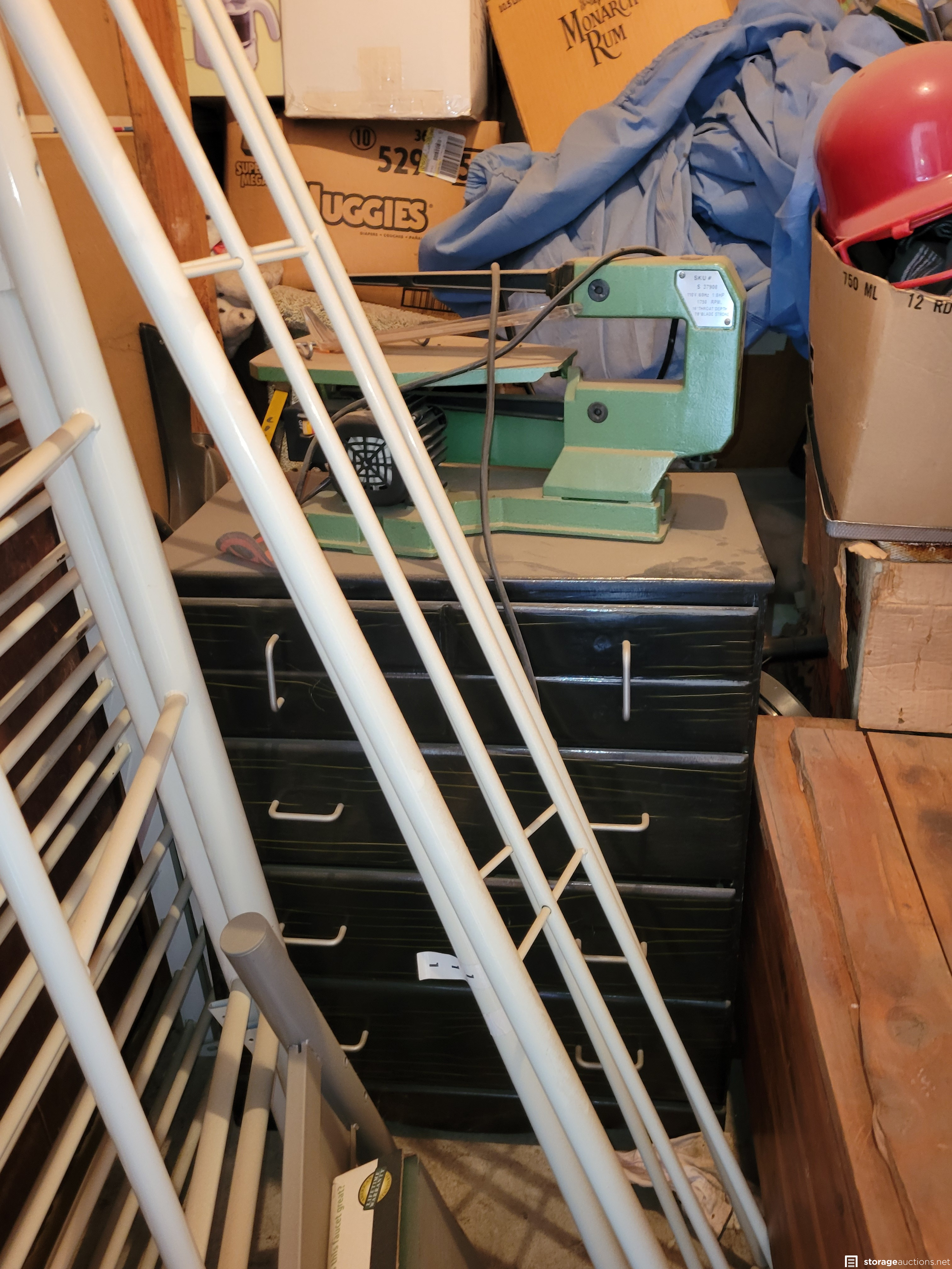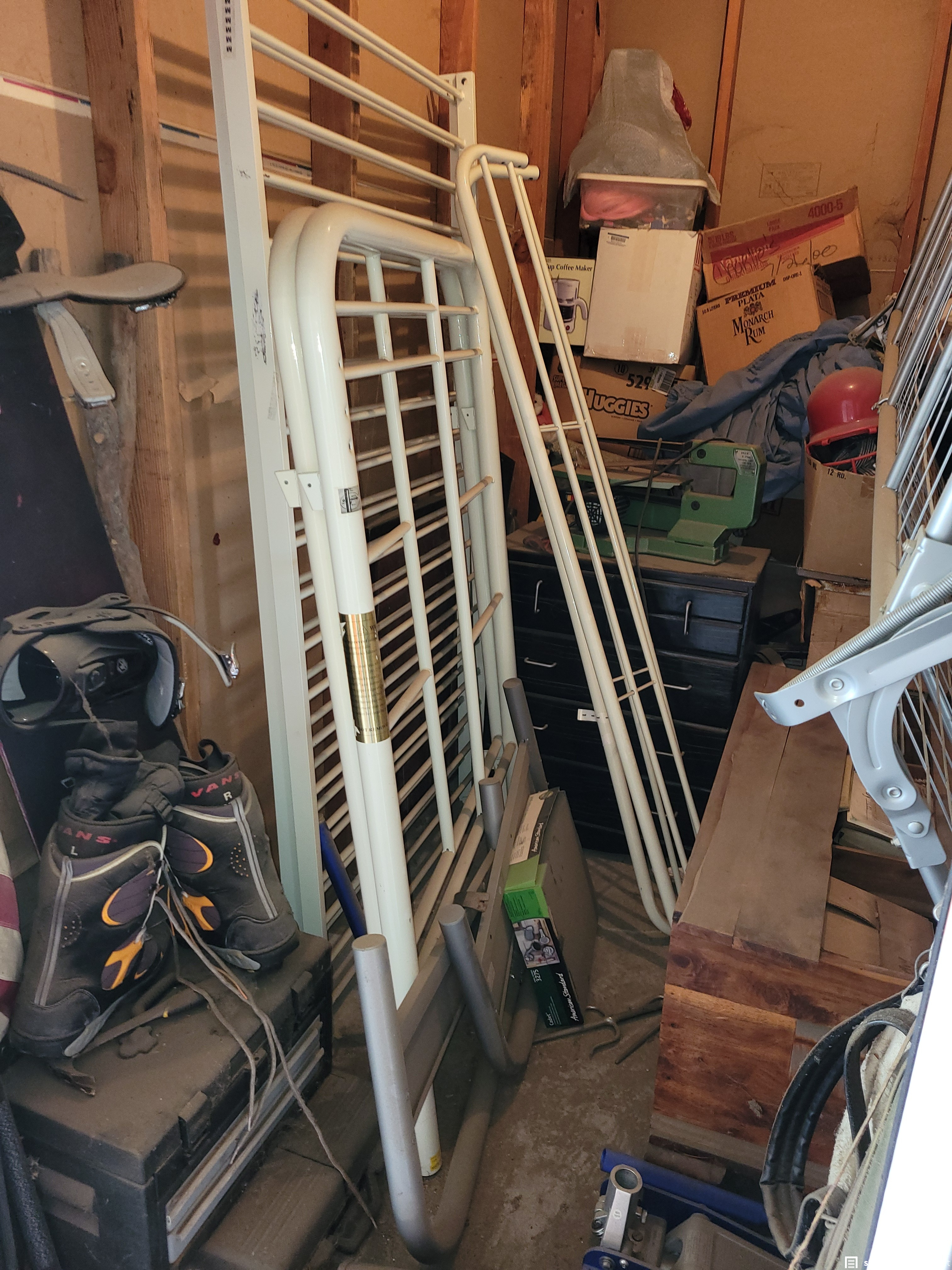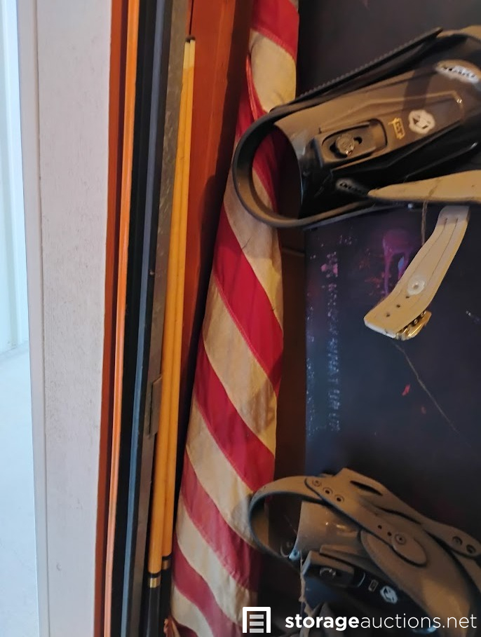 Pair of Coca-Cola pool cues sticks, United States flag, snowboard with bindings, pair of Vans snowboard boots, walking sticks?, hammer, tool chest, metal headboard, metal footboard, and metal bed frame(s), 16-inch scroll saw, small dresser, teddy bear?, cat tree, various boxes and small tote of belongings, Kitchen Gourmet 5-cup coffee maker, American Standard (3275)- faucet, pair of martial arts weapons: sai, batting helmet with face guard, wooden crate, US General floor jack, golf clubs and green-black golf bag, Craftsman metal toolbox.