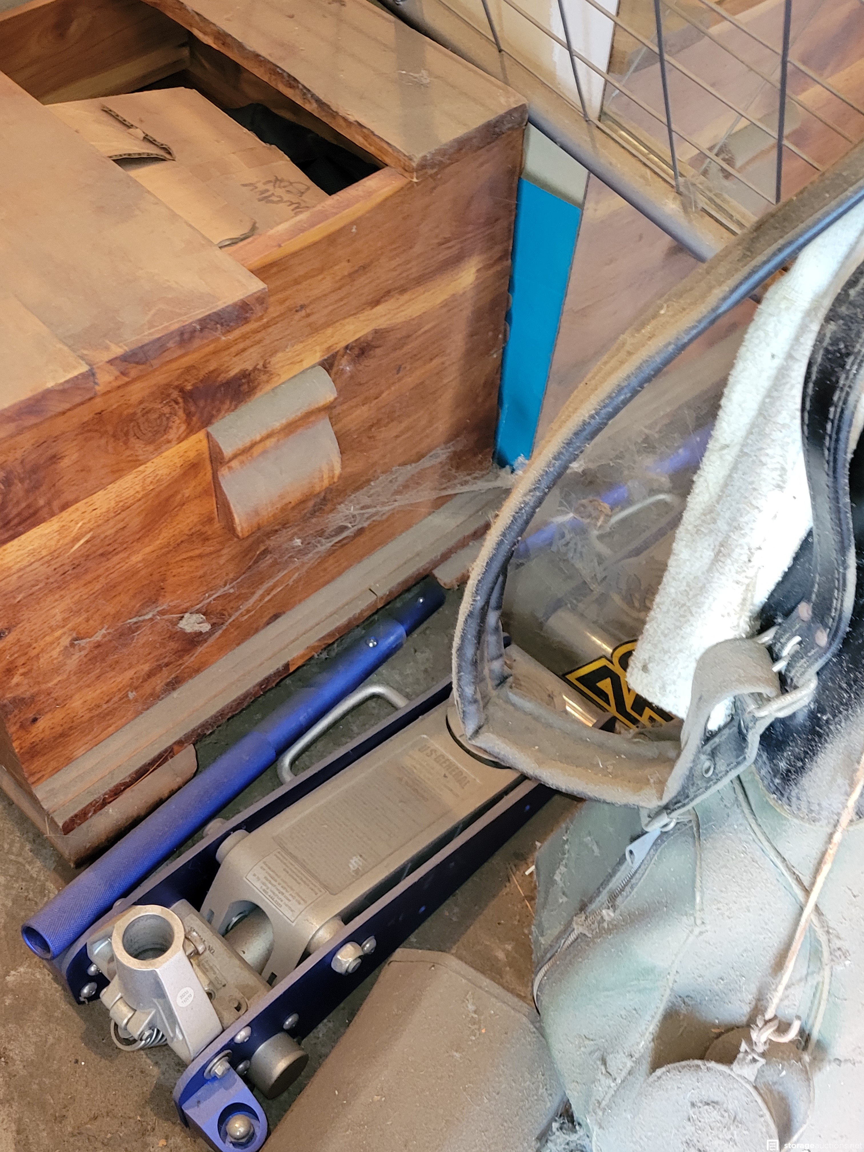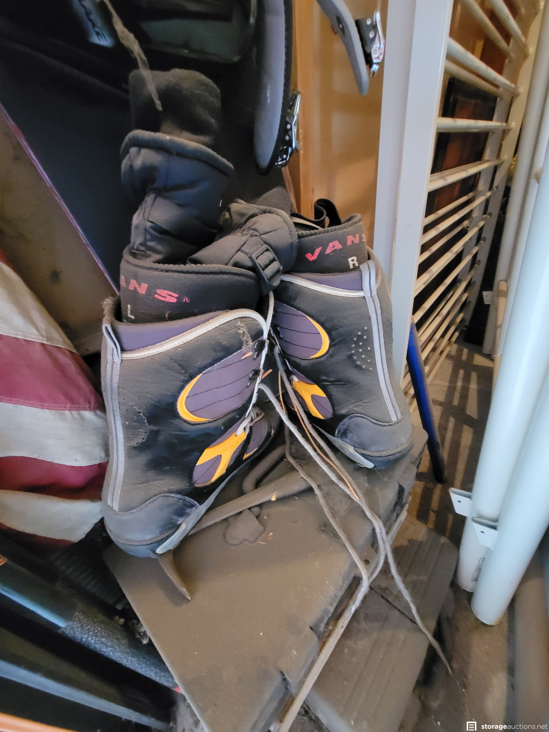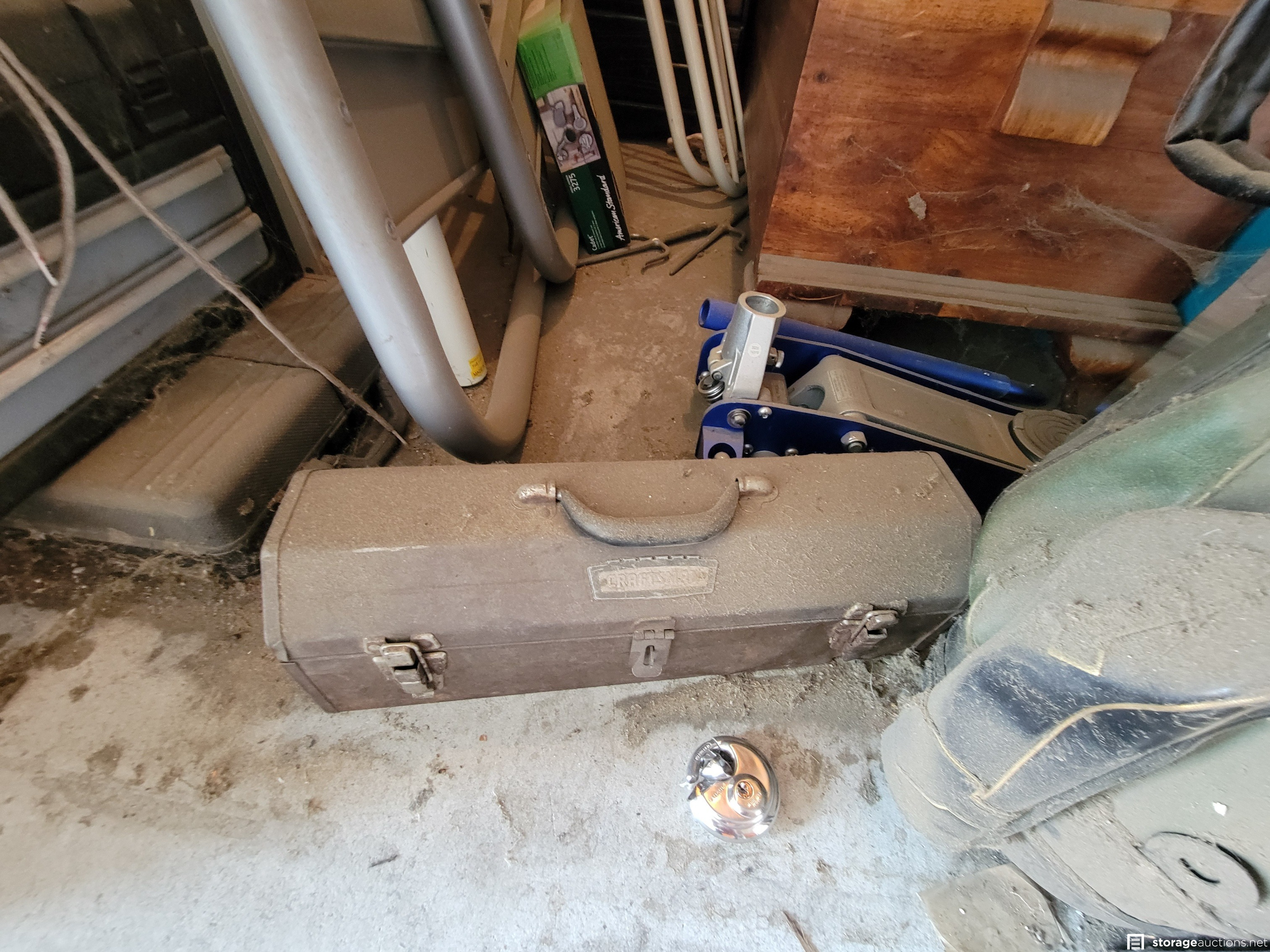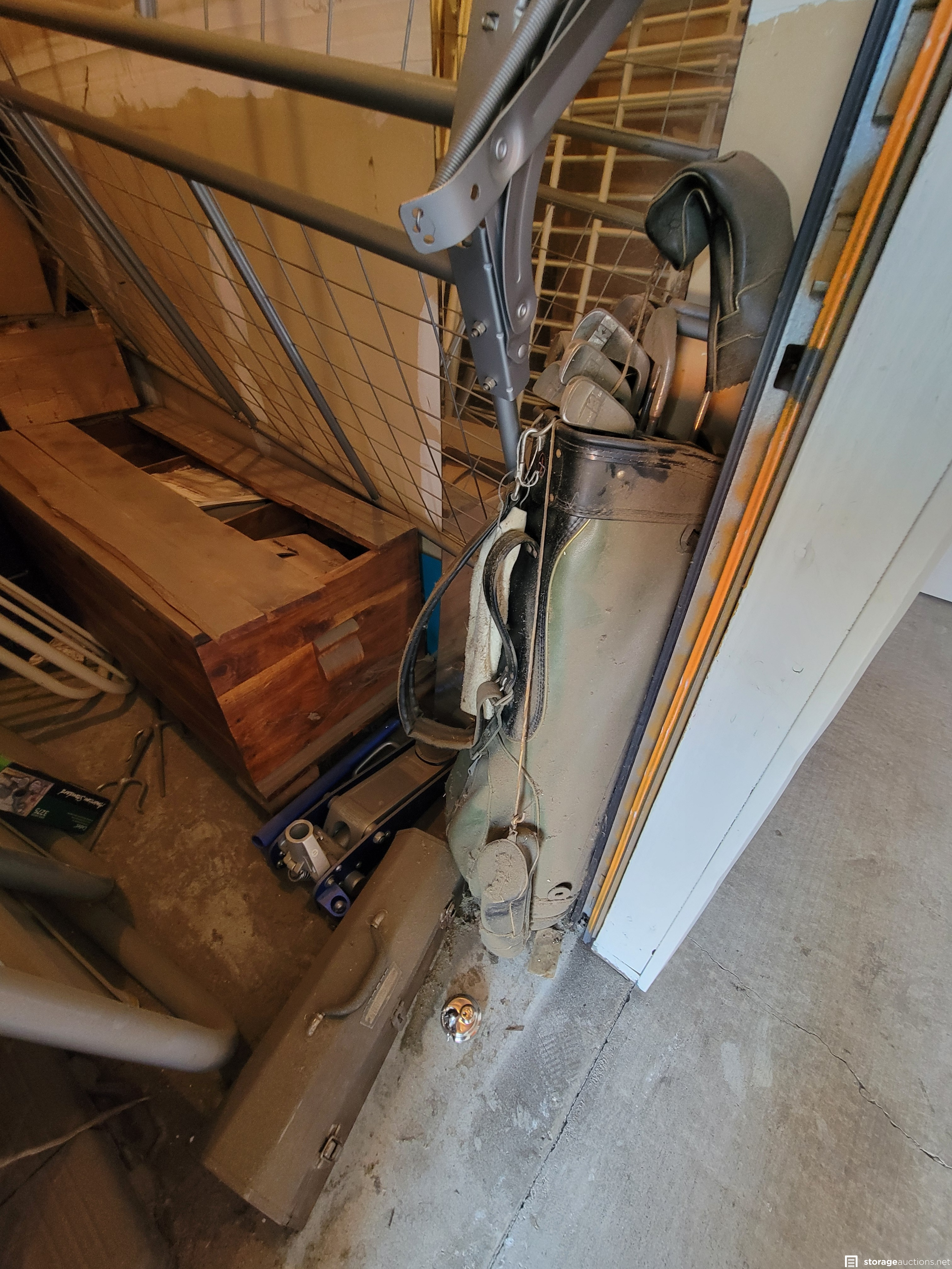 Pair of Coca-Cola pool cues sticks, United States flag, snowboard with bindings, pair of Vans snowboard boots, walking sticks?, hammer, tool chest, metal headboard, metal footboard, and metal bed frame(s), 16-inch scroll saw, small dresser, teddy bear?, cat tree, various boxes and small tote of belongings, Kitchen Gourmet 5-cup coffee maker, American Standard (3275)- faucet, pair of martial arts weapons: sai, batting helmet with face guard, wooden crate, US General floor jack, golf clubs and green-black golf bag, Craftsman metal toolbox.