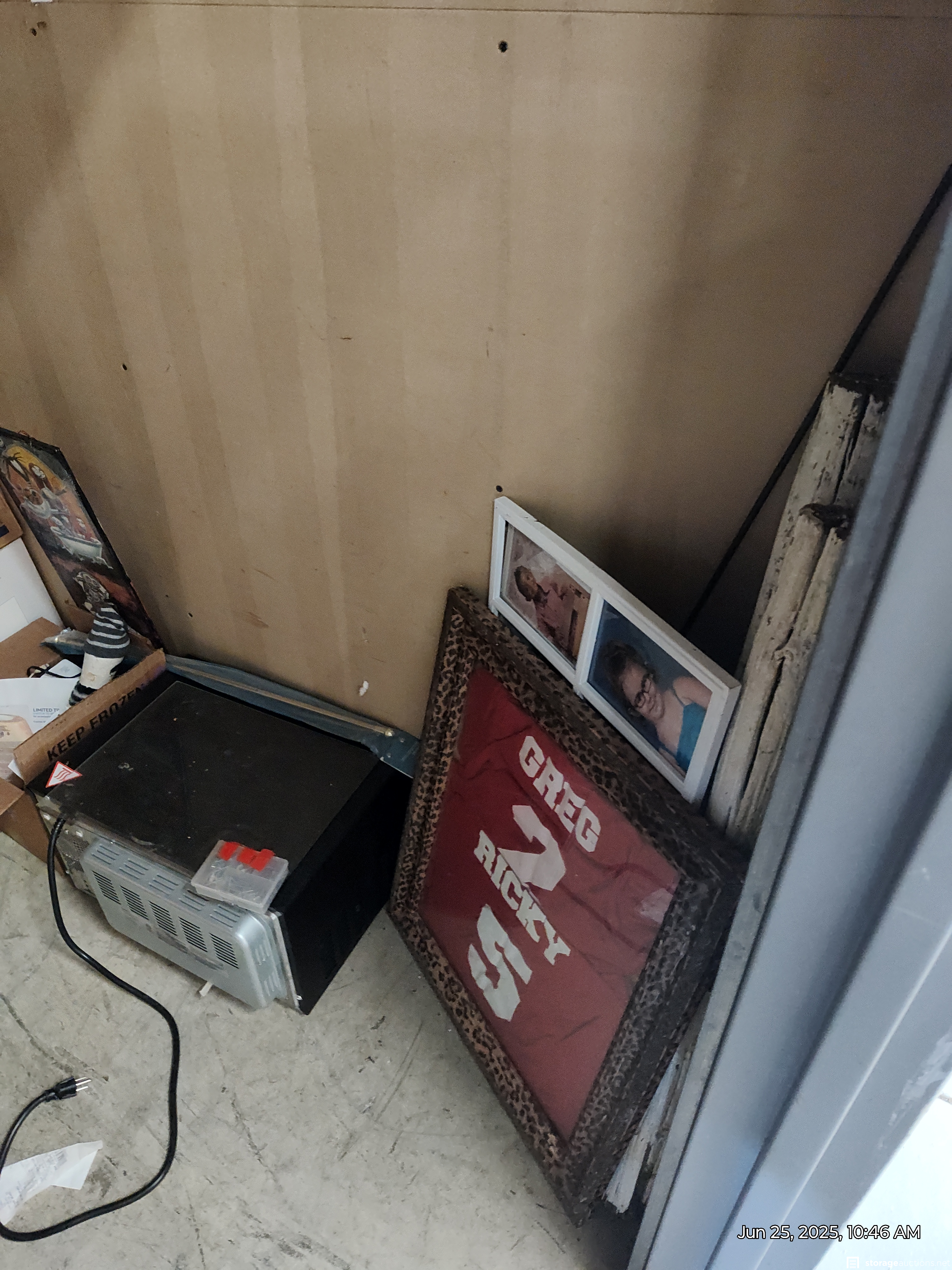 This unit has microwave, boxes, clothes, stand