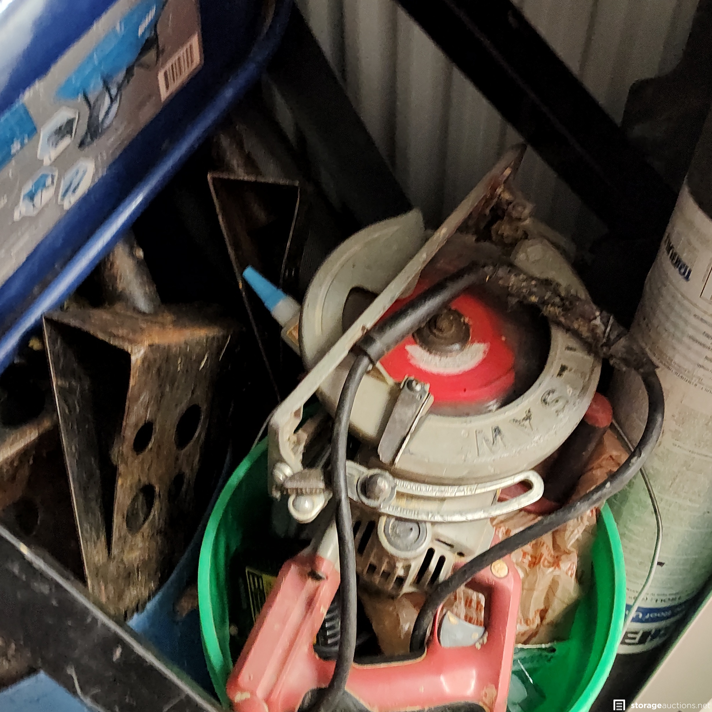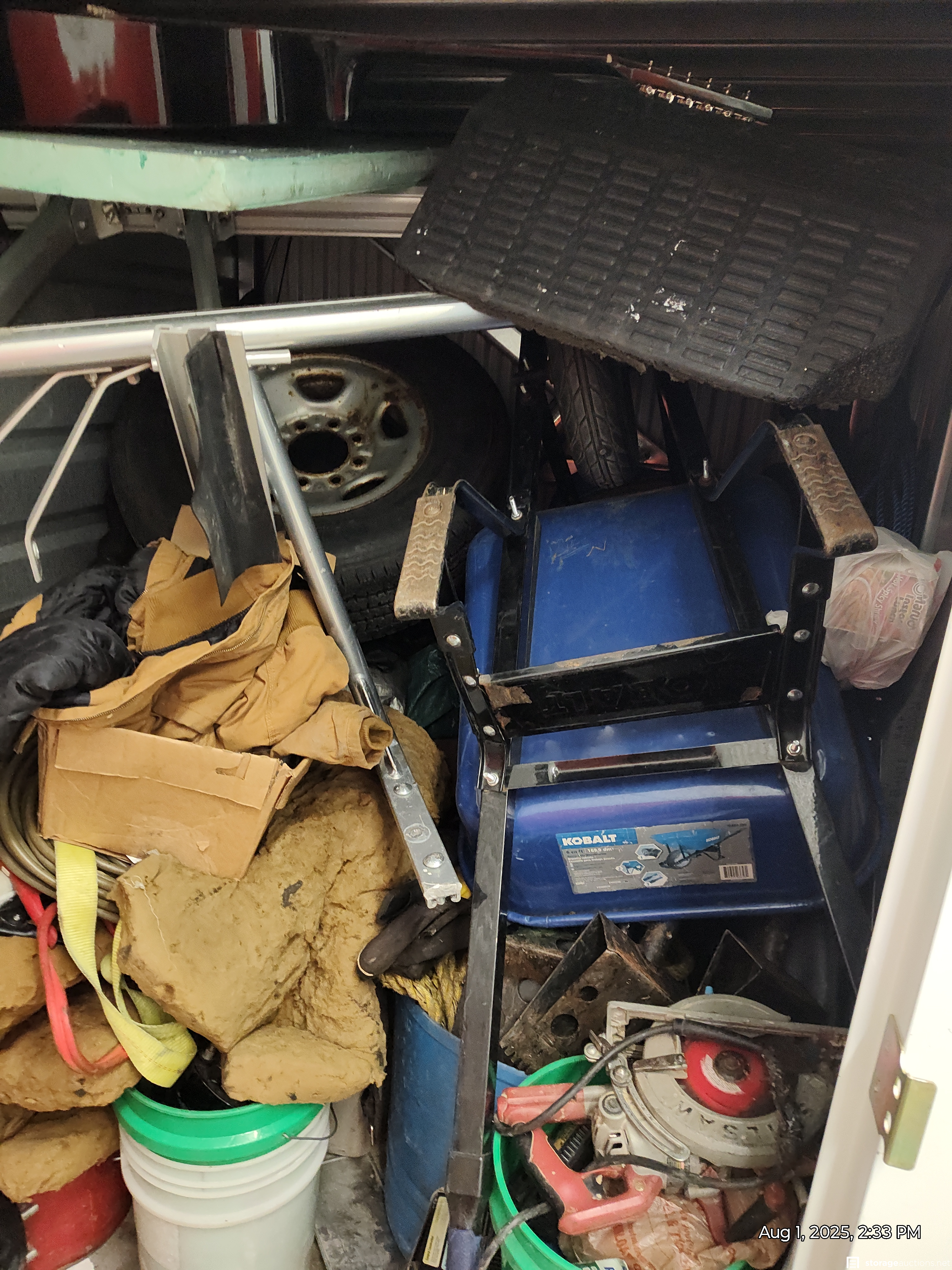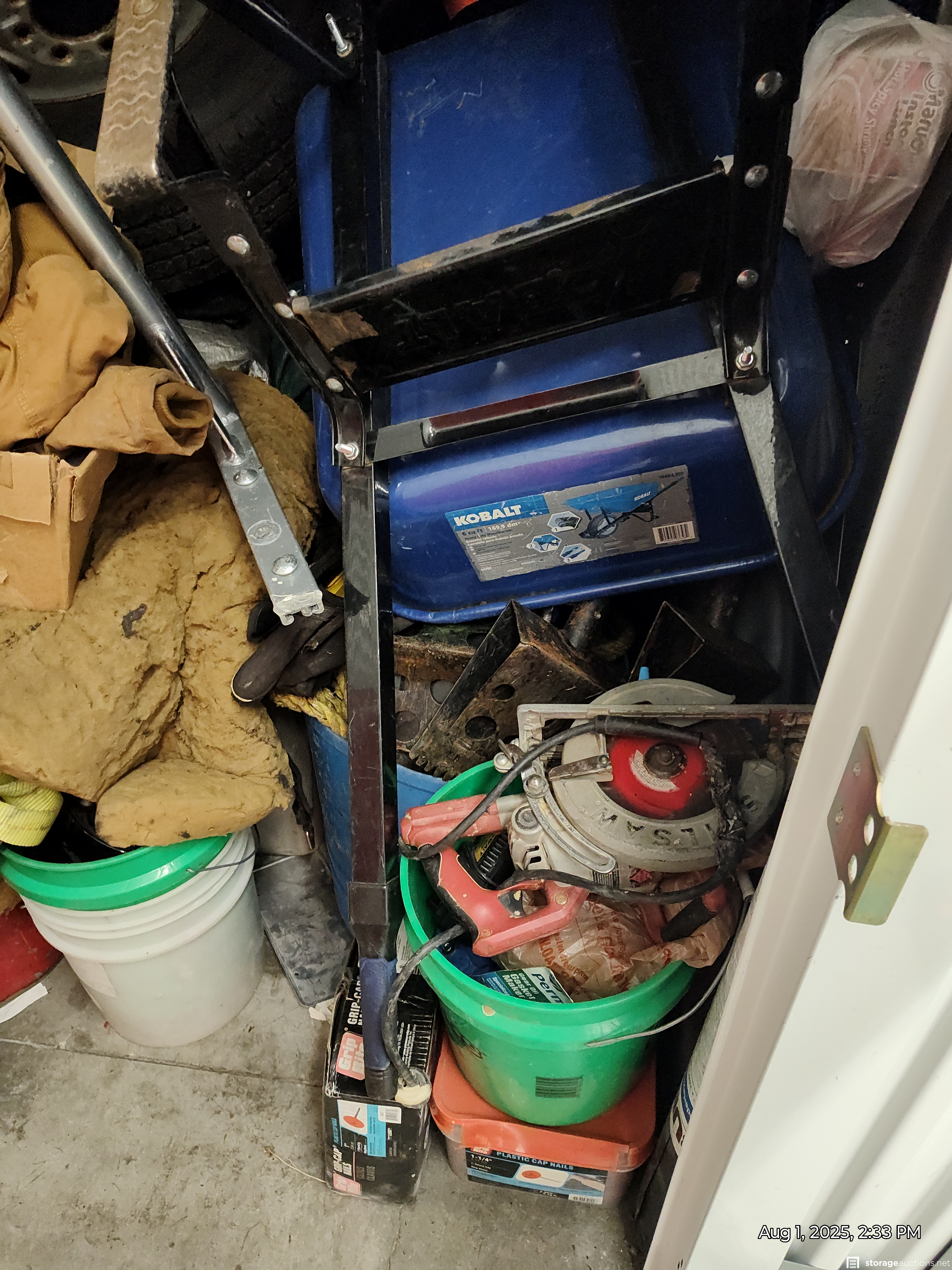 This unit has wheel barrel, tire, tools, buckets, boxes, totes
