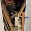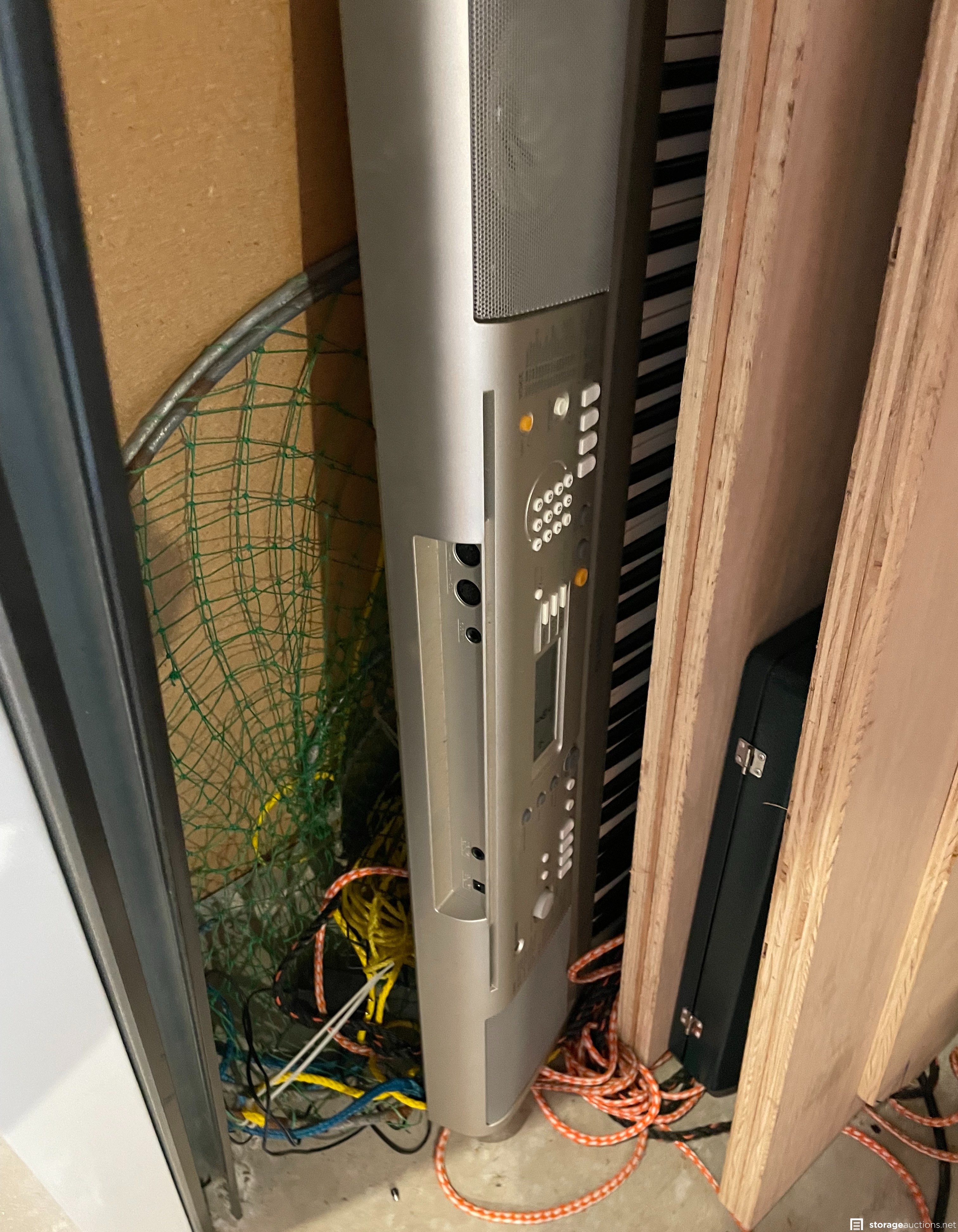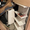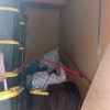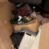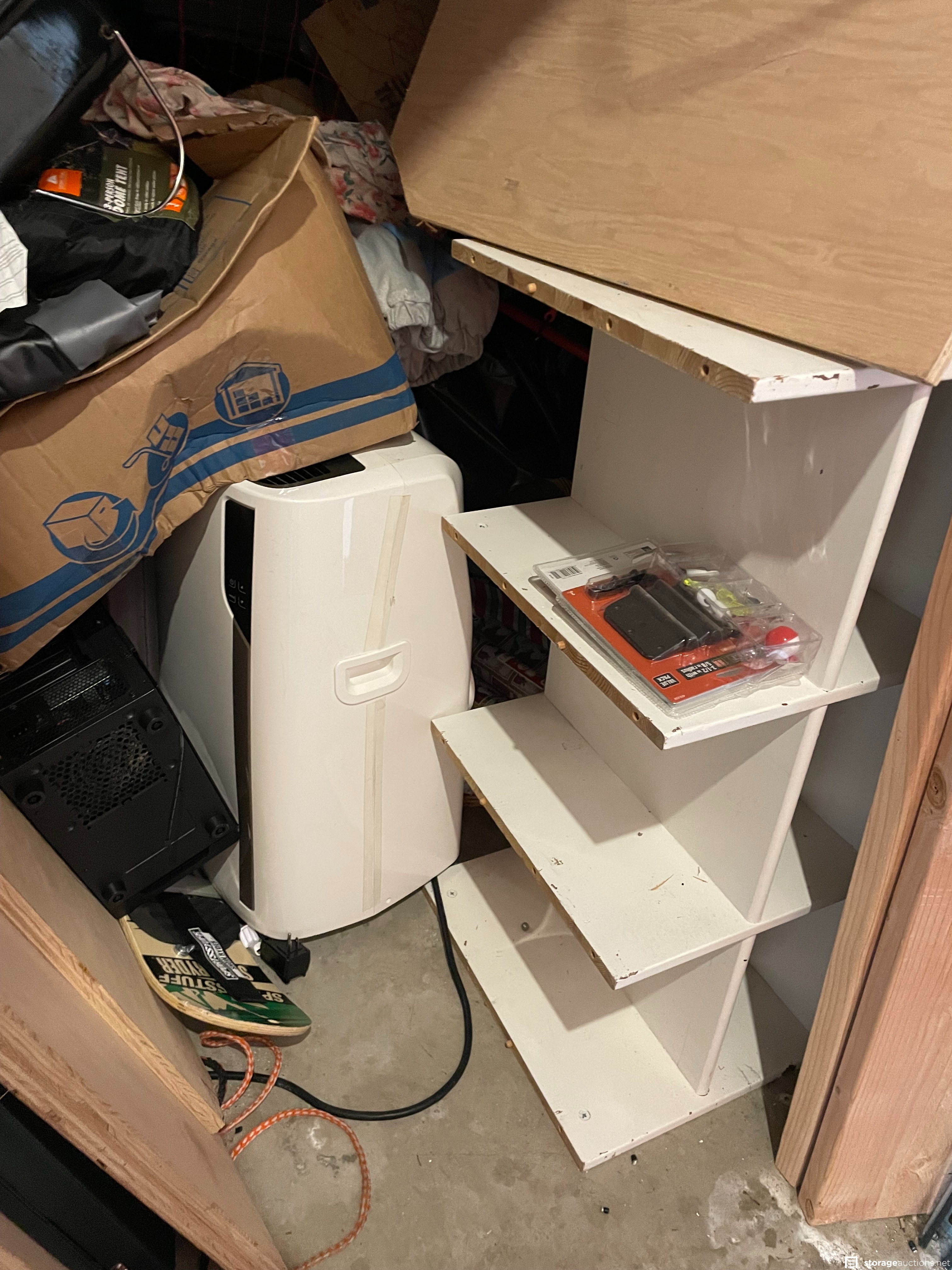 Totes, bags, fishing and camping equipment, electronics, AC unit, wood, shelving, clothes