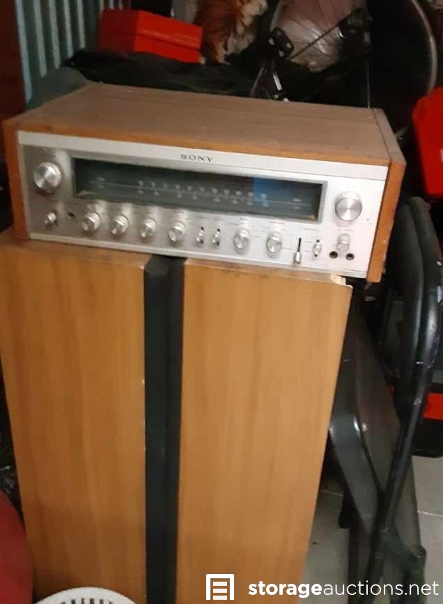 Bags, television, stereo, old radio, file cabinets, totes, luggage.