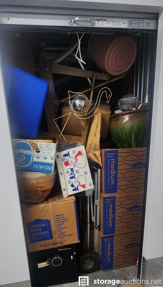 Additional Terms: 1. We reserve the right to refuse service to anyone at any time for any reason. Auctions are public, but do not guarantee that all the members of the public can participate. 2. TERMS: CASH ONLY on award of bid. All units must be paid for immediately no later than 5:00 PM on the day that Auction Bid is accepted. Winning bidder must appear in person with valid ID to pay and arrange for the clearance of the unit contents. 3. At discretion of Auctioneer, a minimum $200.00 refundable cleaning deposit per unit is required. CASH ONLY. The Storage Facility may charge a higher deposit on extra-large units. Do not use the facility's dumpsters. All items must be removed from the premises within 72 hours from winning bid. 4. Bidder agrees, understands and abides by all rules and regulations posted by the facility. The Bidder shall have access to the facility and the unit only during posted office hours 9:30 AM to 5:30 PM Monday through Saturday. 5. All units are sold AS IS. Storagetreasure.com, Facility Owner, Manager, or Agent makes no guarantees as to the contents of units. Box buyers: beware of the possibility that all boxes may be full of trash or empty. If so, they are still yours since unit is sold AS IS. Newspaper legal ad may not agree with the goods in the unit. Do not speculate on what may be in the units. In accordance to Federal laws we are restricted from selling Alcohol, Tobacco, Firearms, Explosives and Controlled Substances. You are required to surrender these items to the Storage Co. and they will be surrendered to the proper authorities. 6. All sales are final. No refunds, exchanges, or credits of any kind will be made. 7. All personal papers (birth certificates, tax records, pictures, yearbooks, checking account information, etc.) found in storage unit to be returned to the storage company. If any of these terms are unacceptable or offensive to you, do not participate in the sale. 8. Bidder shall be responsible for anyone who is acting on behalf of bidder in any capacity and shall indemnify the storage facility, its Owner, Managers, and Agents, and Employees, etc. for any action whatsoever that may be born in any manner and hereby waive any claims against the storage facility. This waiver and responsibility shall also include any personal property damage, property damage to the self storage facility, its representatives, employees, occupants and customers. 9. The storage company is not responsible for losses due to fire, theft, vandalism, mysterious disappearances or any other events. Bidder shall provide insurance for losses incurred before, during and after sale. 10. The storage company reserves the right to bid. 11. Storage Company's liability for undeliverable units is limited to monies collected for purchase of unit(s) and cleaning deposit(s) only. The Storage Company will make all reasonable efforts to deliver unit or units to successful bidders. Bidder does not own these items until they are totally removed from the facility. The facility can claim items at any time without notice until they are totally removed. Any items that have been abandoned after 72 hours will be construed as abandoned property. Storage Company reserves the right to refuse to rent Storage Units to Auction Buyers. Bidder will not be refunded bid price and/or cleaning deposit. 12. The ultimate responsibility of the unit being emptied and cleaned is that of the buyer. The buyer is responsible no matter what arrangements have been made to have the unit emptied. Legal action will be taken against the buyer, for costs and/or time involved in cleaning any debris left behind. The bidder hereby agrees that the terms and conditions above as part of the Auction Terms & Conditions.